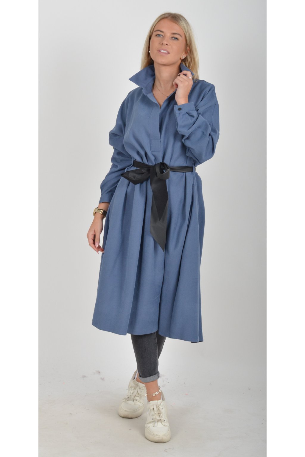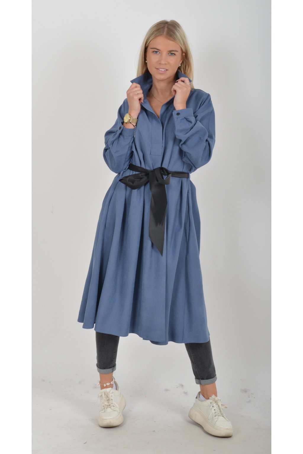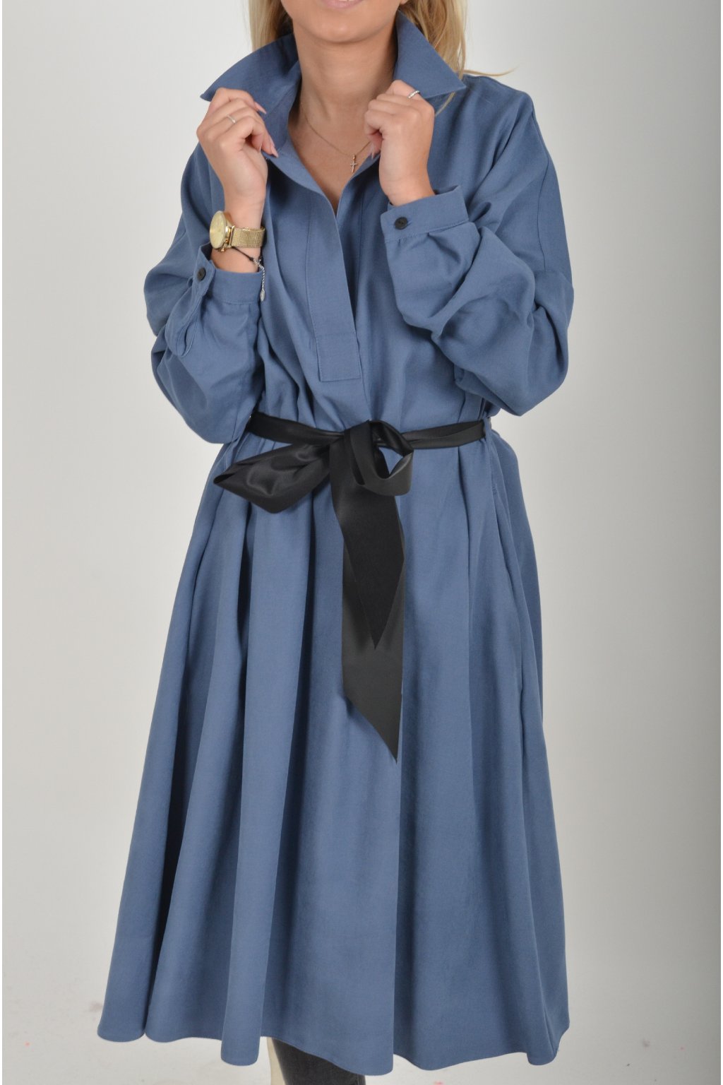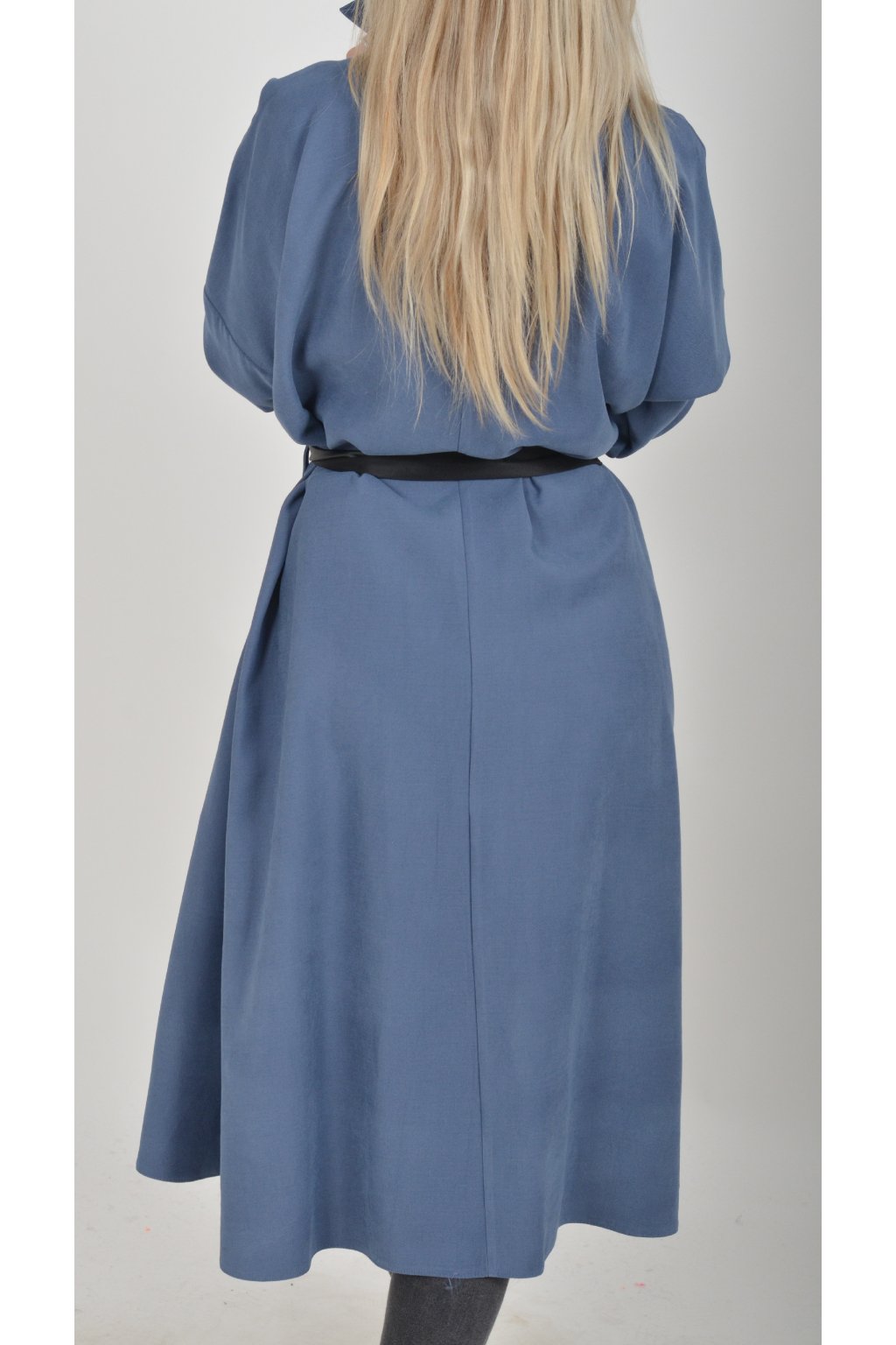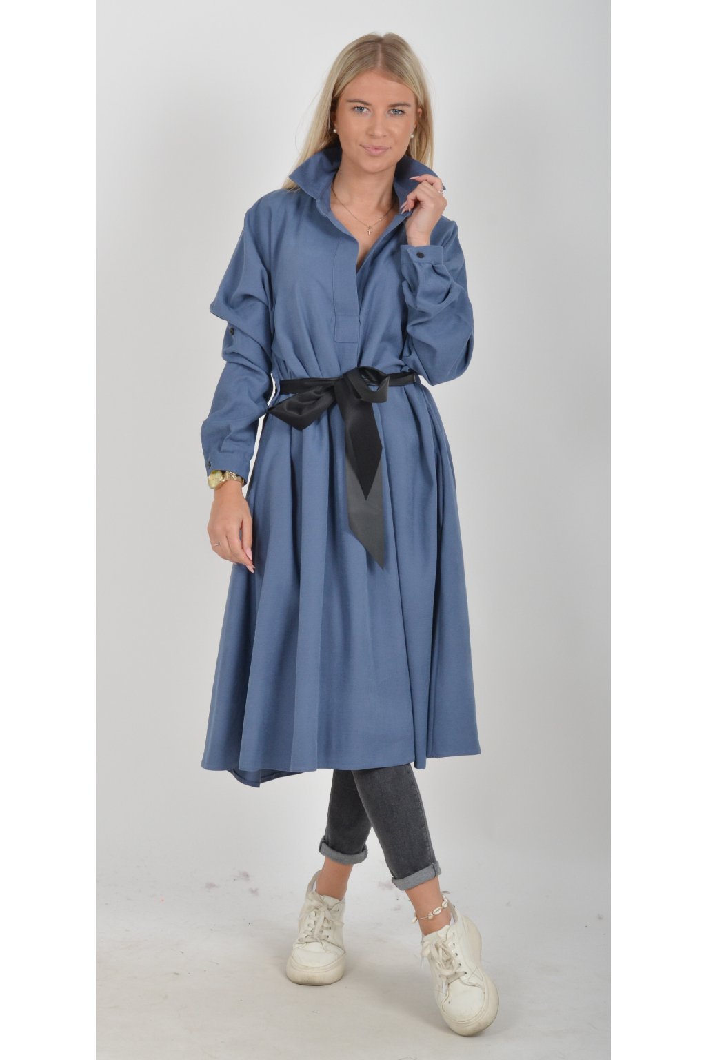 Jednou za dámu, jednou jen tak ven, tyto šaty splní oboje. Mají košilový áčkový střih s rozevlátou sukní, která je v zadní části mírně delší. Šaty mají na bocích kapsy. Rukávy jsou dlouhé, ale dají se zkrátit na knoflíček. Výrazným doplňkem šatů je pásek s imitací kůže, který můžete jakkoliv vázat a kombinovat. K šatům doporučujeme ozdobnou brož nebo šperky z naší kolekce.