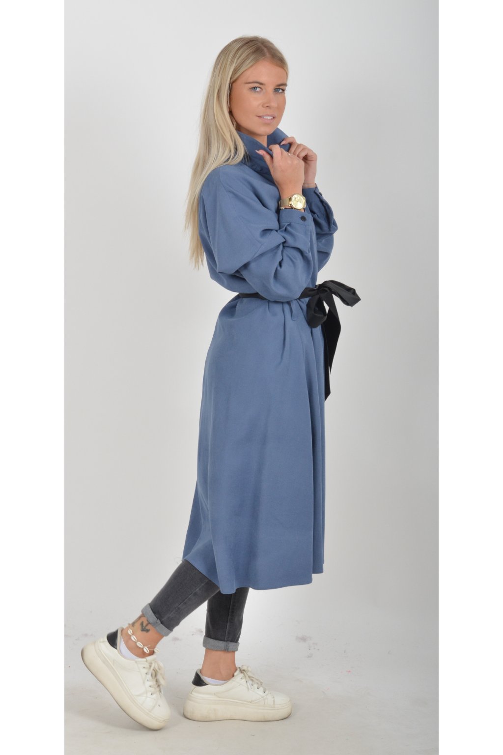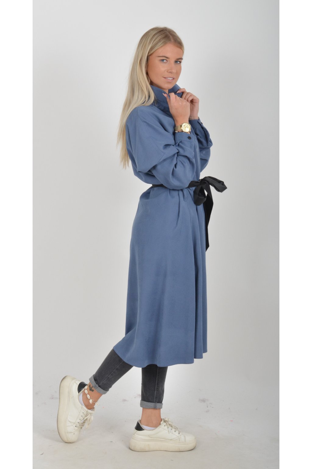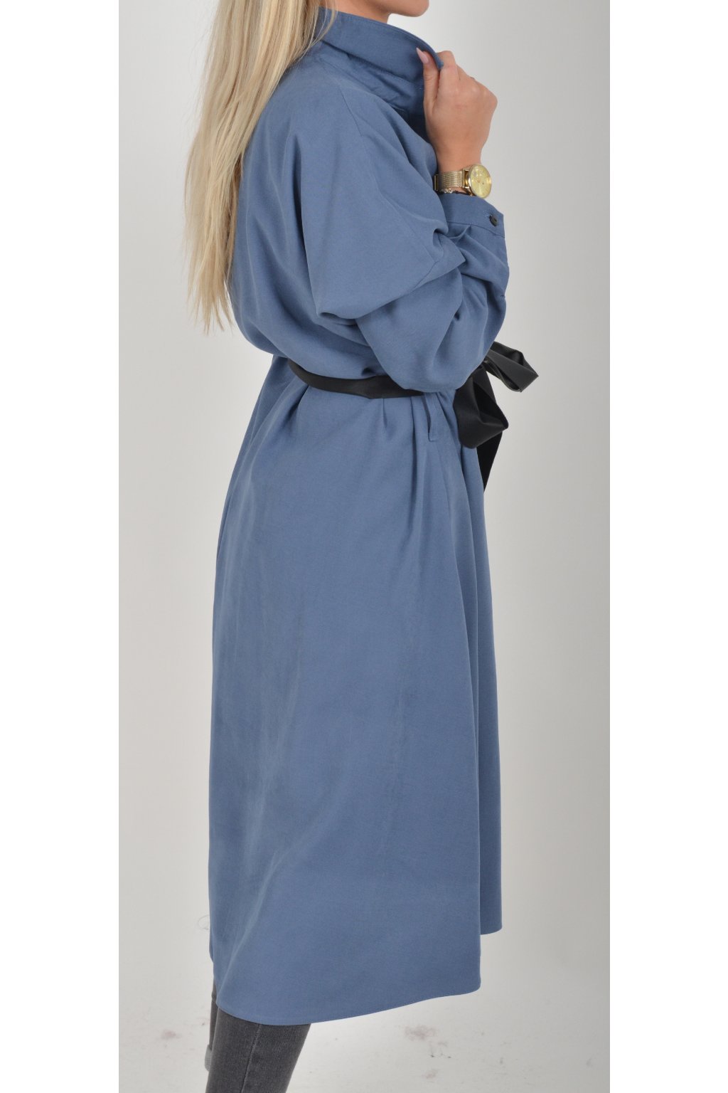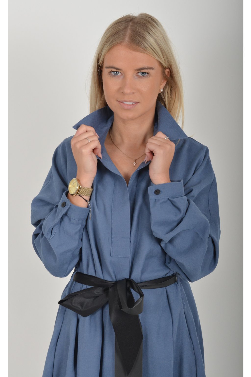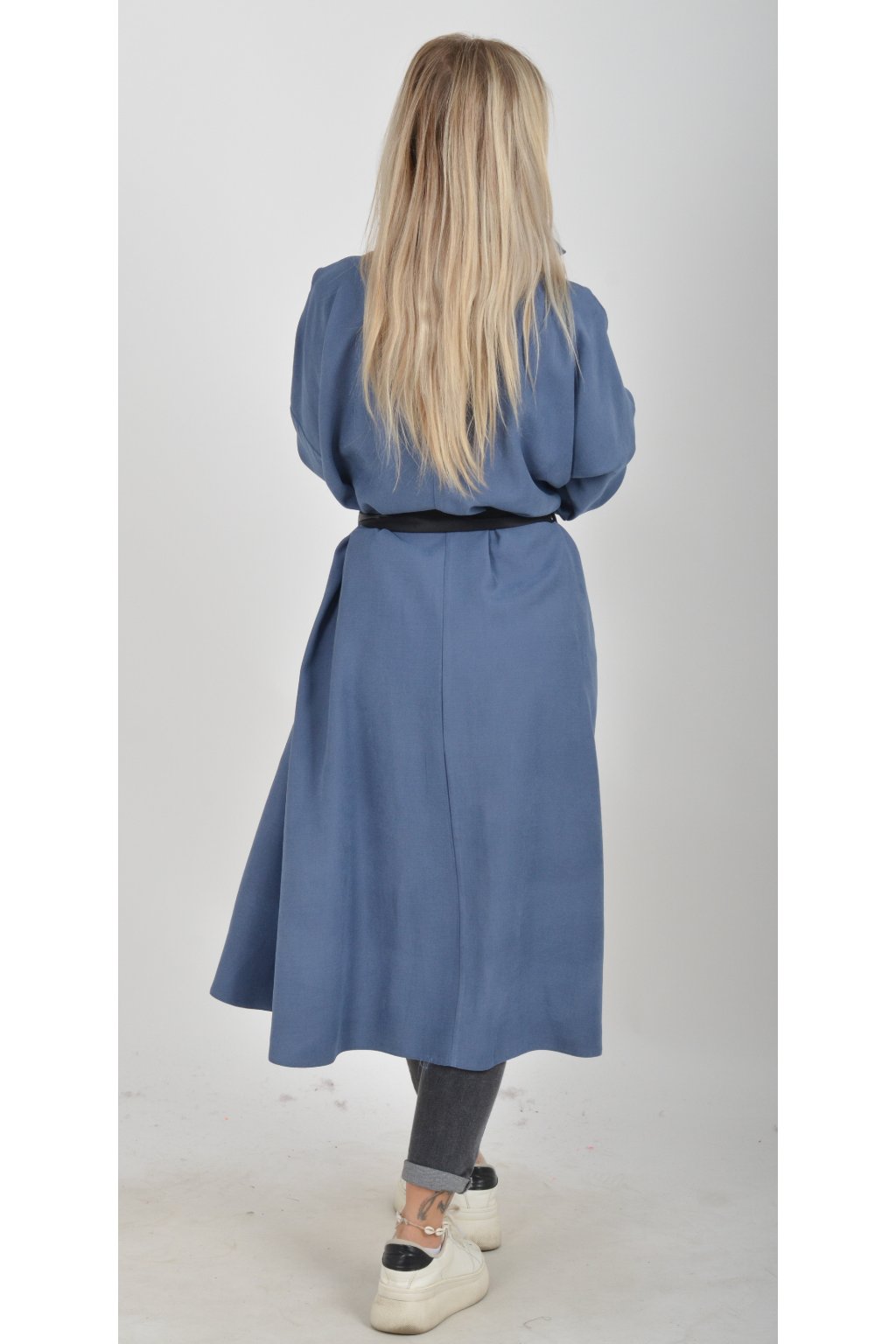 Jednou za dámu, jednou jen tak ven, tyto šaty splní oboje. Mají košilový áčkový střih s rozevlátou sukní, která je v zadní části mírně delší. Šaty mají na bocích kapsy. Rukávy jsou dlouhé, ale dají se zkrátit na knoflíček. Výrazným doplňkem šatů je pásek s imitací kůže, který můžete jakkoliv vázat a kombinovat. K šatům doporučujeme ozdobnou brož nebo šperky z naší kolekce.