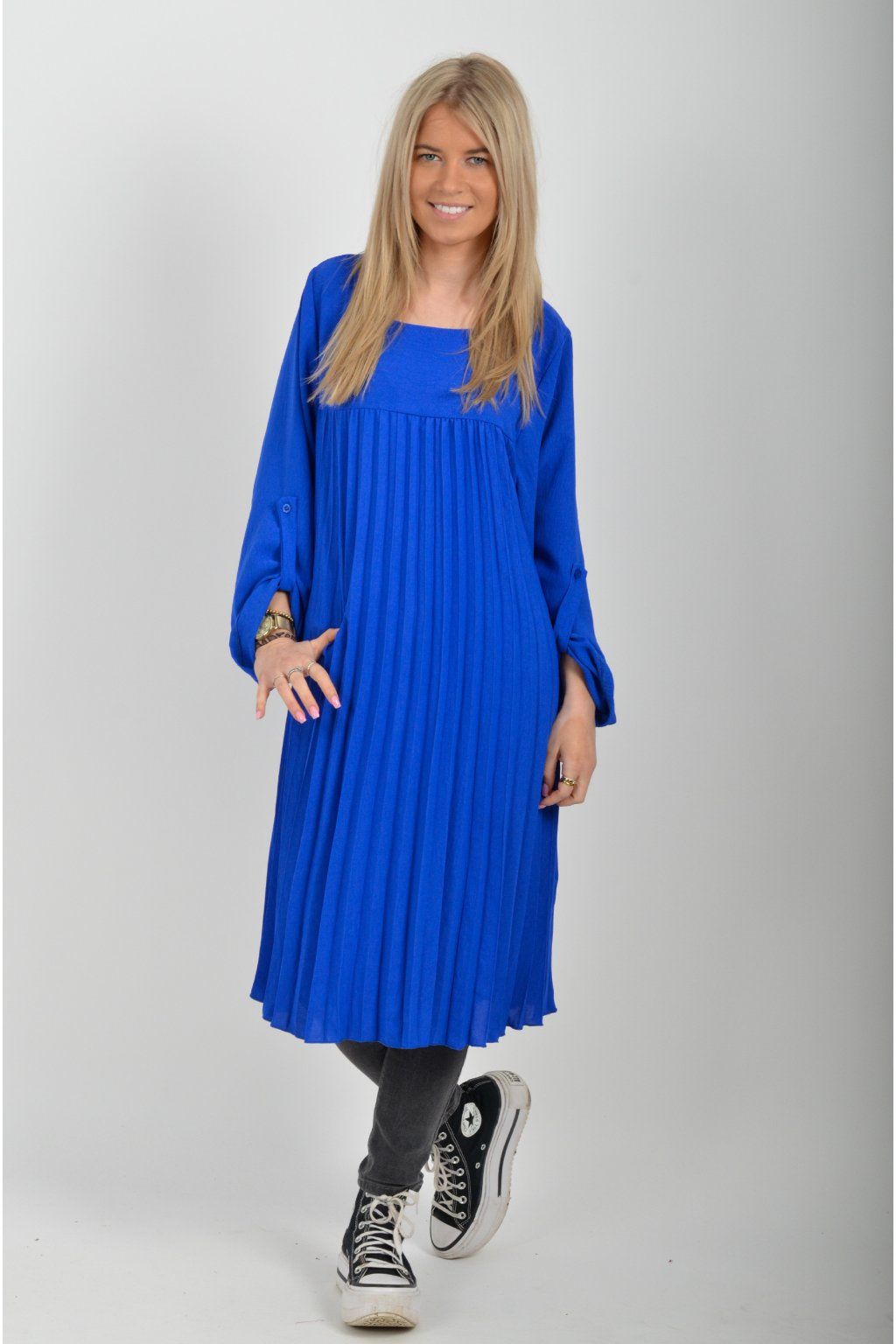 Jednobarevné plisované šaty vyrobené z odlehčeného materiálu. Šaty mají áčkový střih na bocích kapsy a dlouhý rukáv, který lze pomocí knoflíku jednoduše zkrátit.