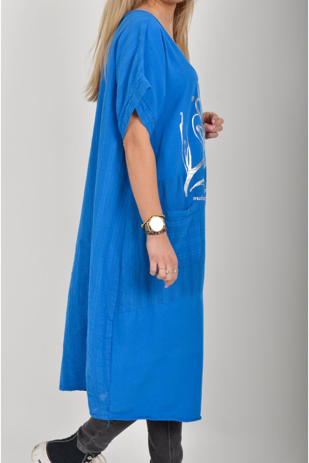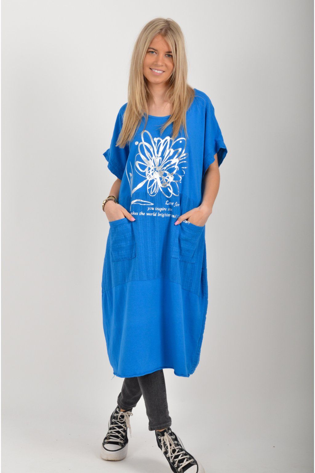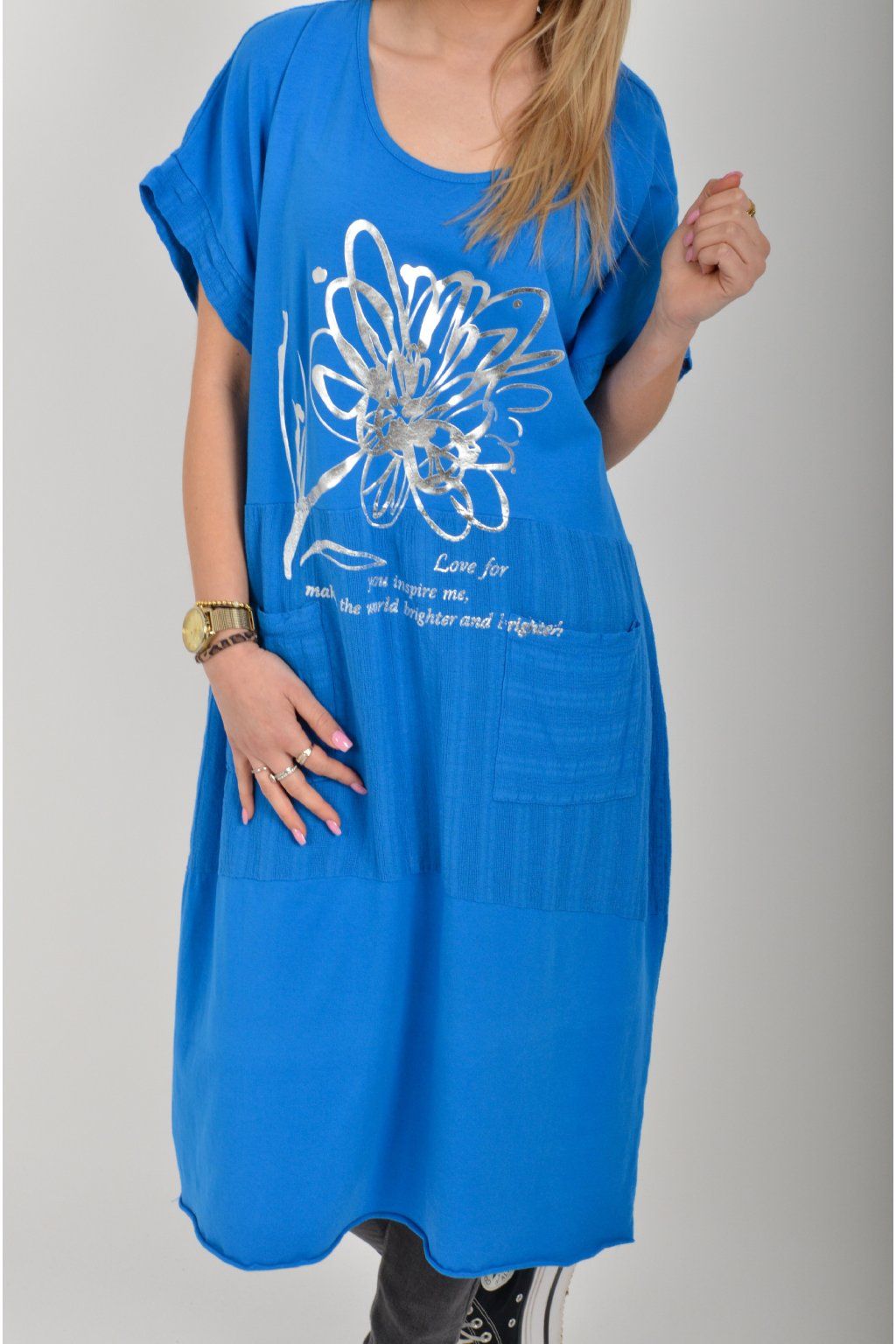 Zajímavé bavlněné šaty se stříbrným potiskem a kapsami v přední části.. Mají balónový střih a krátké rukávy. Jsou vyrobené z velice příjemného a pružného materiálu.