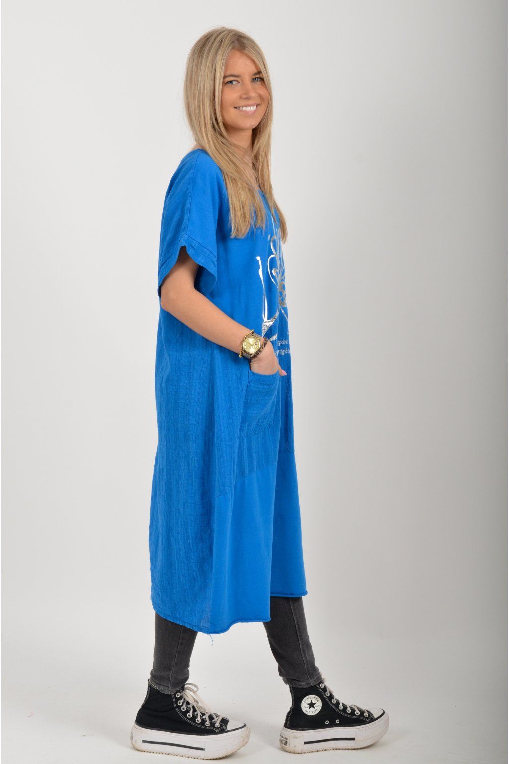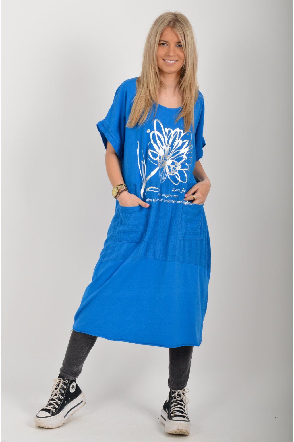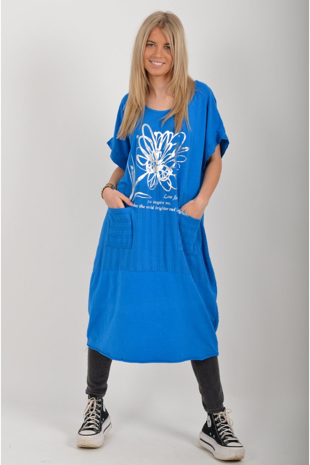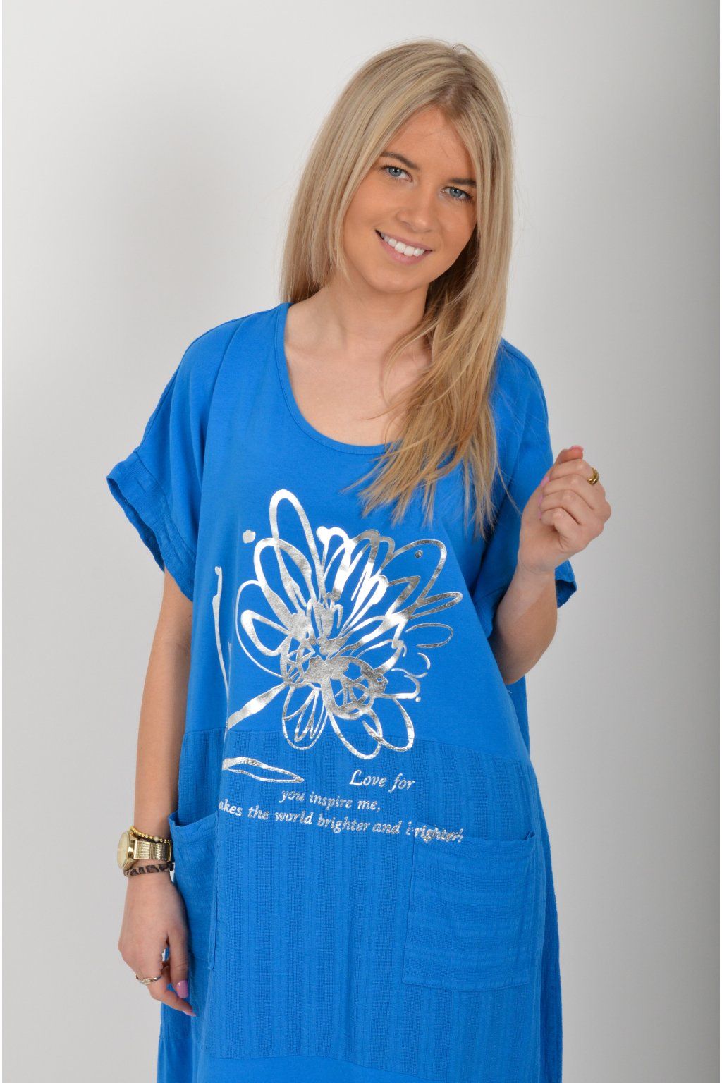 Zajímavé bavlněné šaty se stříbrným potiskem a kapsami v přední části.. Mají balónový střih a krátké rukávy. Jsou vyrobené z velice příjemného a pružného materiálu.
