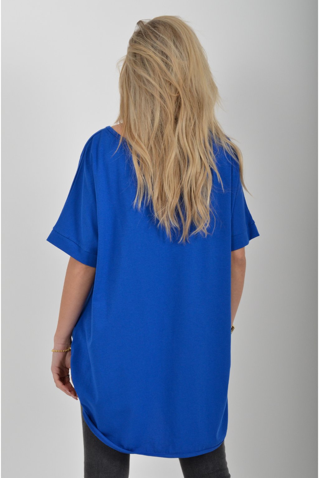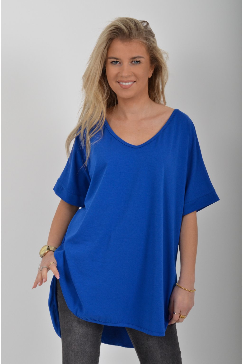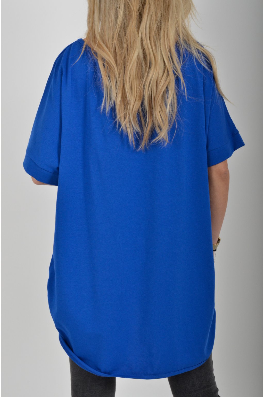 Jednobarevné dlouhé tričko s krátkým rukávem a rozparky na bocích. Zadní část trička je delší než přední. Je vyrobené z velice lehké, měkké a příjemné bavlny.
