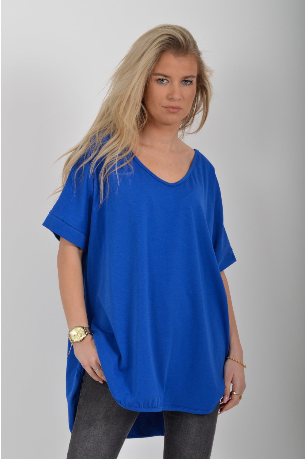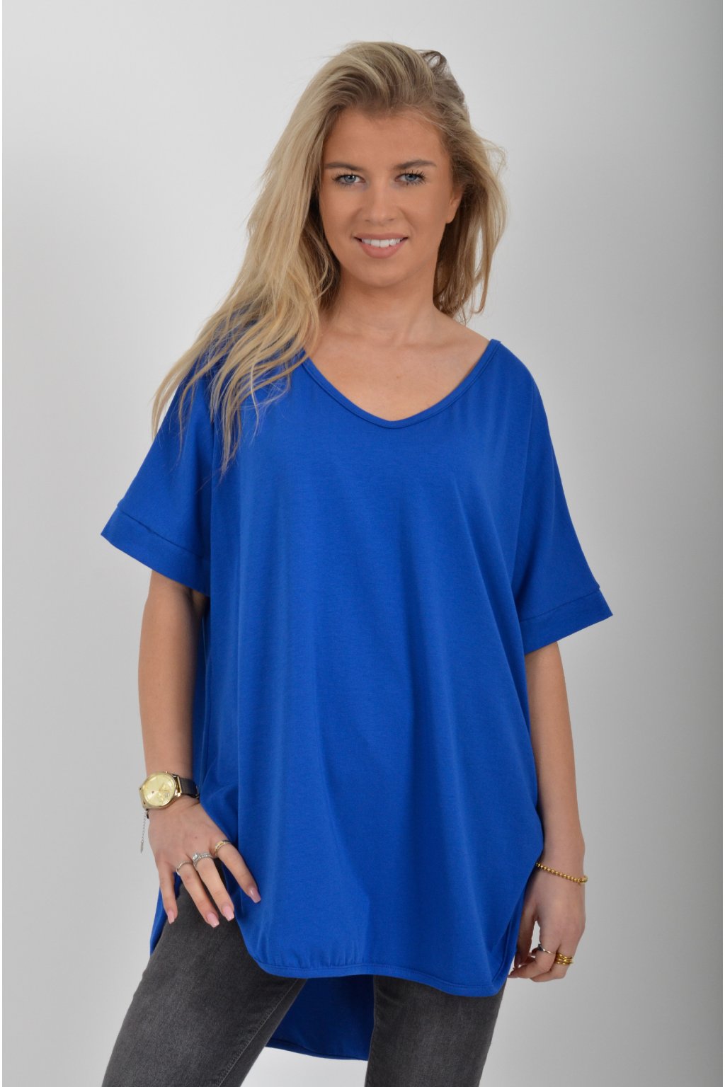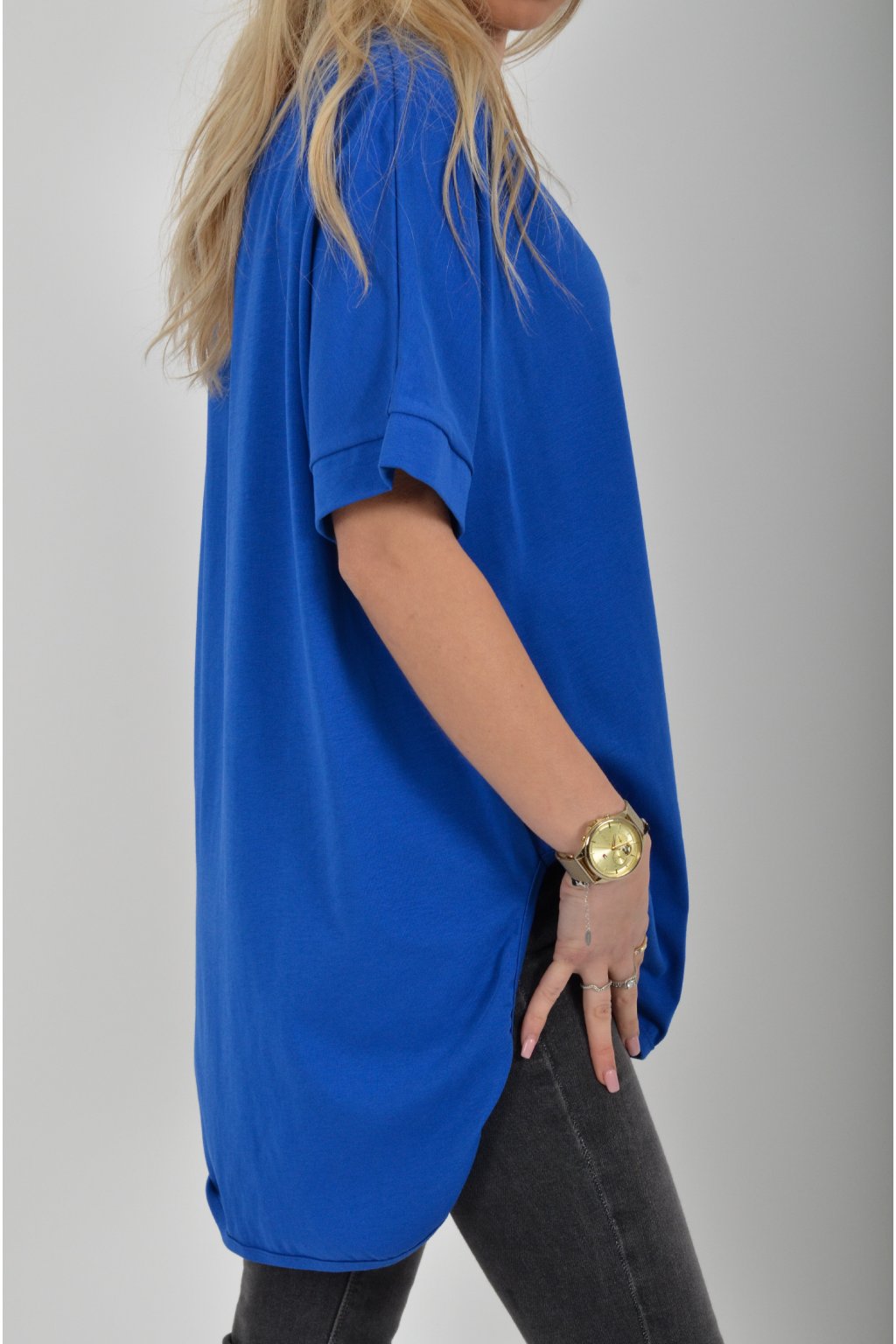 Jednobarevné dlouhé tričko s krátkým rukávem a rozparky na bocích. Zadní část trička je delší než přední. Je vyrobené z velice lehké, měkké a příjemné bavlny.