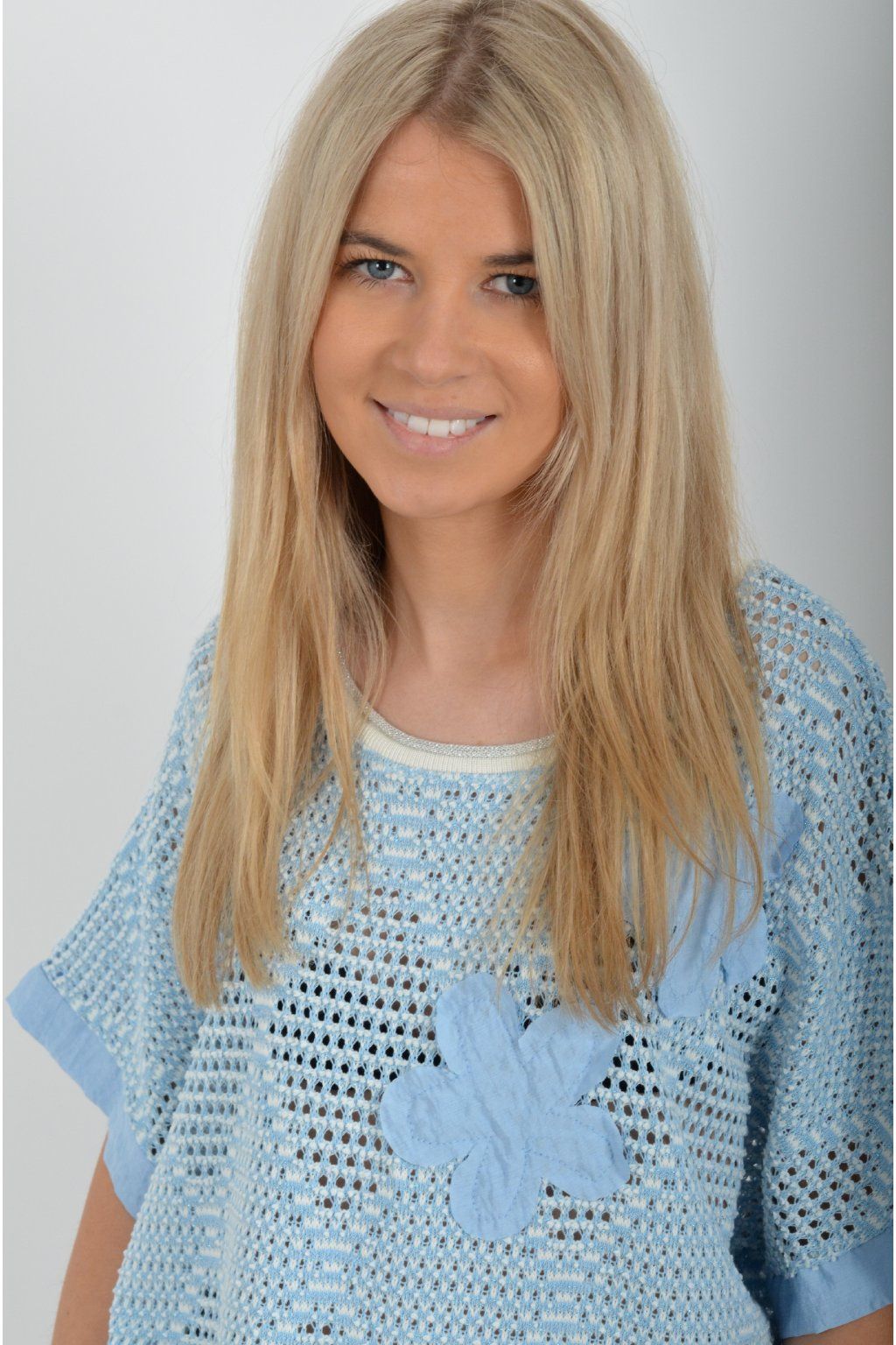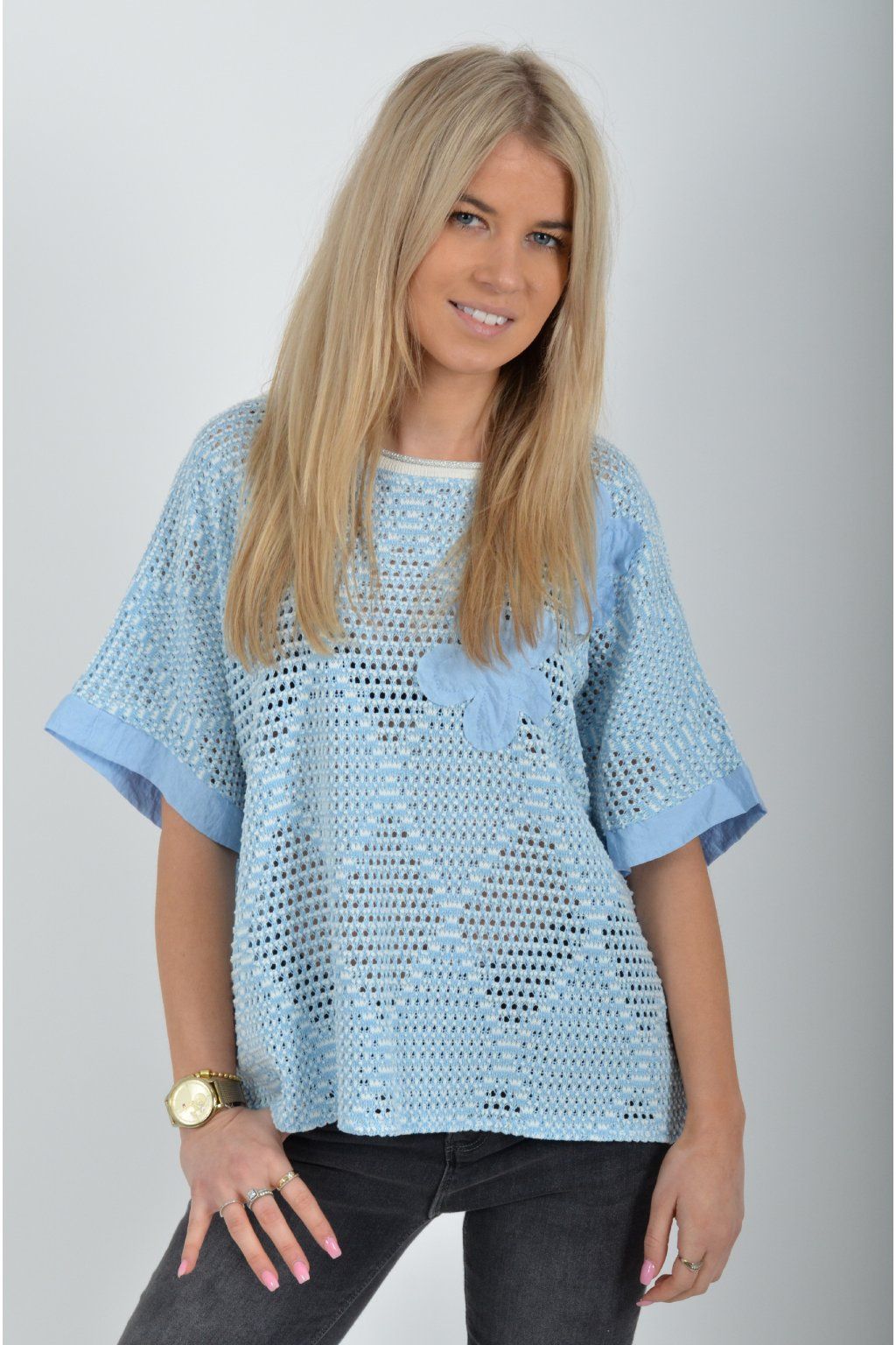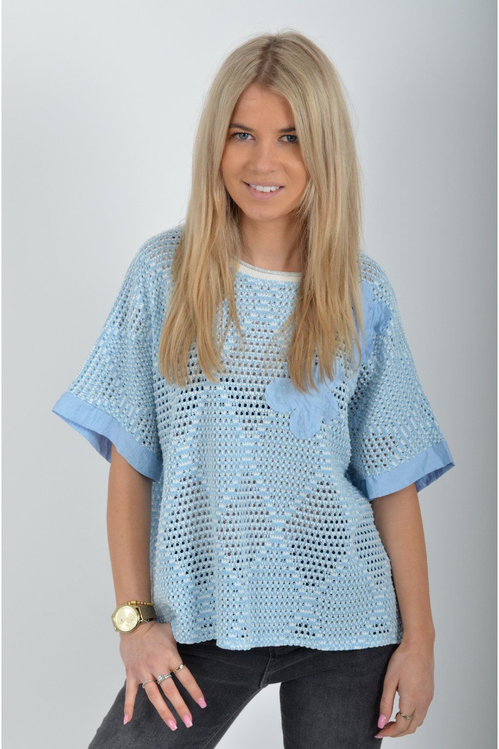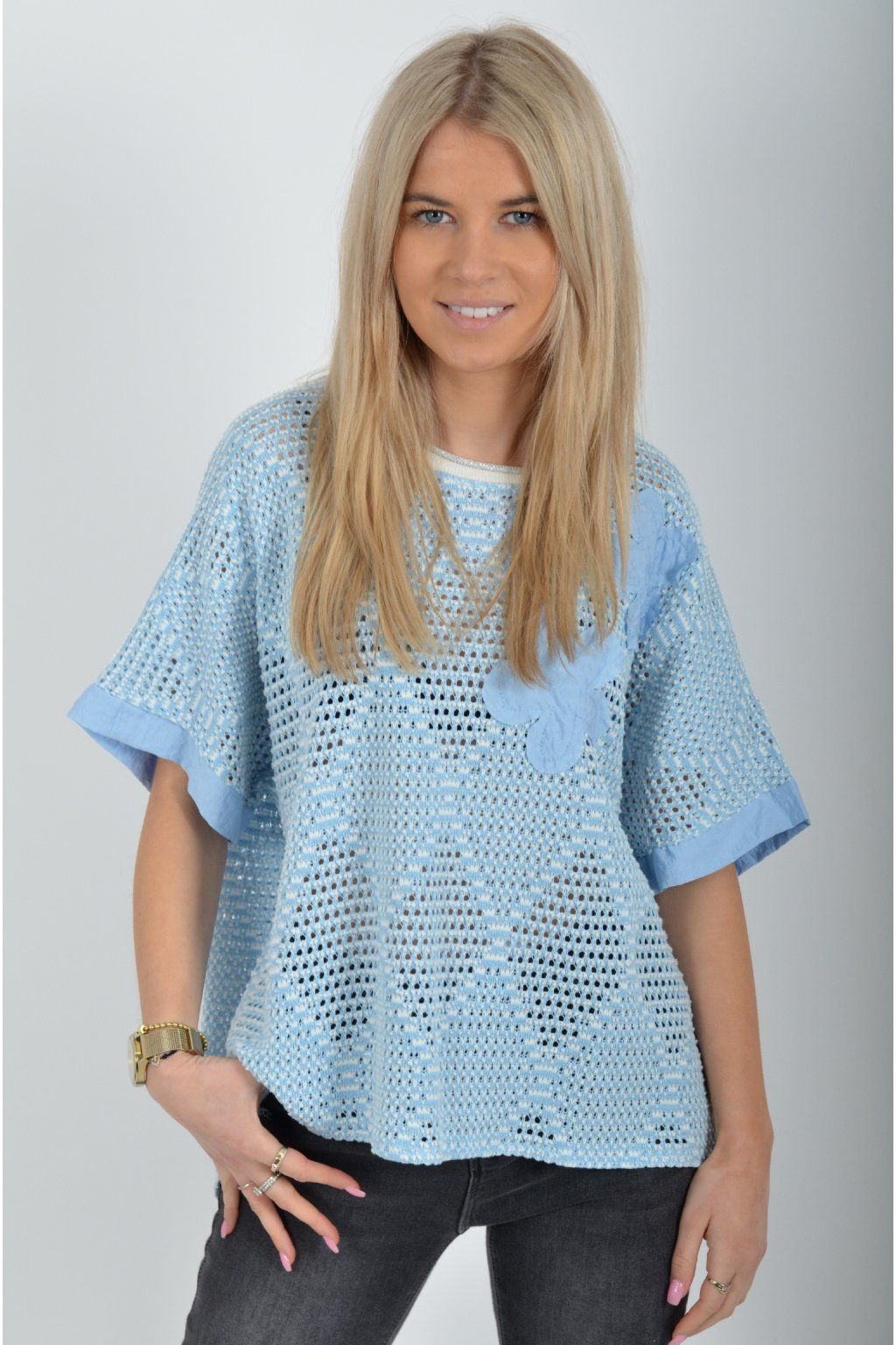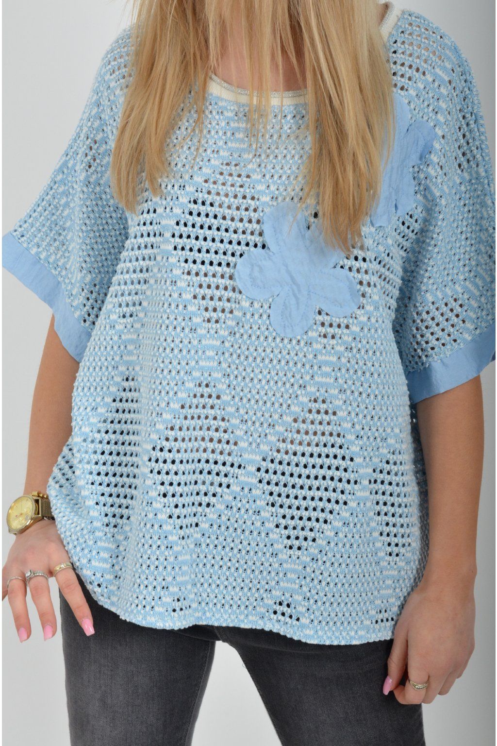Svetřík s krátkým rukávem vyrobený z odlehčeného a nekousavého materiálu. V přední části má našitý vzor ve tvaru květiny.