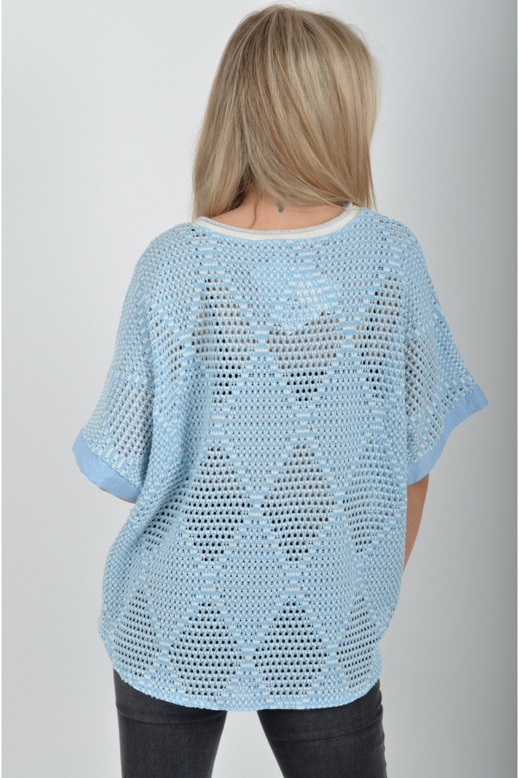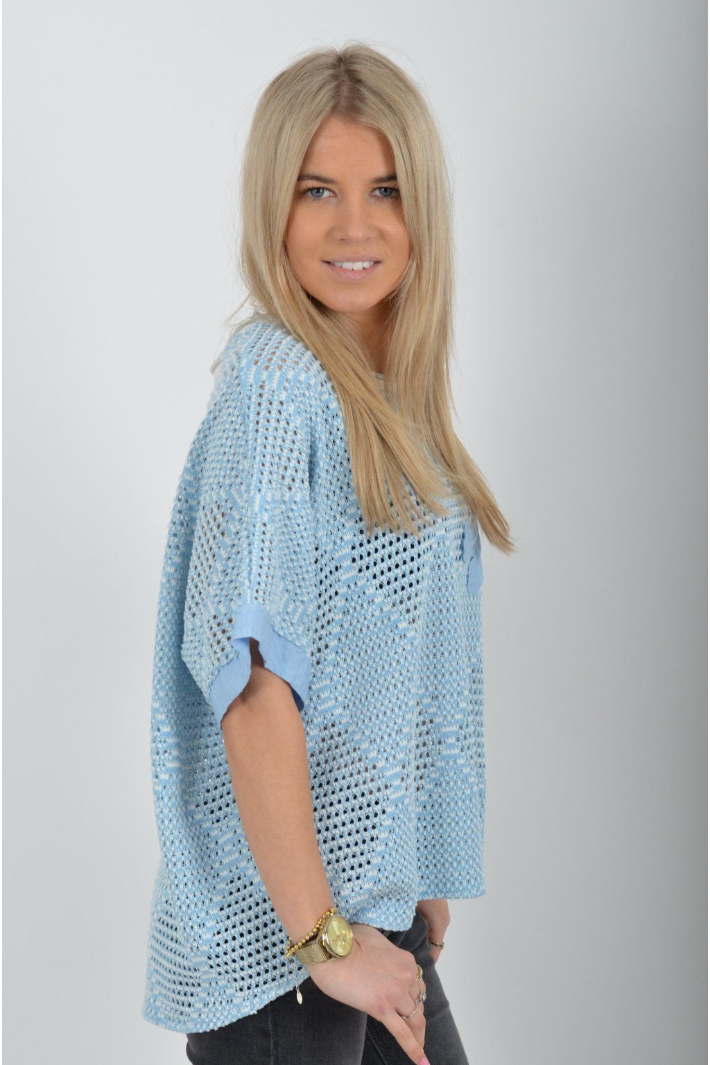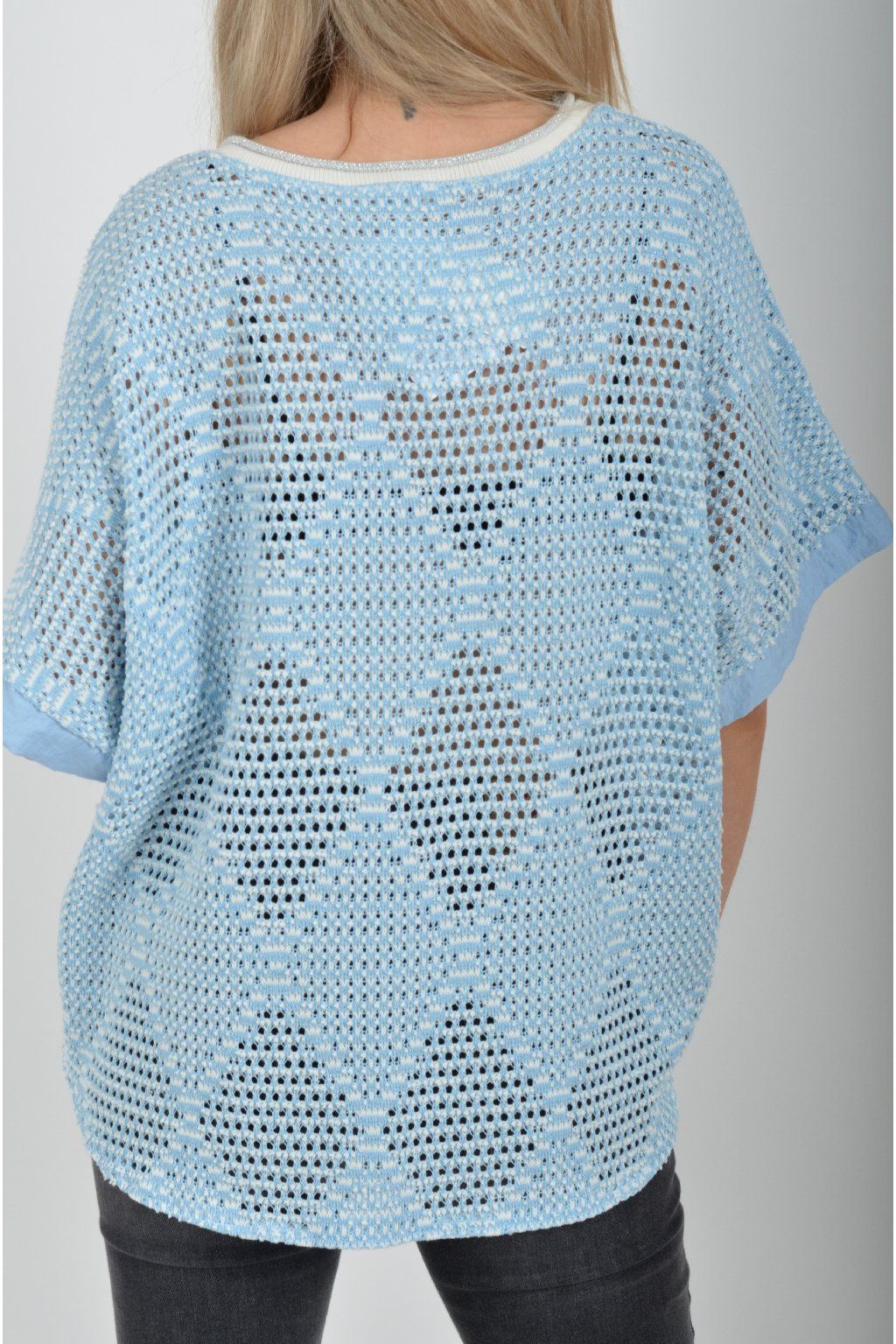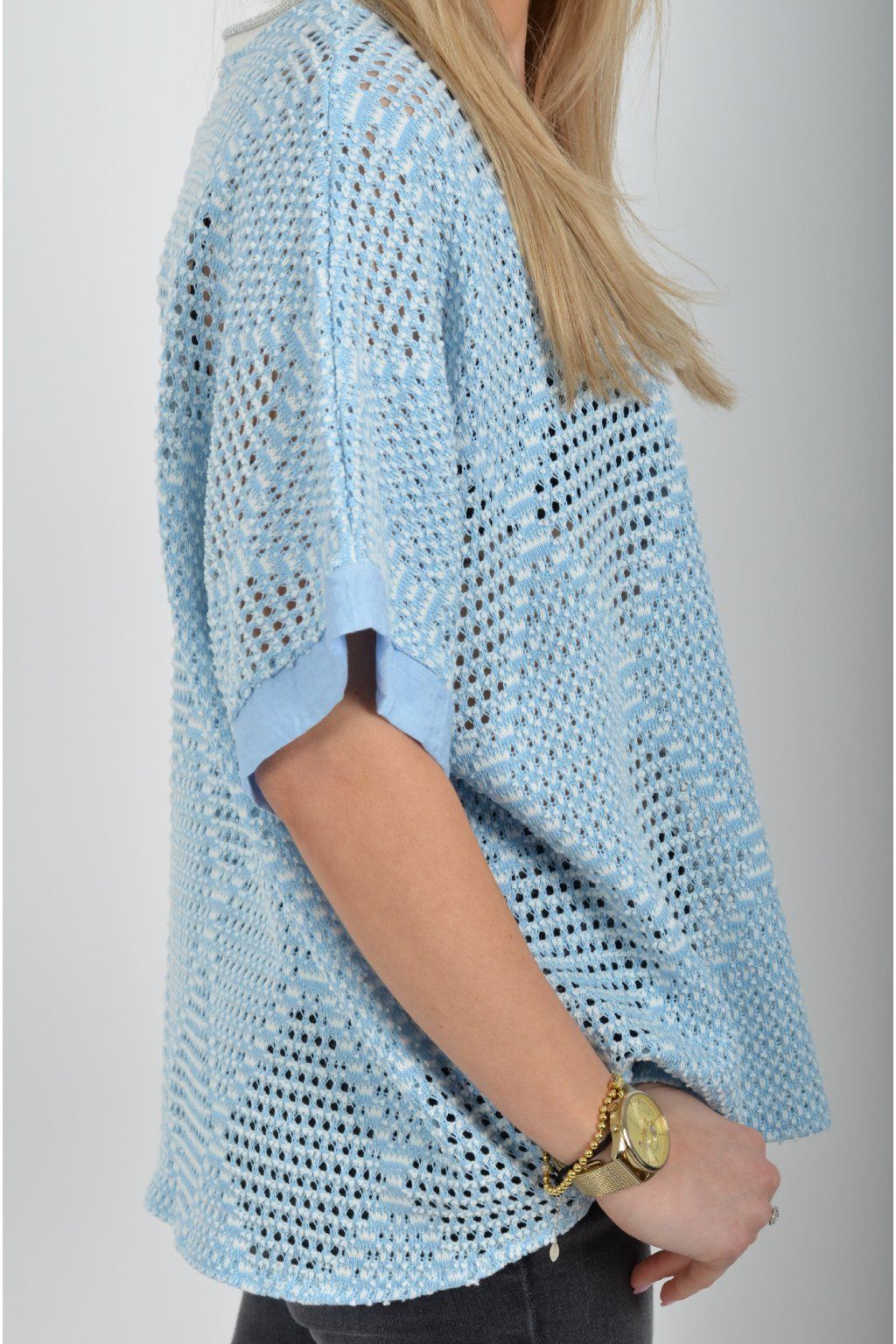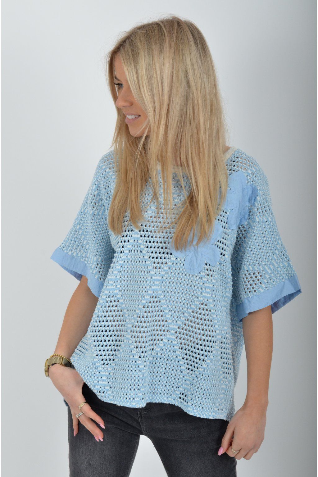 Svetřík s krátkým rukávem vyrobený z odlehčeného a nekousavého materiálu. V přední části má našitý vzor ve tvaru květiny.
