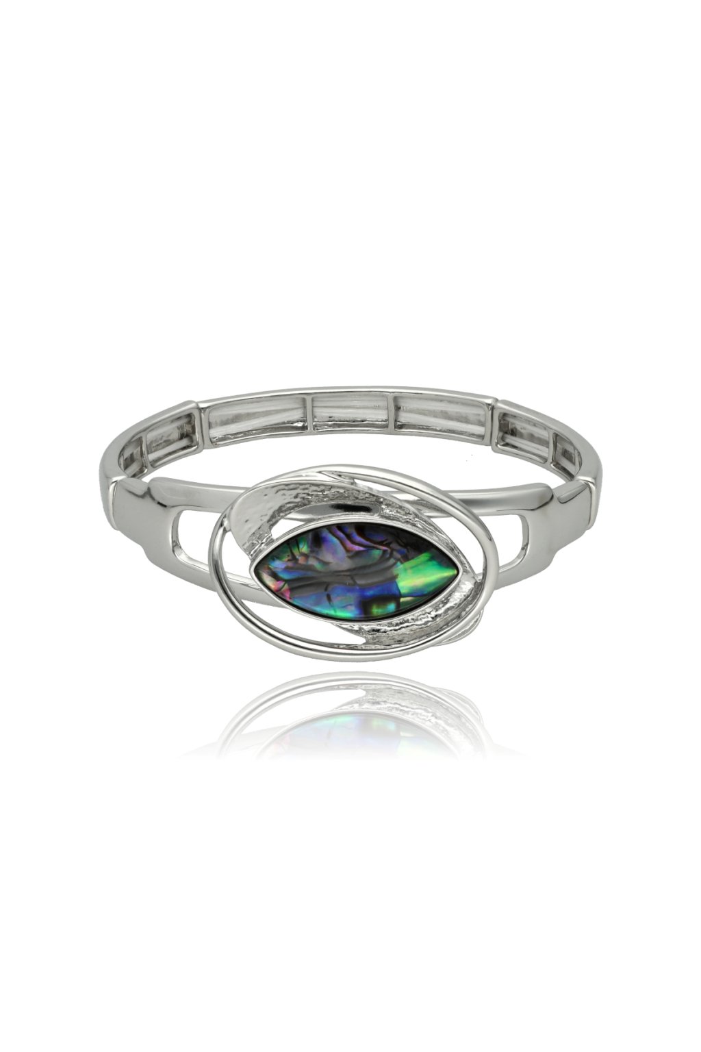 Stylový náramek na pružné gumičce, vyrobený z kovových, antialergenních komponentů. Ve středu se nachází výrazný ozdobný prvek o průměru cca 3 cm, vyrobený z přírodní mušle Abalone. Náramek se přizpůsobí zápěstí a zajišťuje pohodlné nošení.