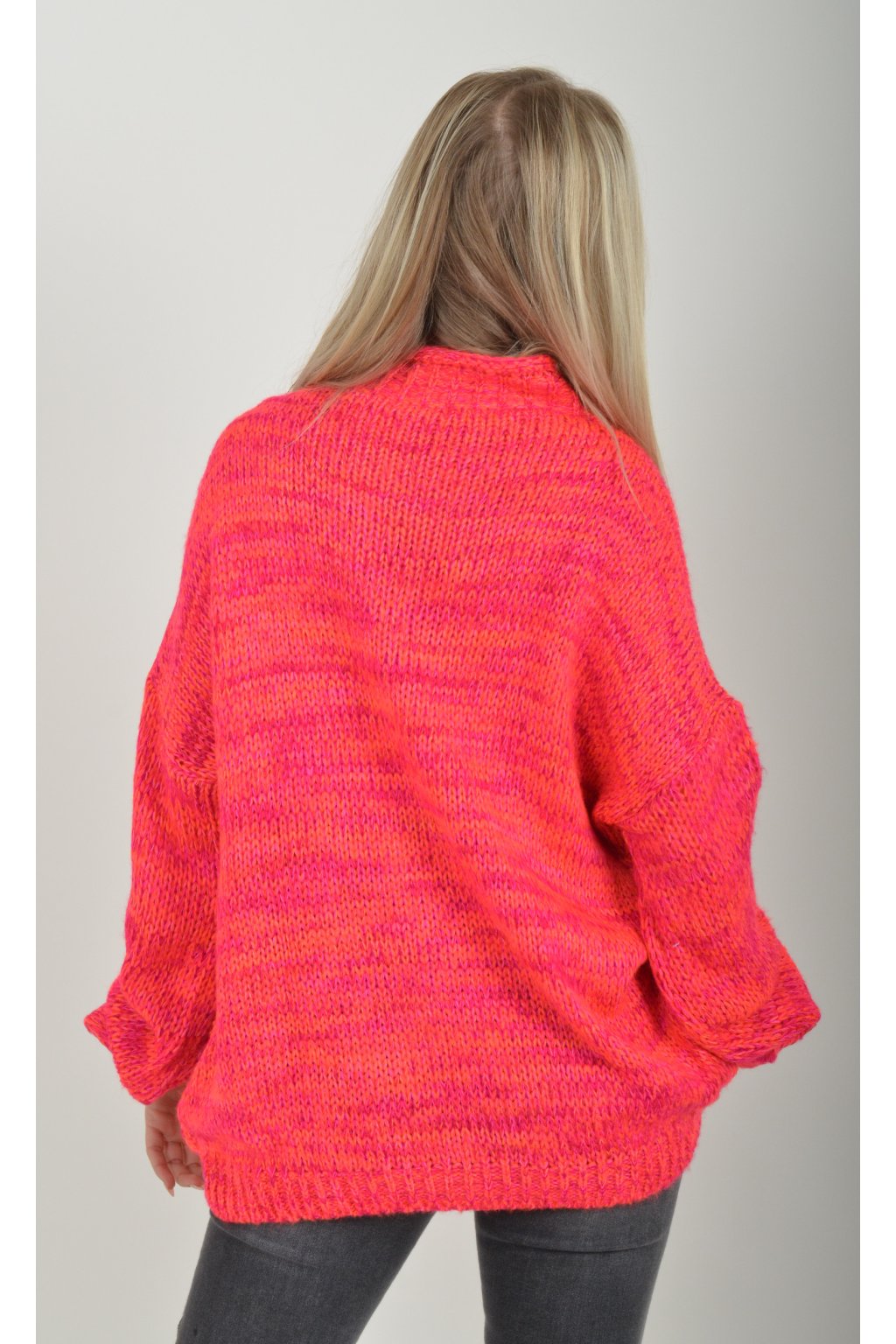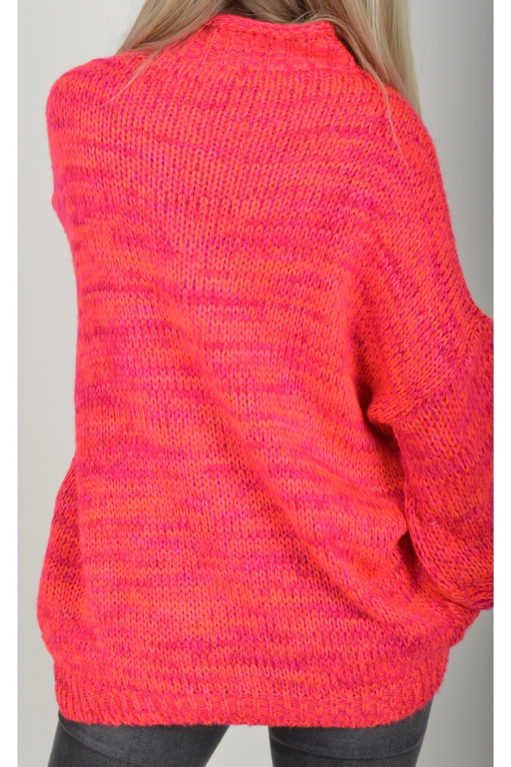 Žíhaný elastický svetr s dlouhým rukávem s barevnou kombinací, neonově růžová a oranžová. Svetr je z velice příjemného a nekousavého materiálu.