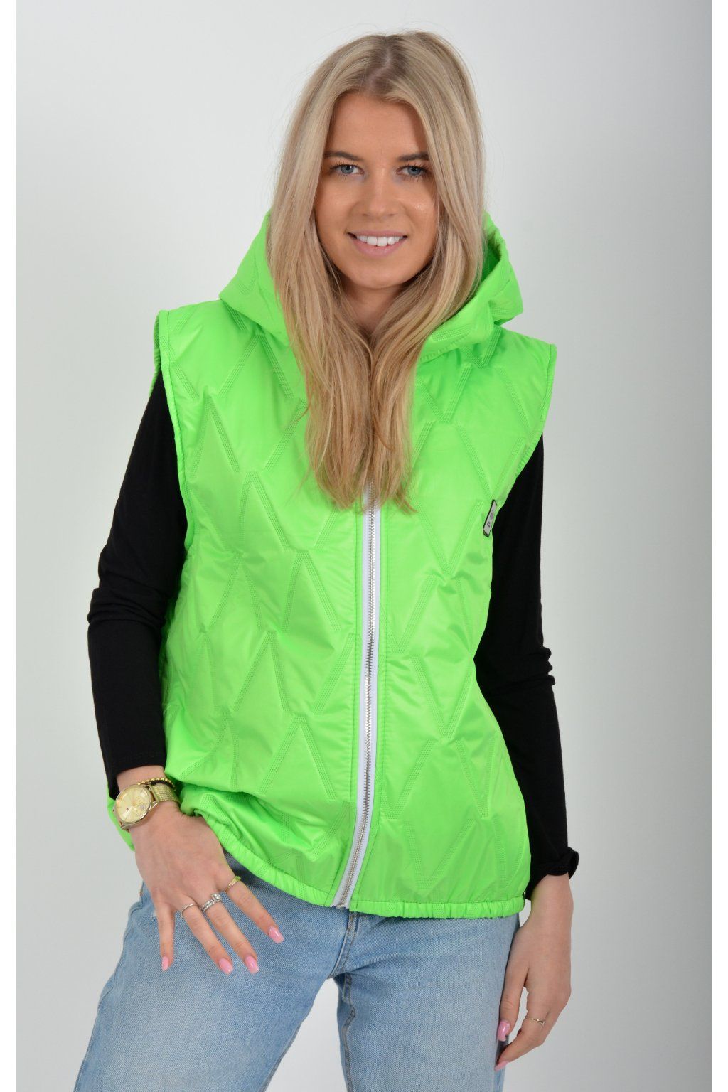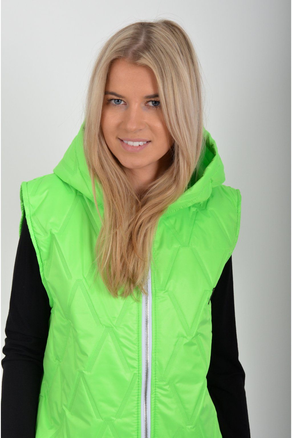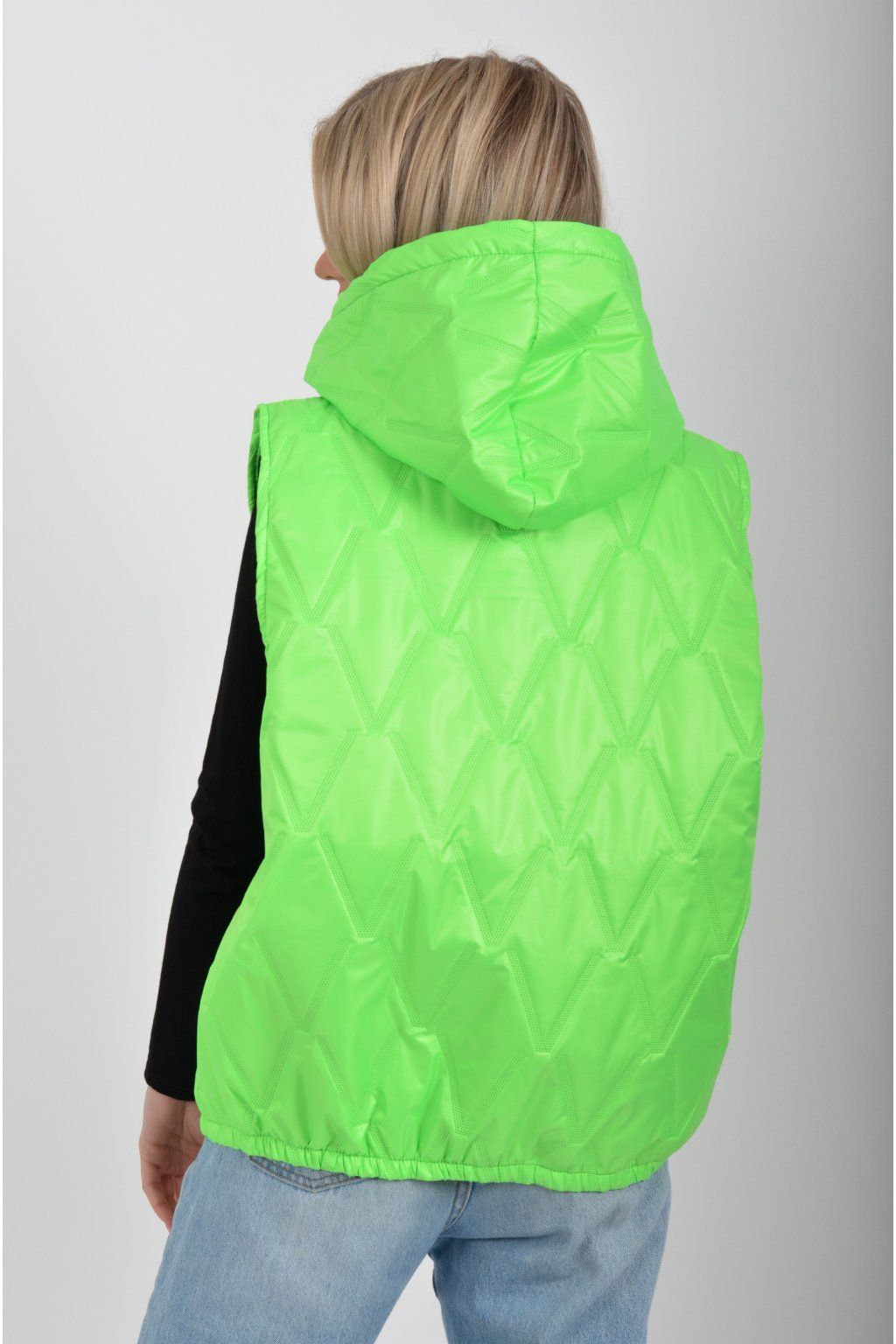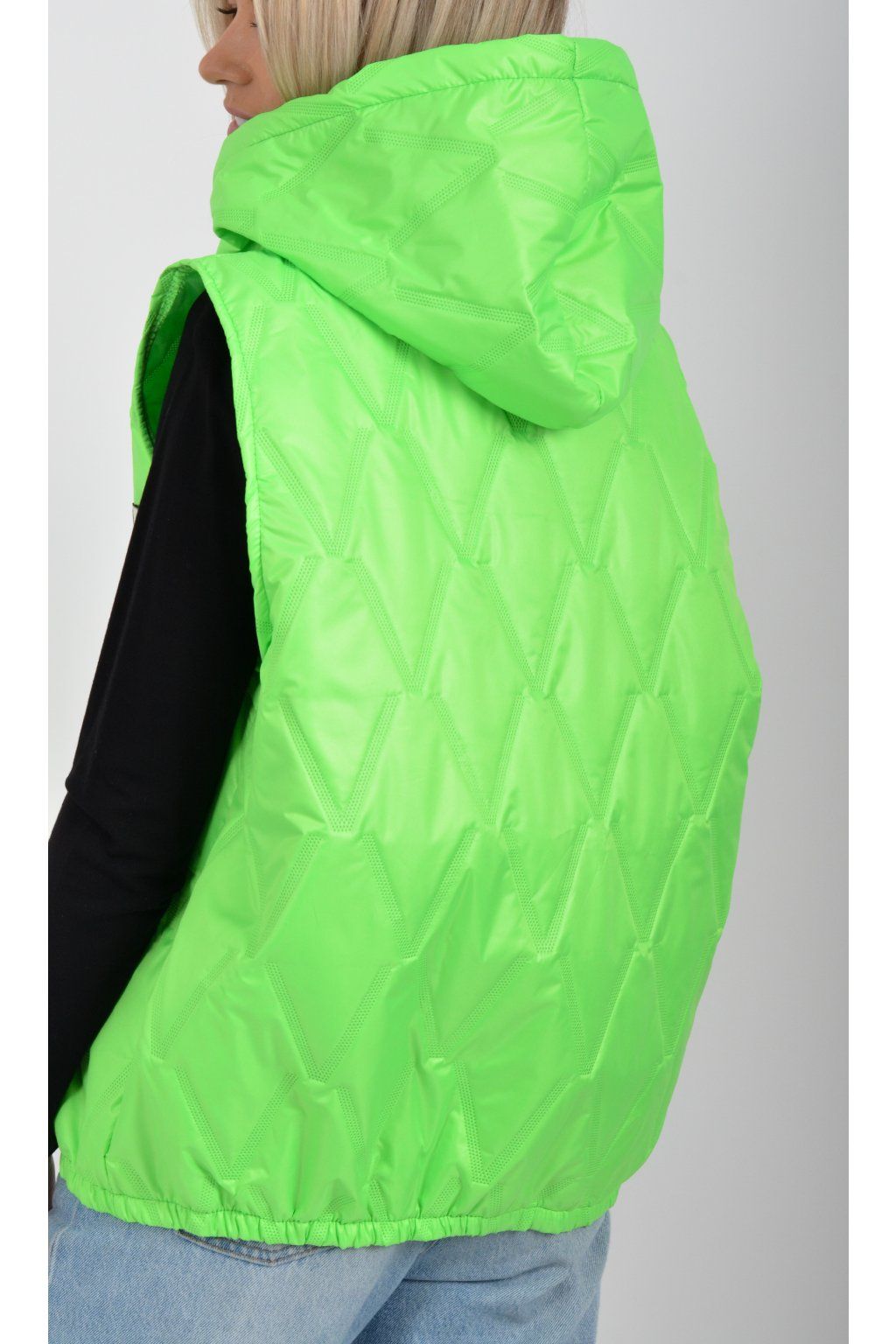 Prošívaná přechodová vesta rovného střihu s kapucí. Materiál vesty je z odlehčeného materiálu. Vesta nemá kapsy. Ve spodní části vesty je zapracovaná guma.