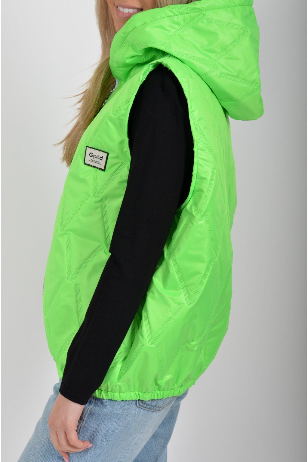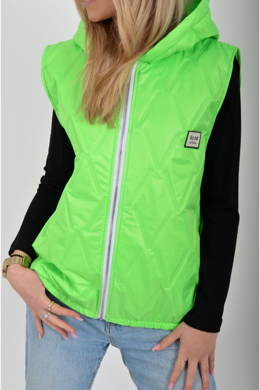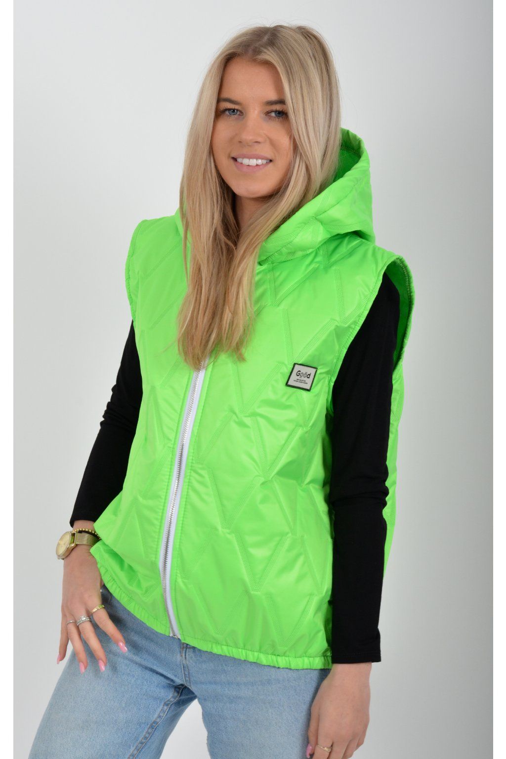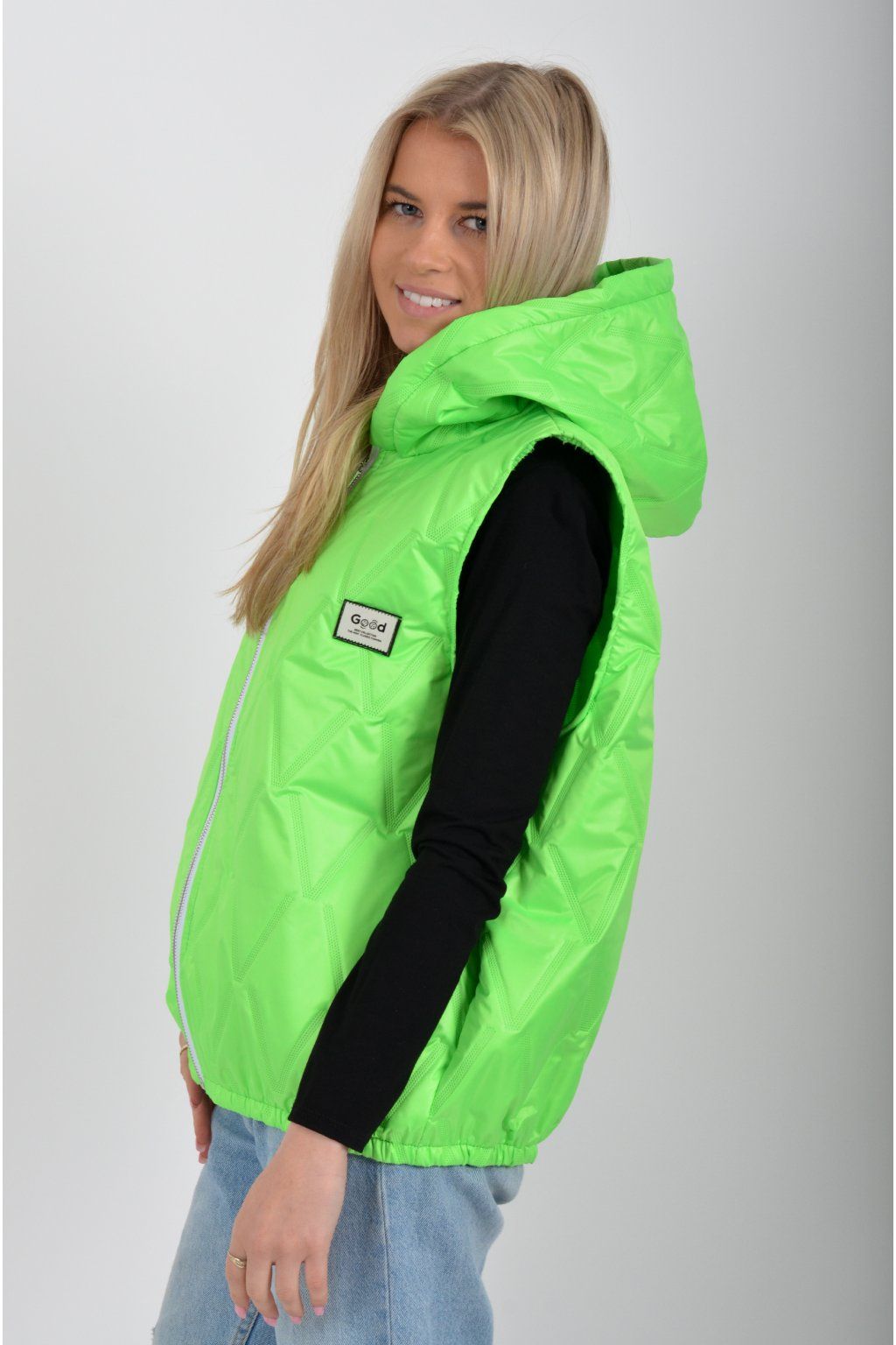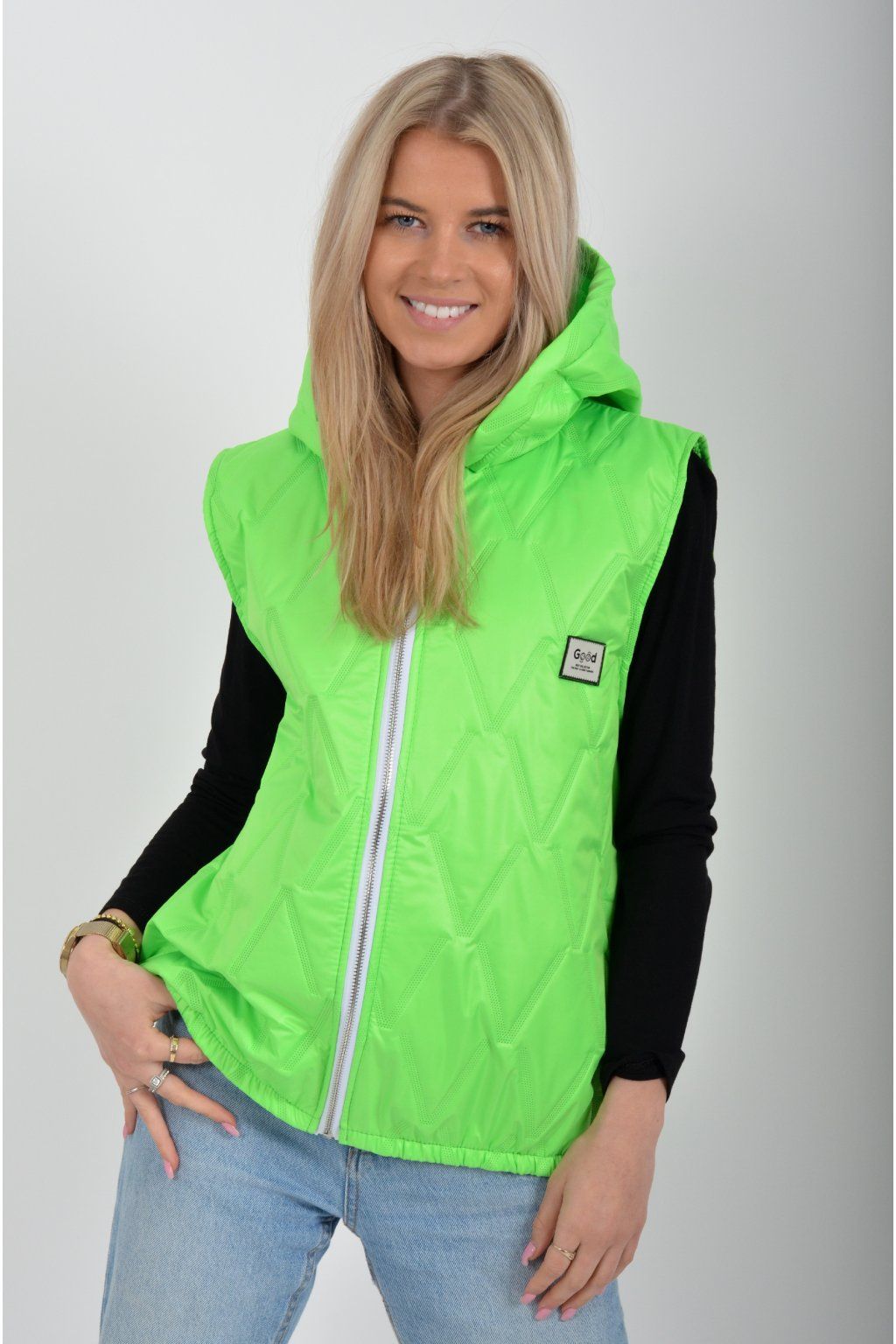 Prošívaná přechodová vesta rovného střihu s kapucí. Materiál vesty je z odlehčeného materiálu. Vesta nemá kapsy. Ve spodní části vesty je zapracovaná guma.