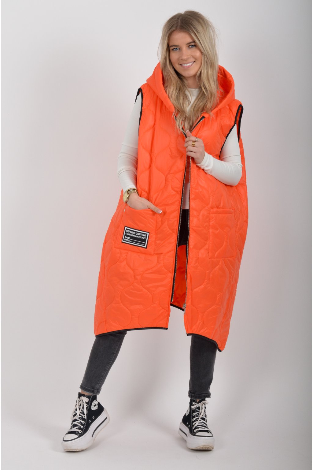 Prošívaná přechodová dlouhá vesta lehce áčkového střihu s kapucí a kapsami. Materiál vesty je z odlehčeného materiálu. Je ideální pro jarní nošení.