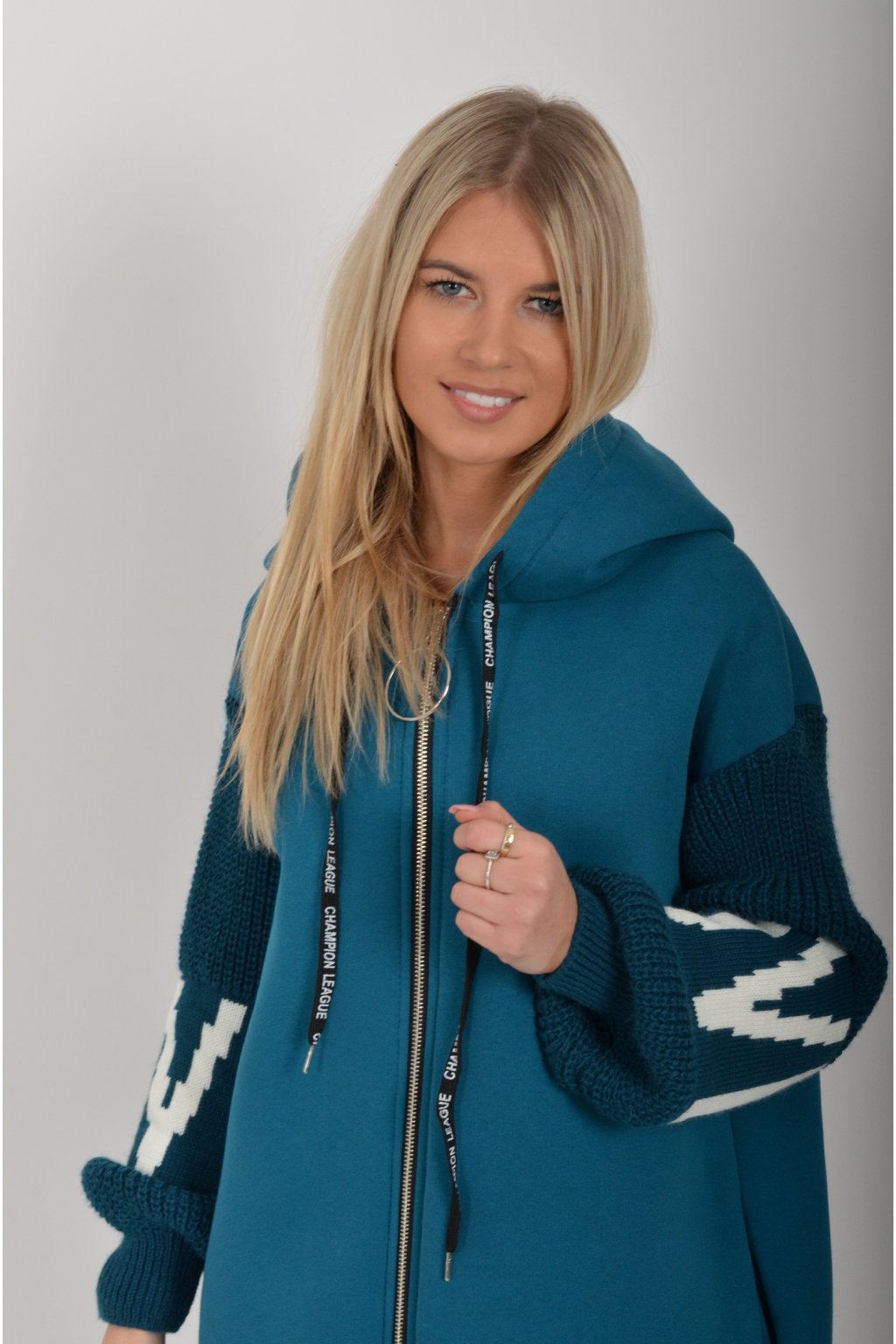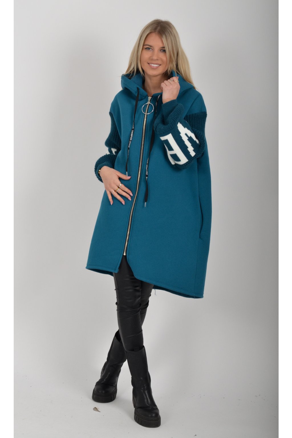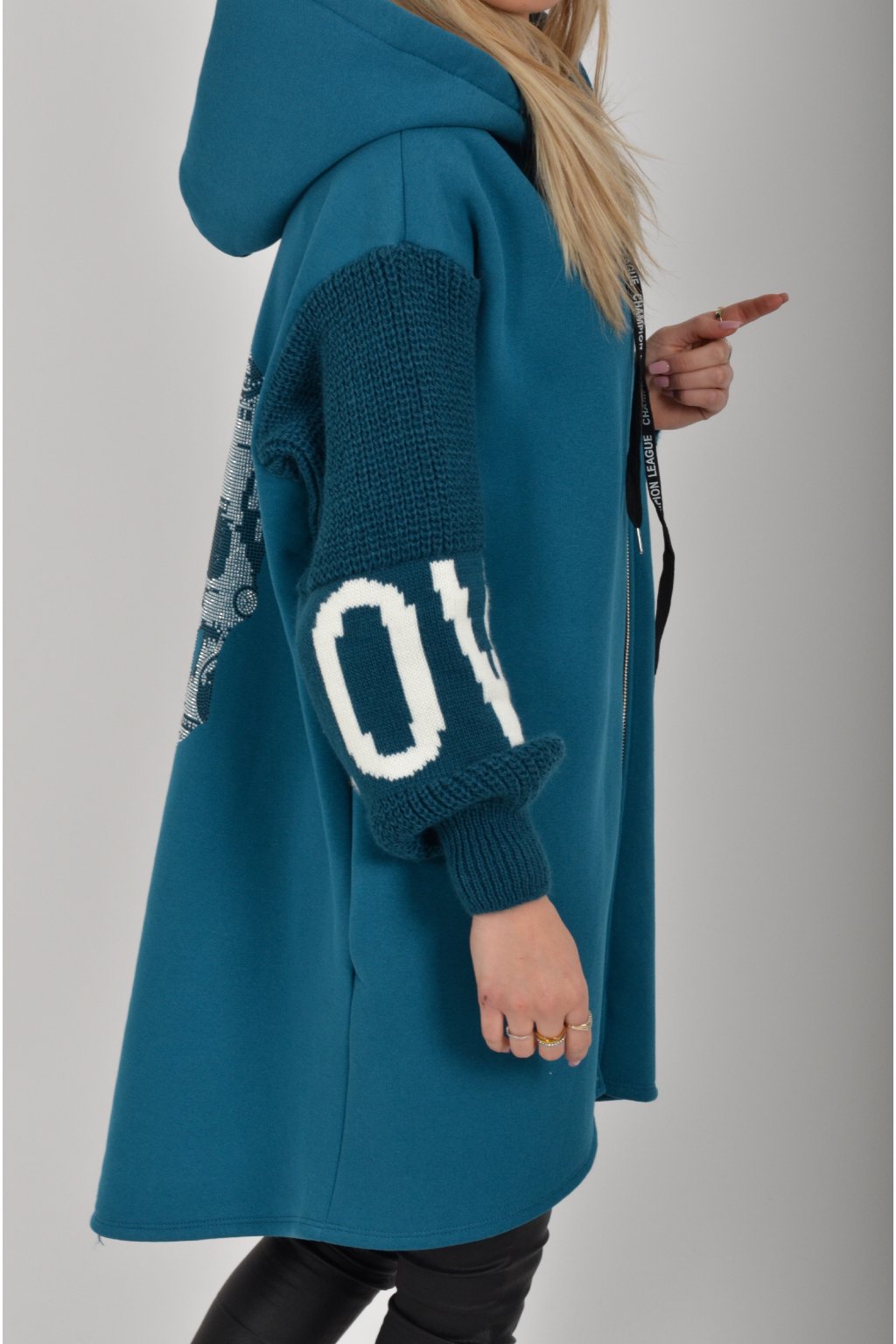 Mikina na zip s kapucí, dlouhým rukávem a kapsami na bocích. Mikina má pletené rukávy a v zadní části stříbrnou aplikaci. Je vyrobena z velice příjemného a kvalitního materiálu.