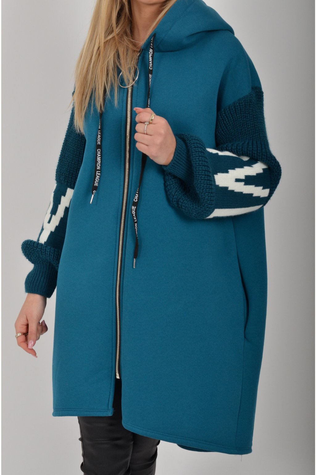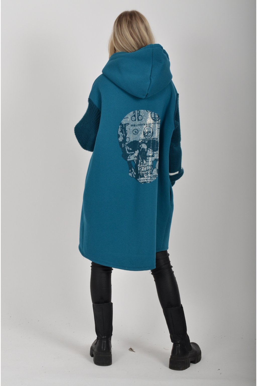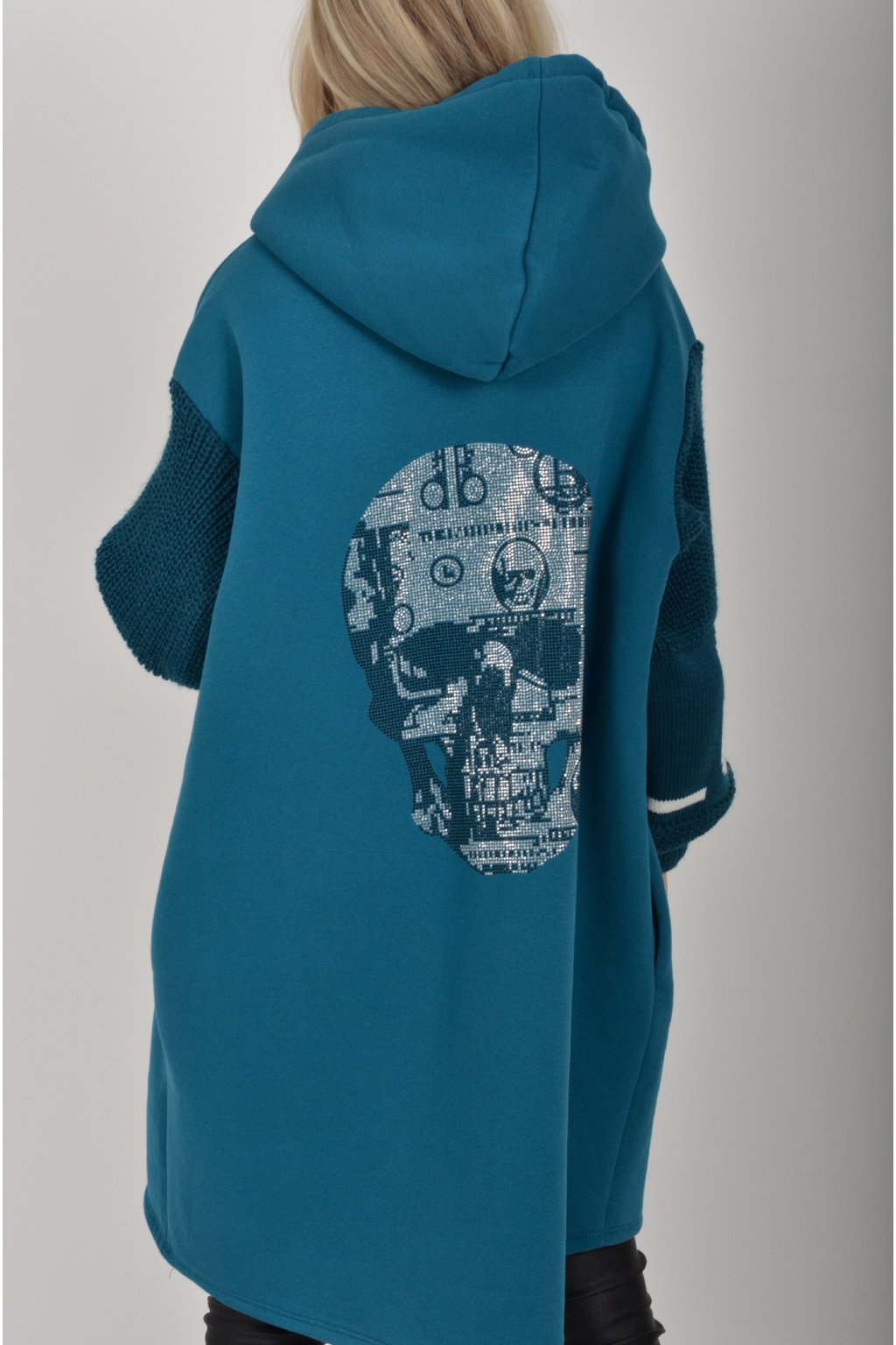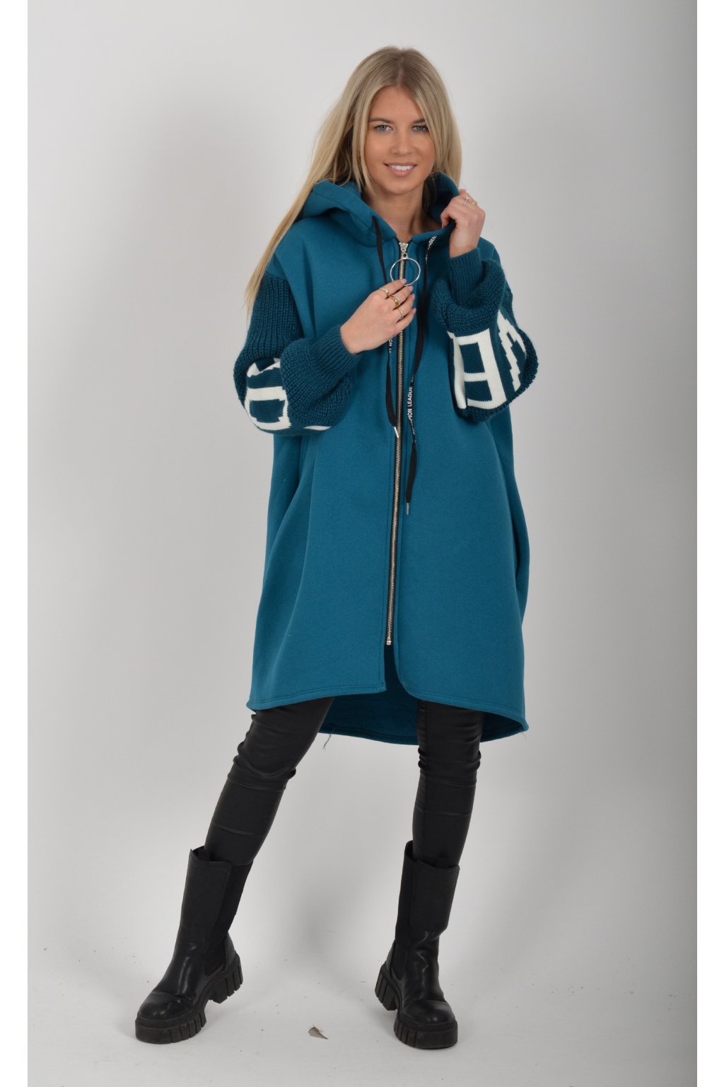 Mikina na zip s kapucí, dlouhým rukávem a kapsami na bocích. Mikina má pletené rukávy a v zadní části stříbrnou aplikaci. Je vyrobena z velice příjemného a kvalitního materiálu.