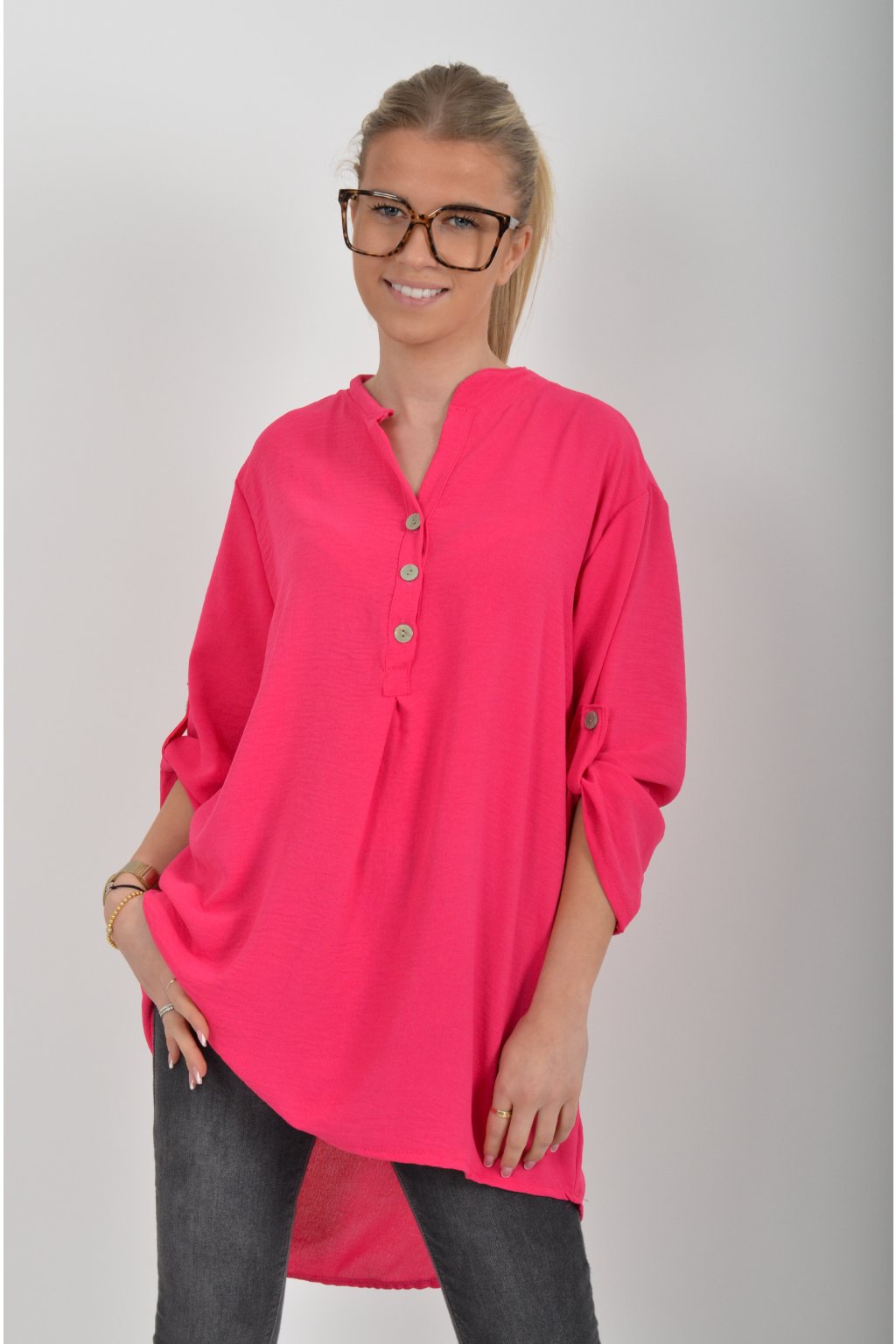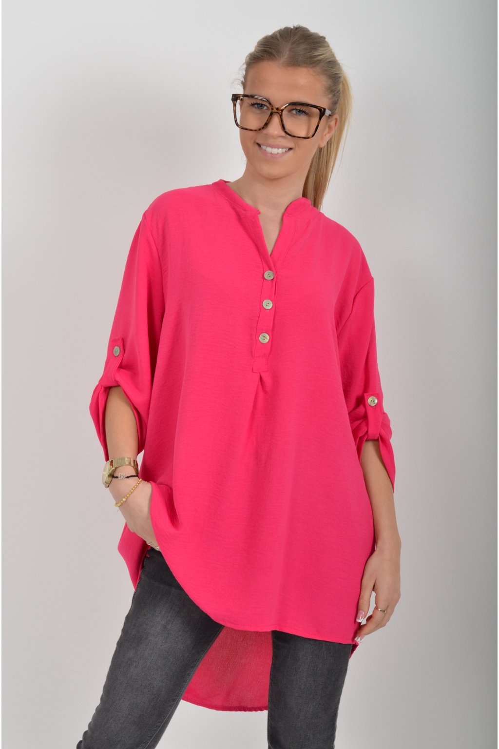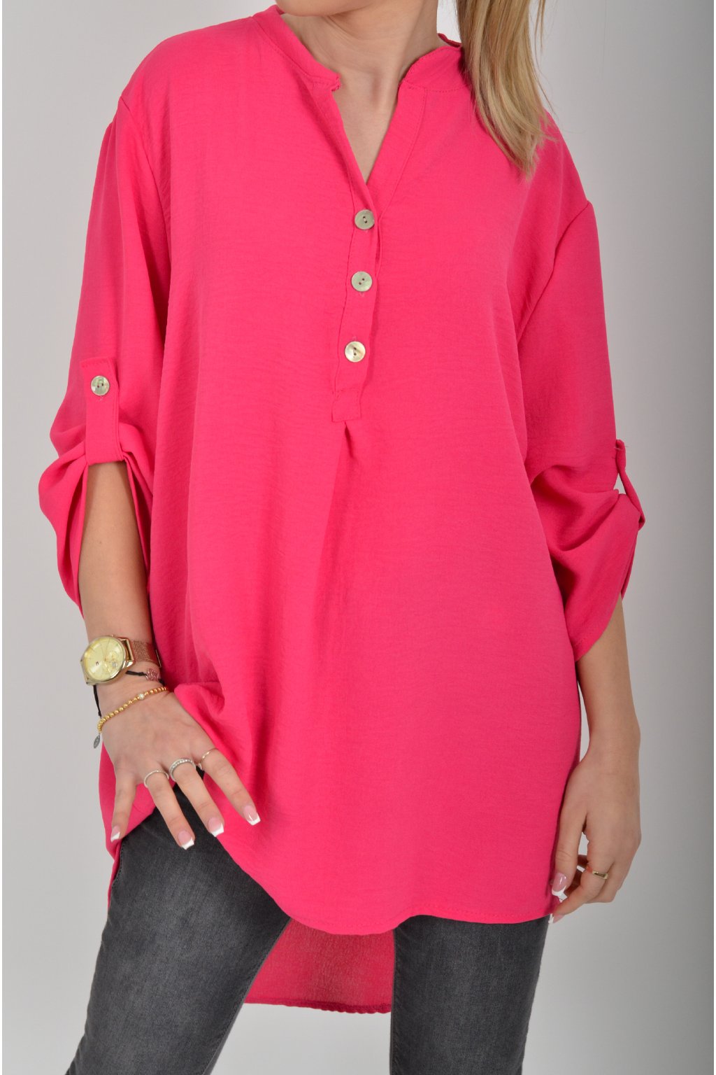 Halenka s tříčtvrtečním rukávem který lze pomocí knoflíku jednoduše zkrátit. Halenka má výstřih do V a zapínaní na tři knoflíky. Je vyrobena z příjemného a lehounkého materiálu. Zadní část halenky je delší než přední.