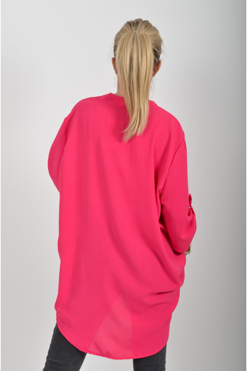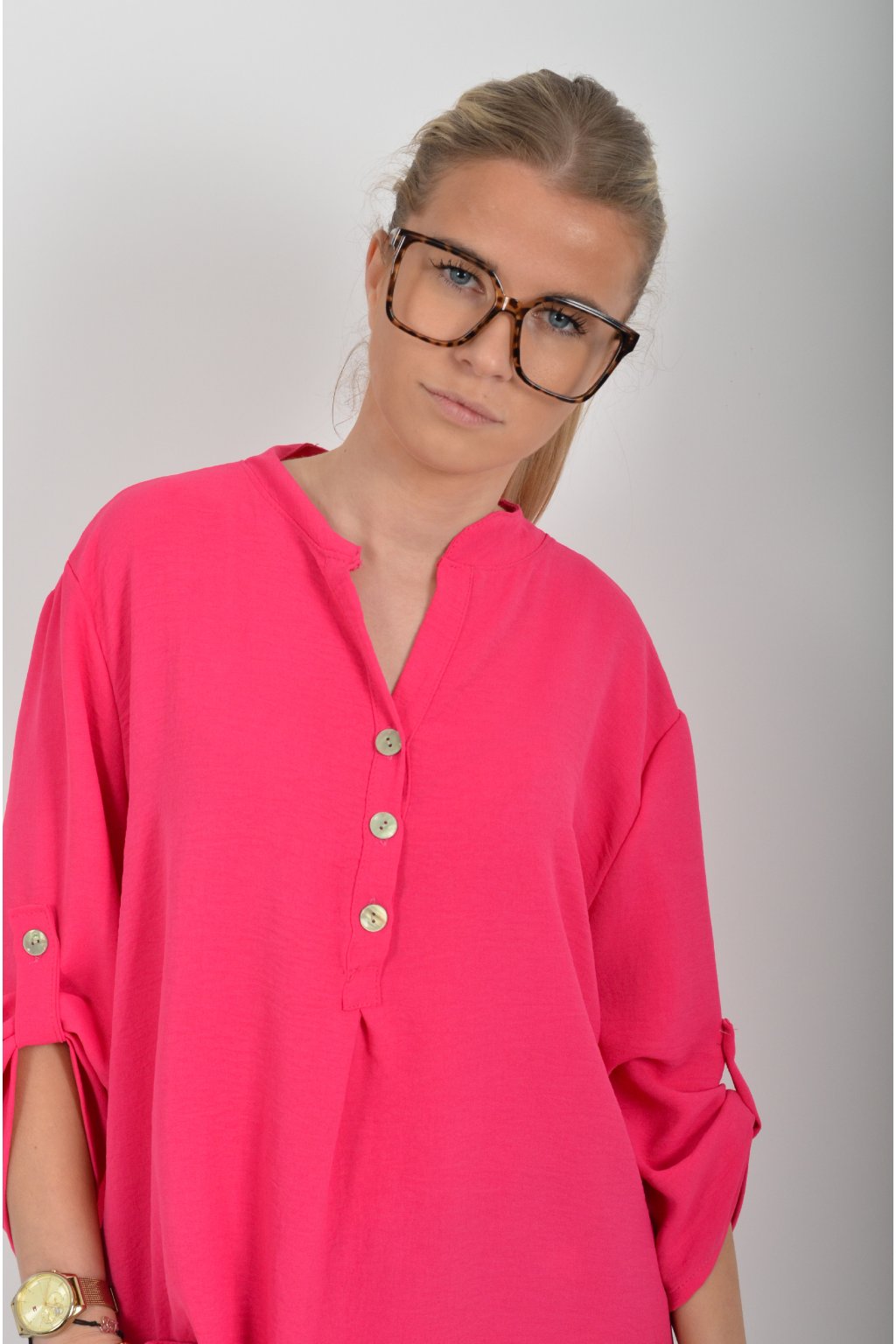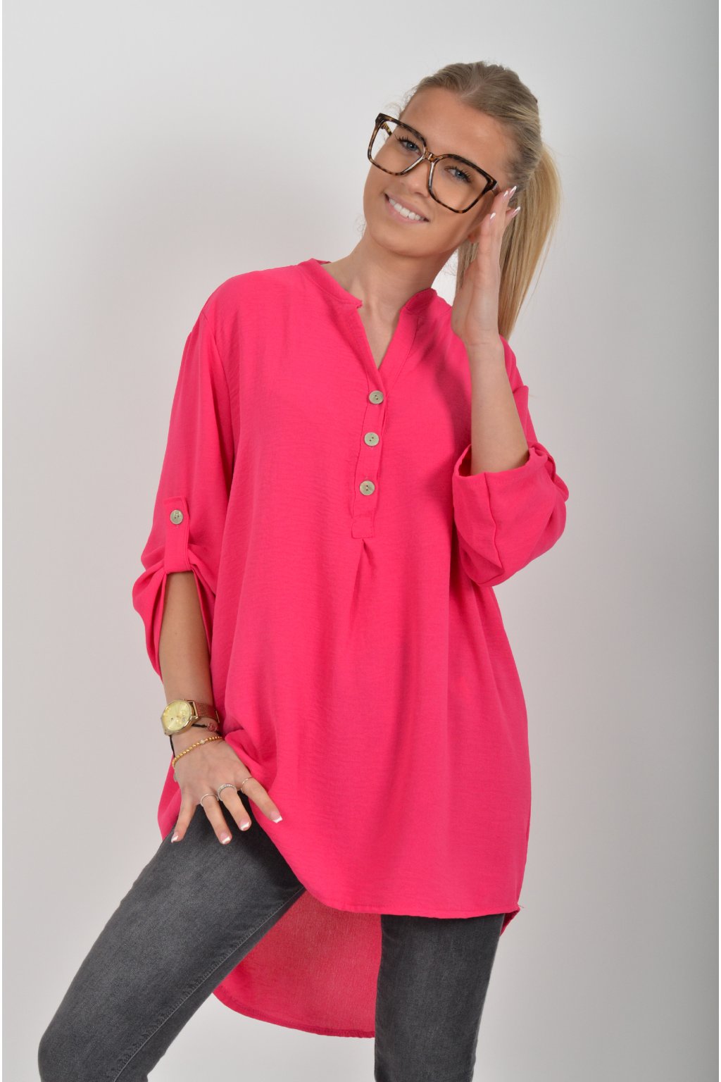 Halenka s tříčtvrtečním rukávem který lze pomocí knoflíku jednoduše zkrátit. Halenka má výstřih do V a zapínaní na tři knoflíky. Je vyrobena z příjemného a lehounkého materiálu. Zadní část halenky je delší než přední.