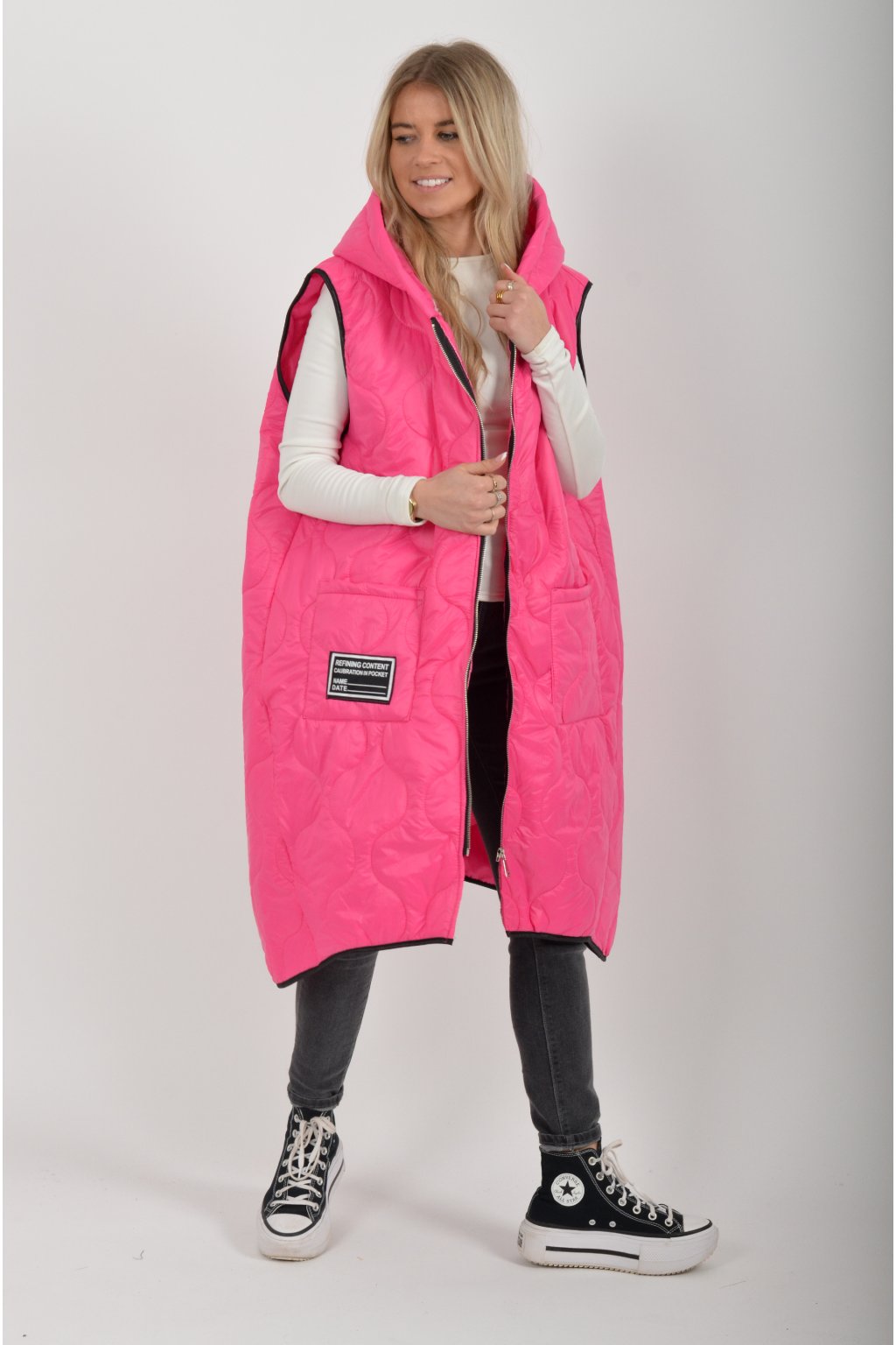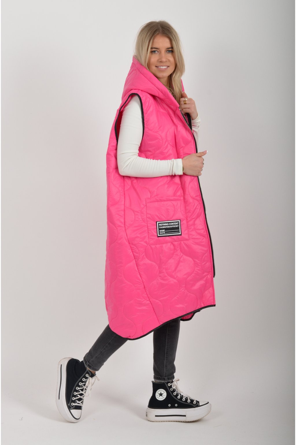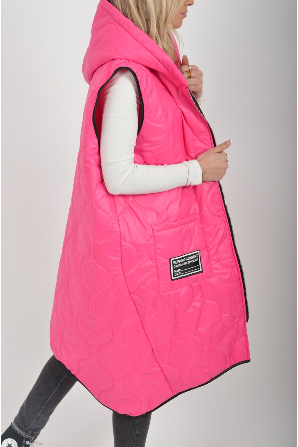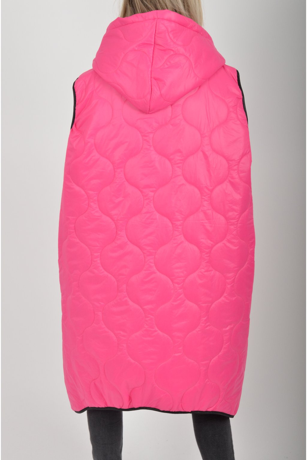 Prošívaná přechodová dlouhá vesta lehce áčkového střihu s kapucí a kapsami. Materiál vesty je z odlehčeného materiálu. Je ideální pro jarní nošení.