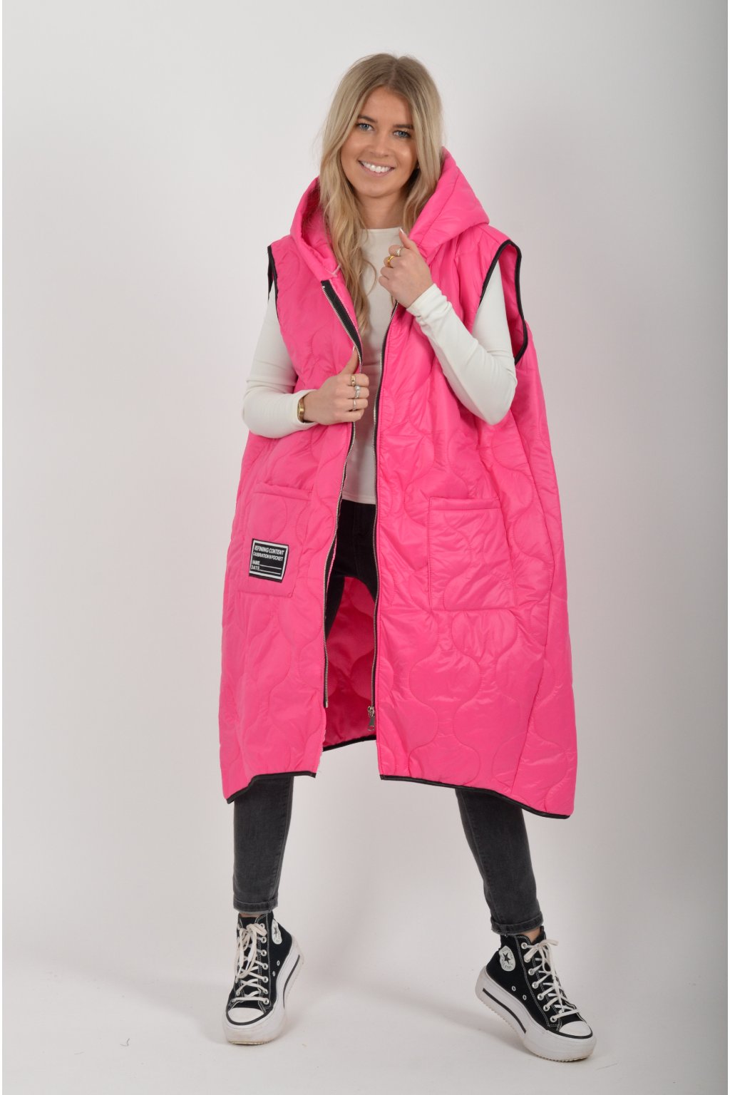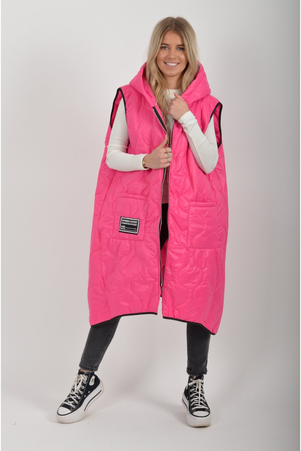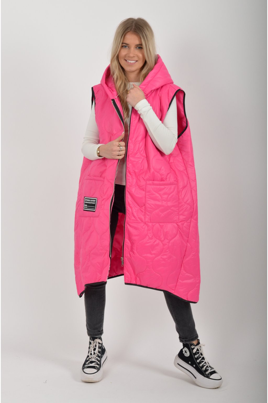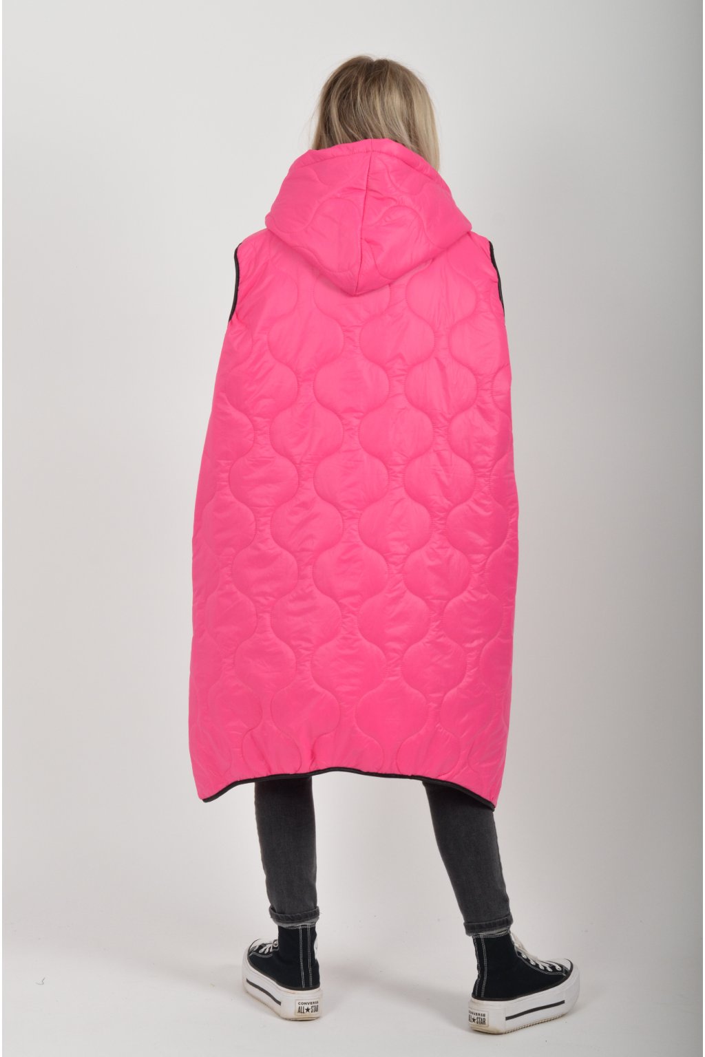 Prošívaná přechodová dlouhá vesta lehce áčkového střihu s kapucí a kapsami. Materiál vesty je z odlehčeného materiálu. Je ideální pro jarní nošení.