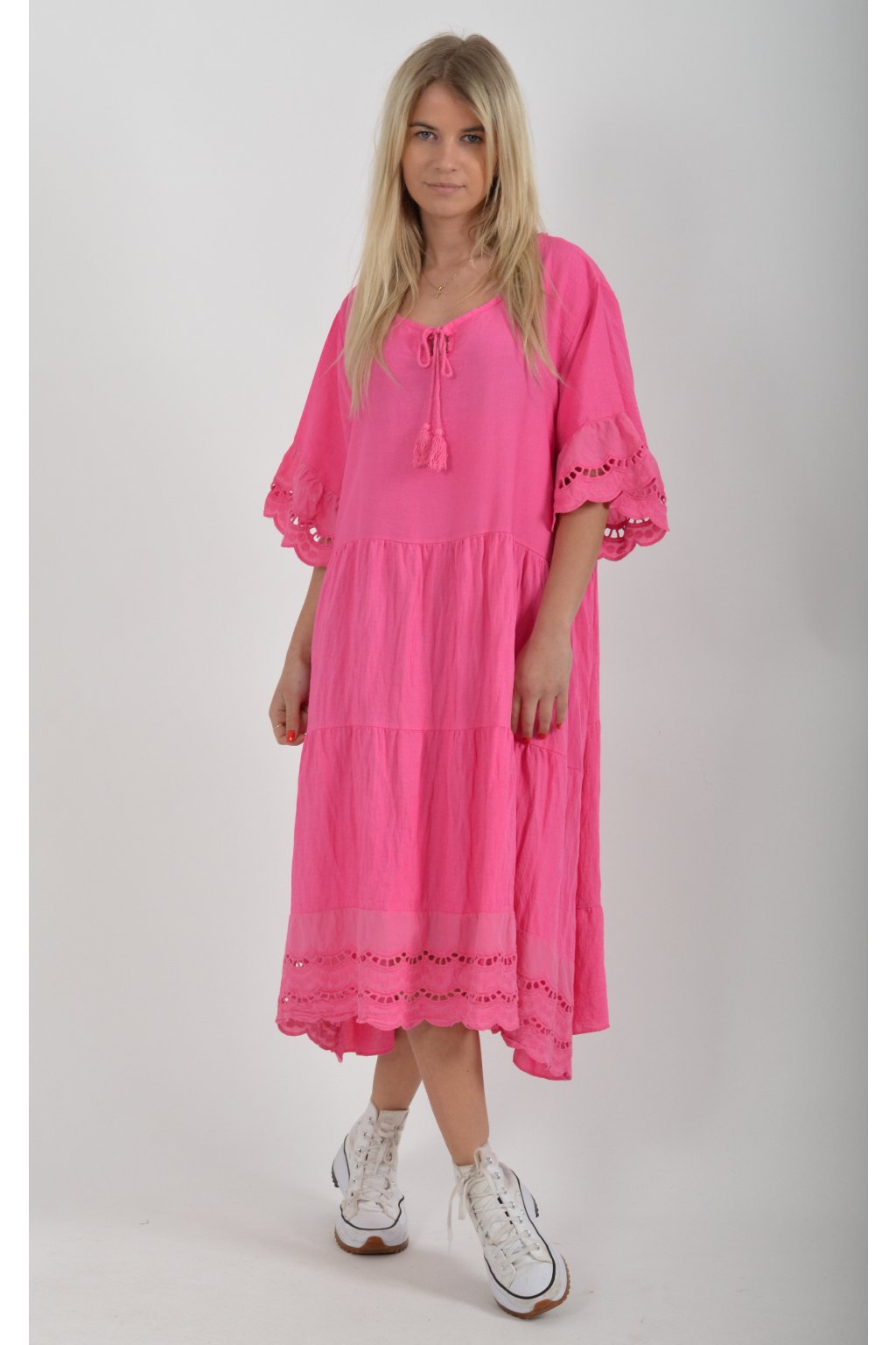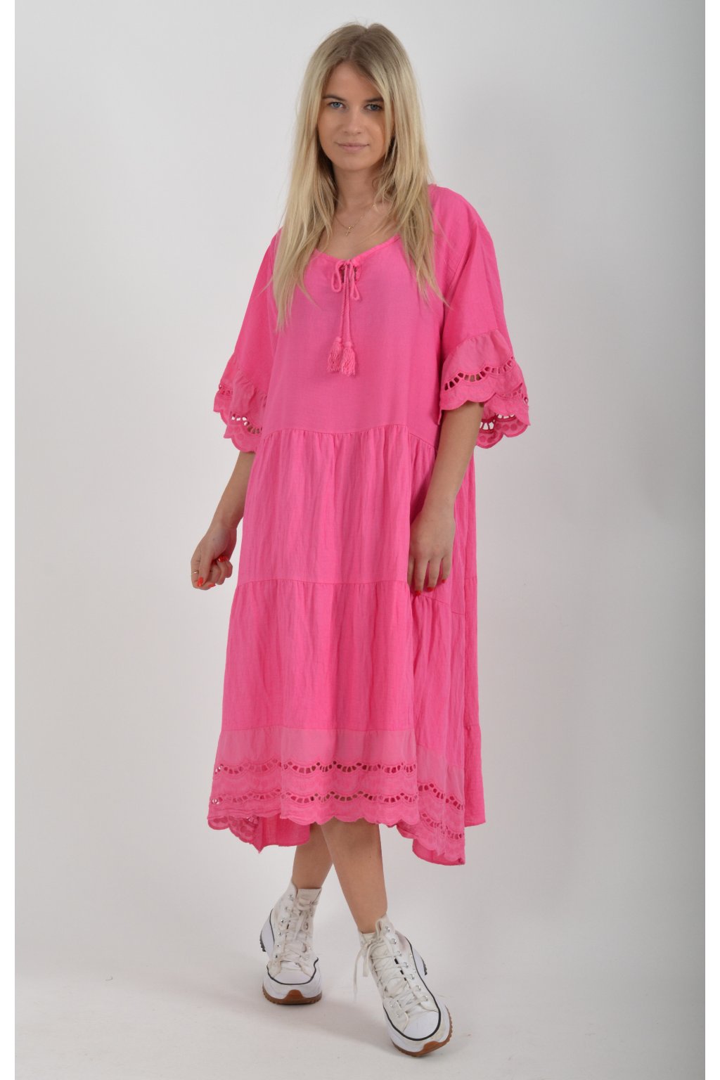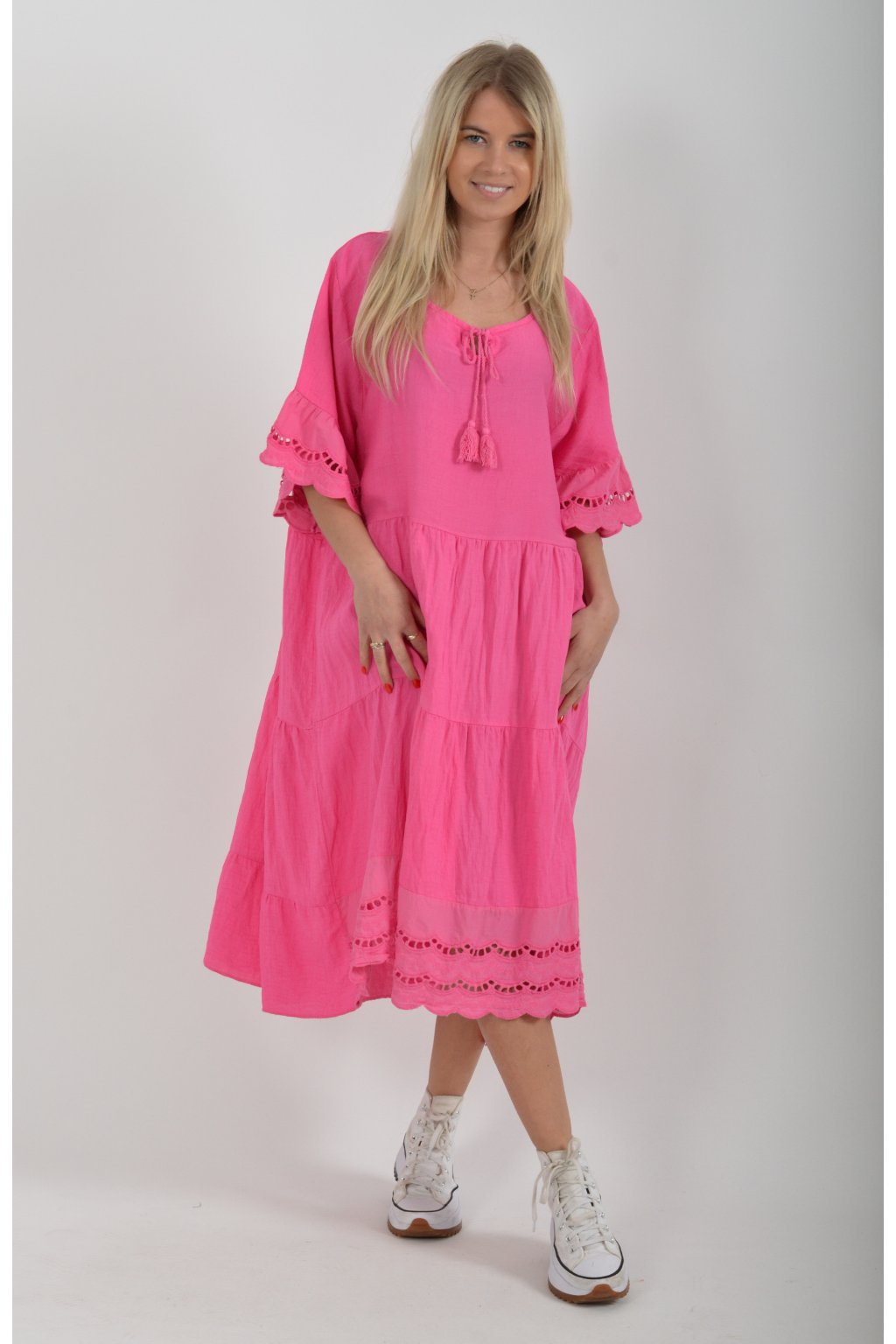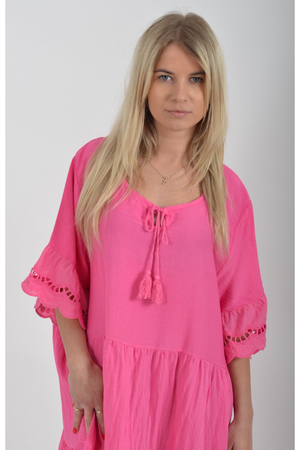 Jednobarevné šaty s krátkým rukávem, který je zdobený krajkou. Šaty jsou áčkového střihu a jsou vyrobené z lehounkého materiálu.