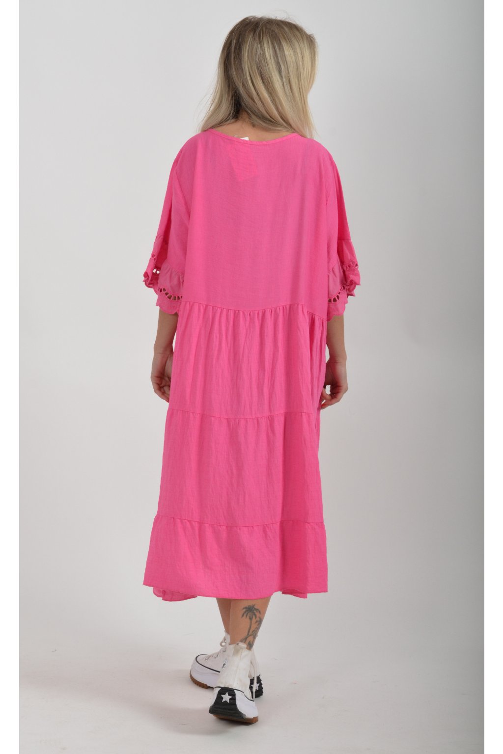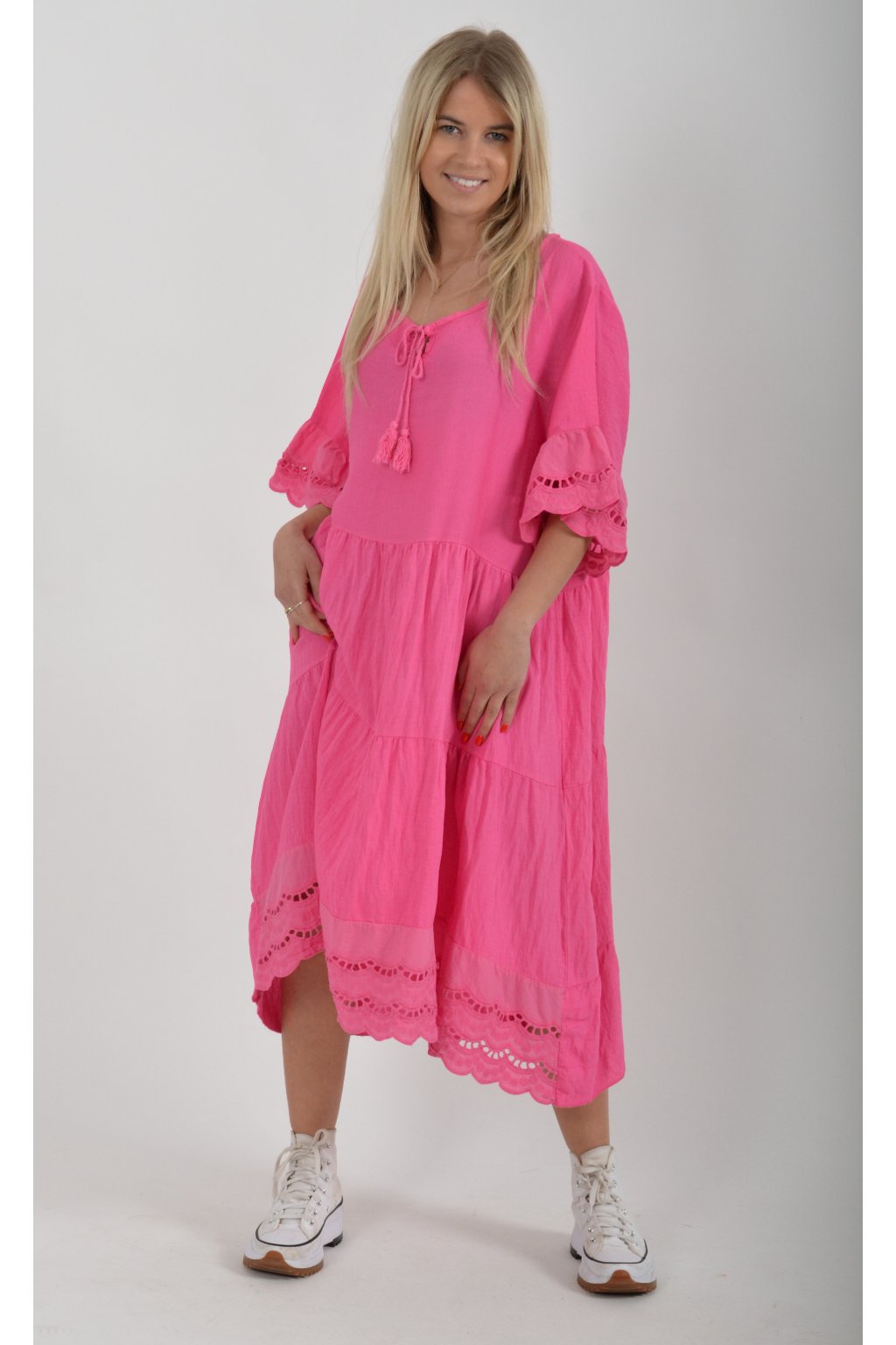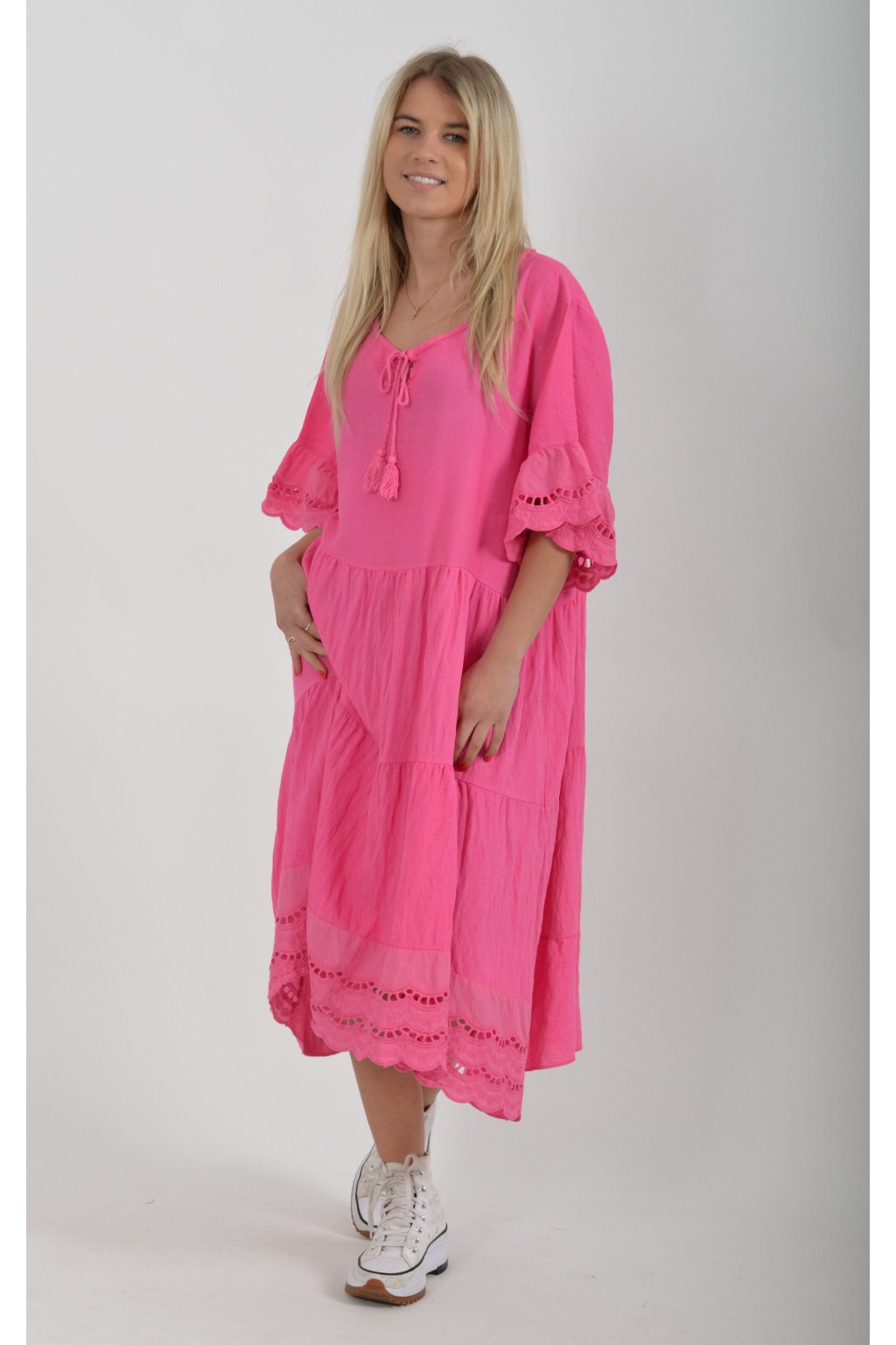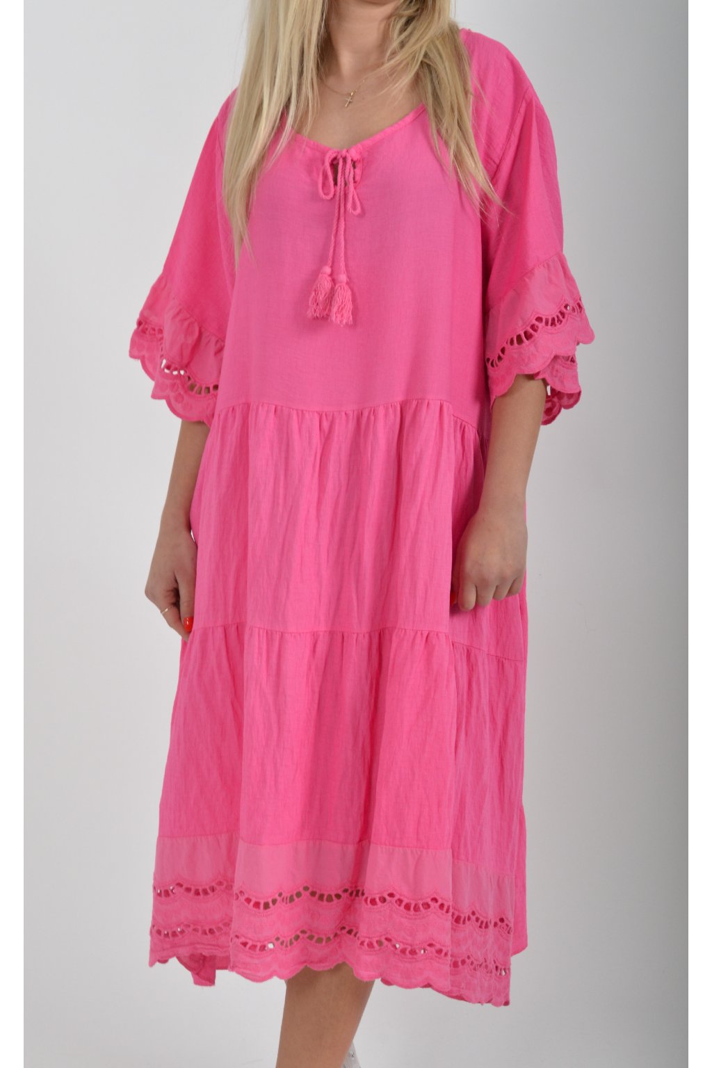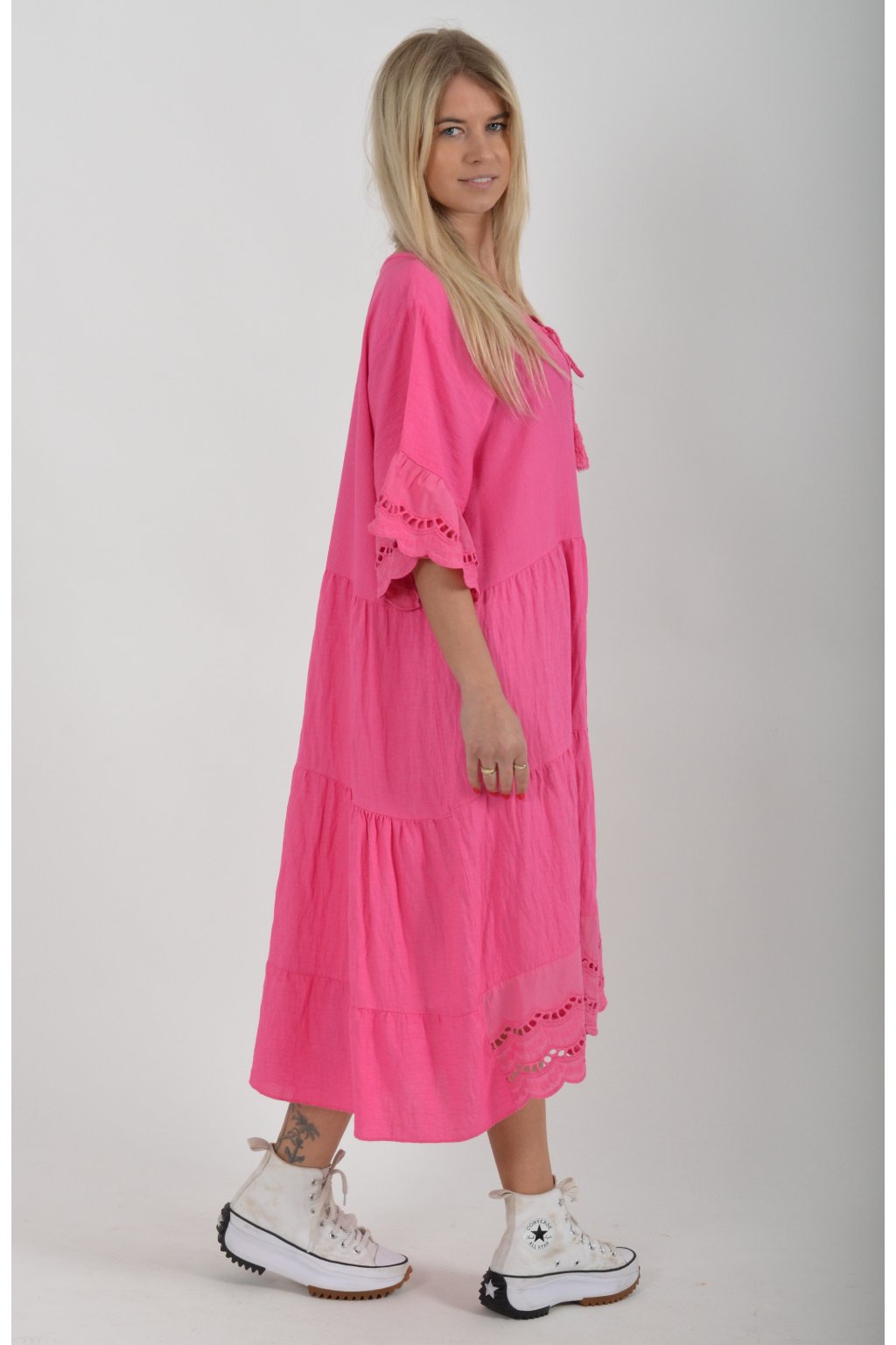 Jednobarevné šaty s krátkým rukávem, který je zdobený krajkou. Šaty jsou áčkového střihu a jsou vyrobené z lehounkého materiálu.