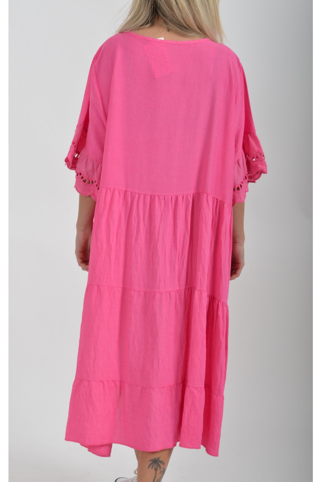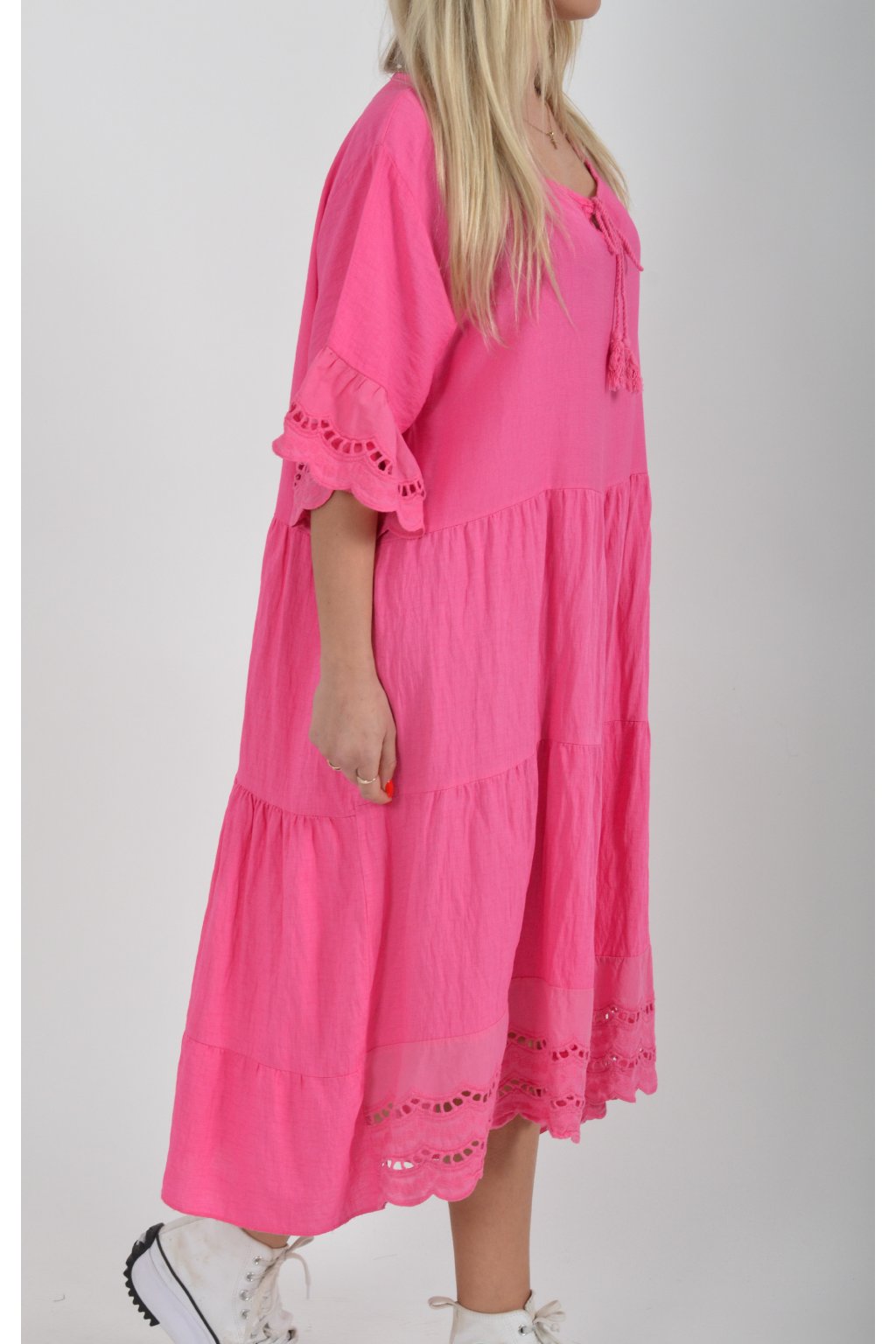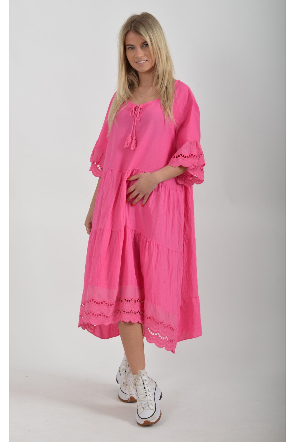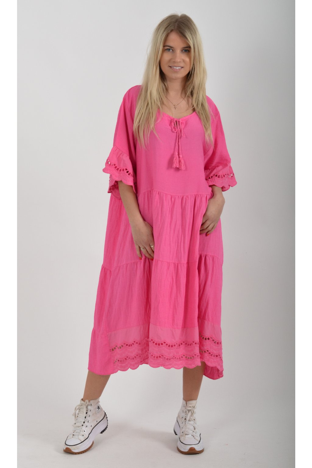 Jednobarevné šaty s krátkým rukávem, který je zdobený krajkou. Šaty jsou áčkového střihu a jsou vyrobené z lehounkého materiálu.