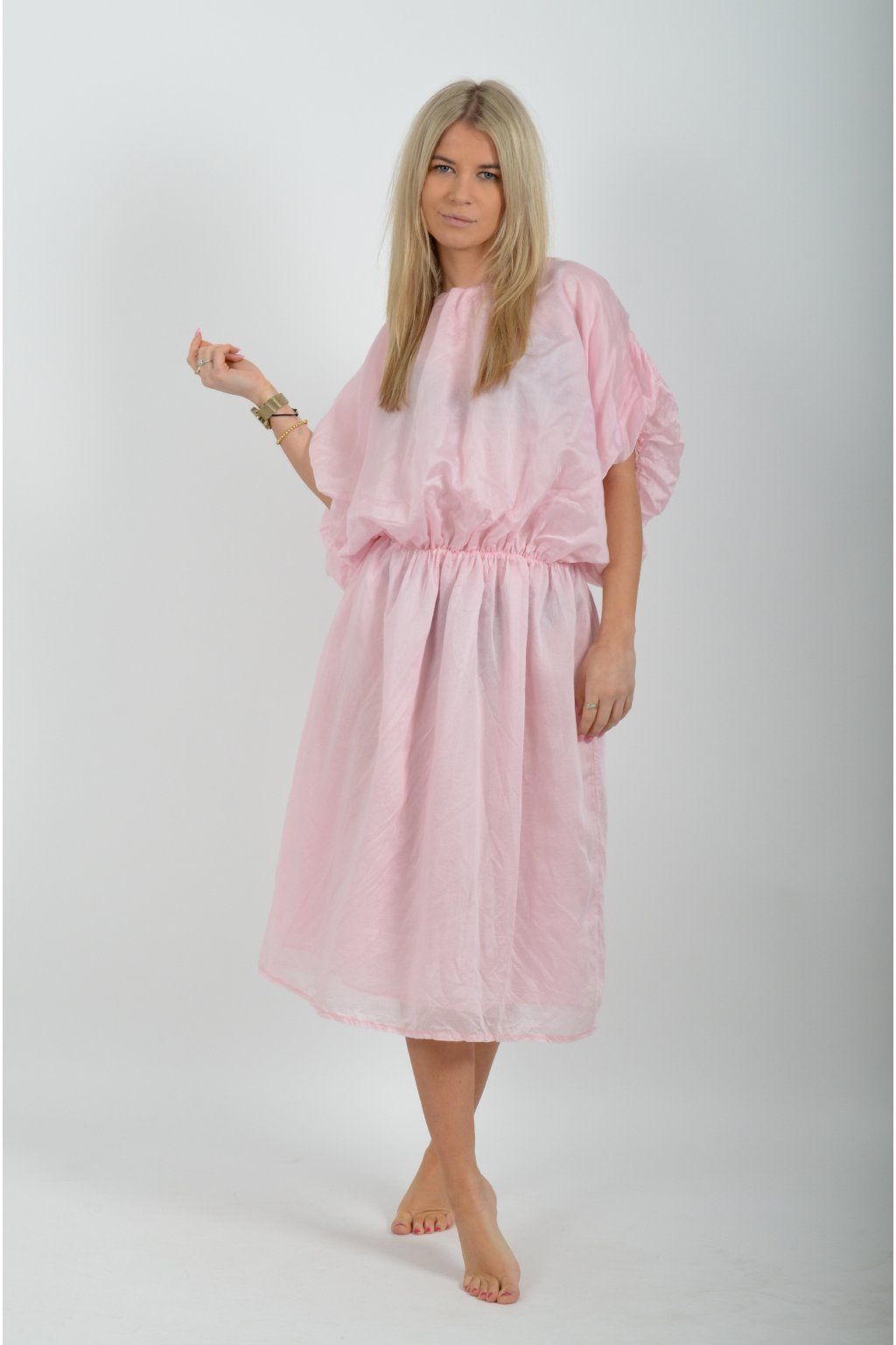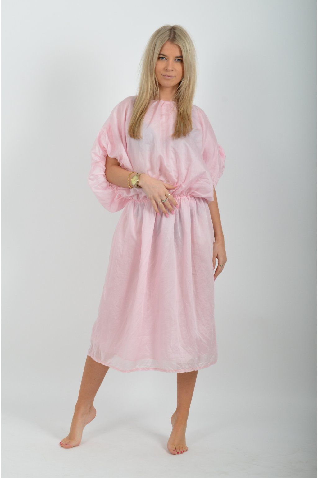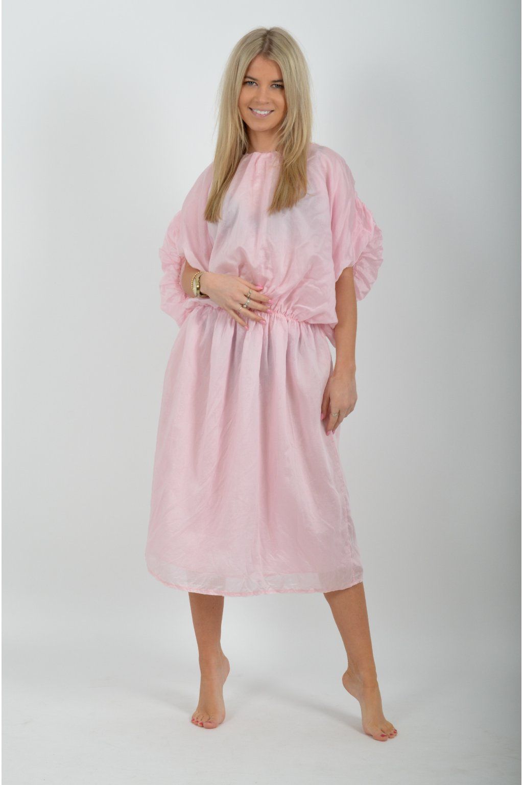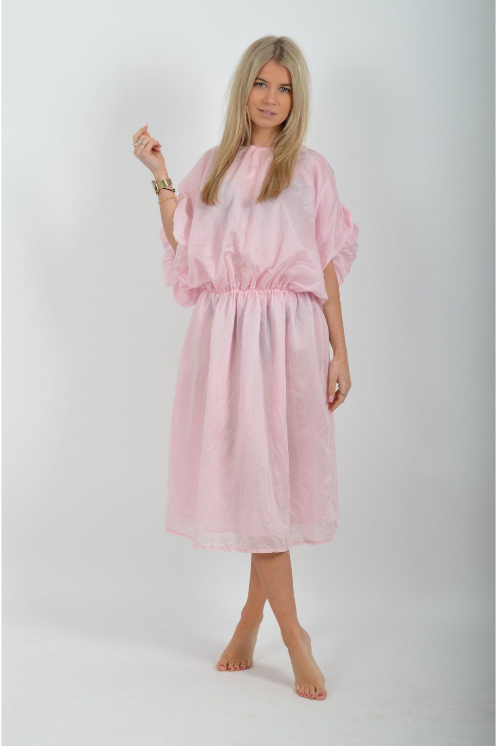 Jednobarevné dlouhé šaty vyrobené z velice odlehčeného materiálu. V pase a na konci rukávků mají šaty zapracované gumy. Jsou vhodné na volnočasové i společenské události. Materiál je mačkavý.