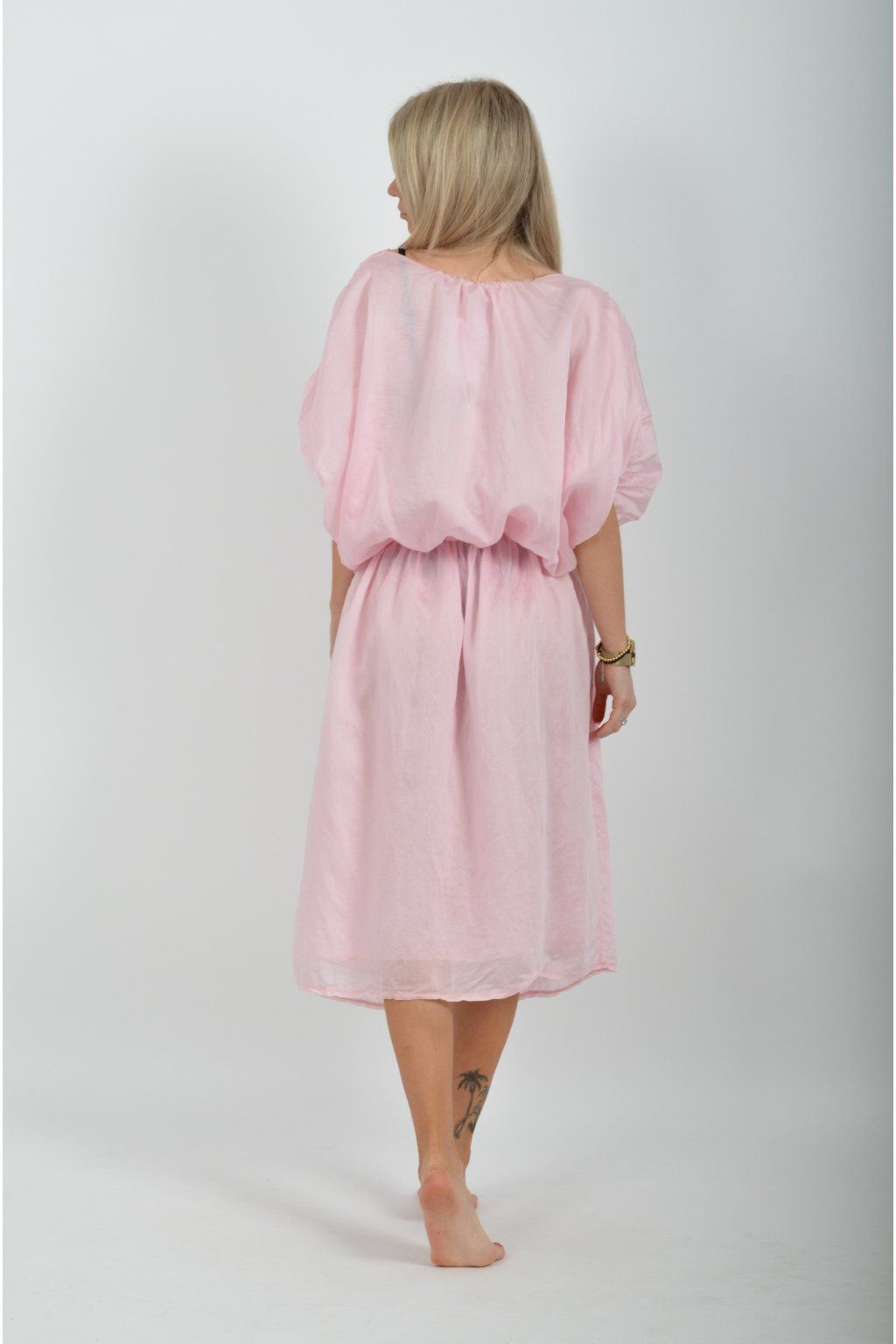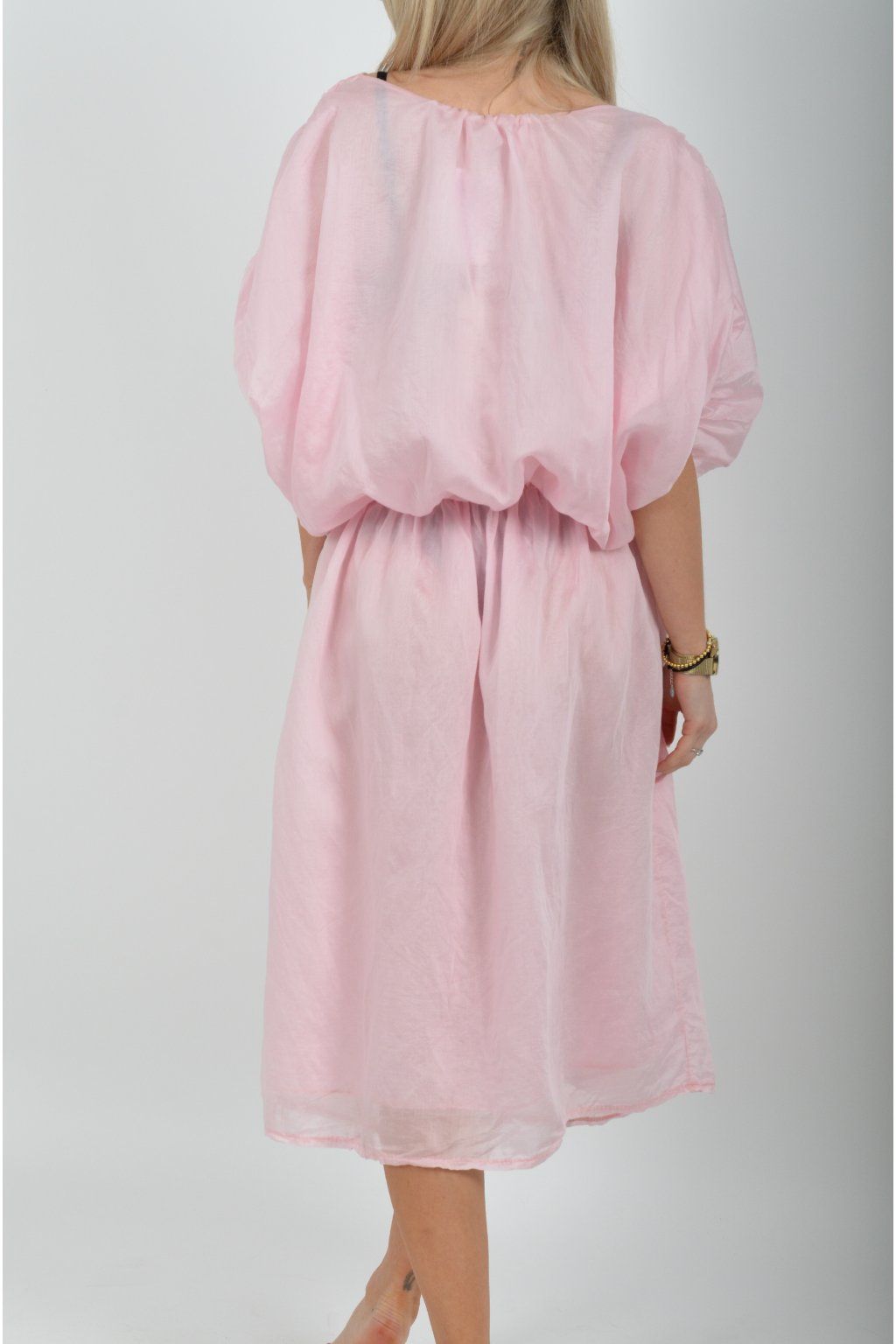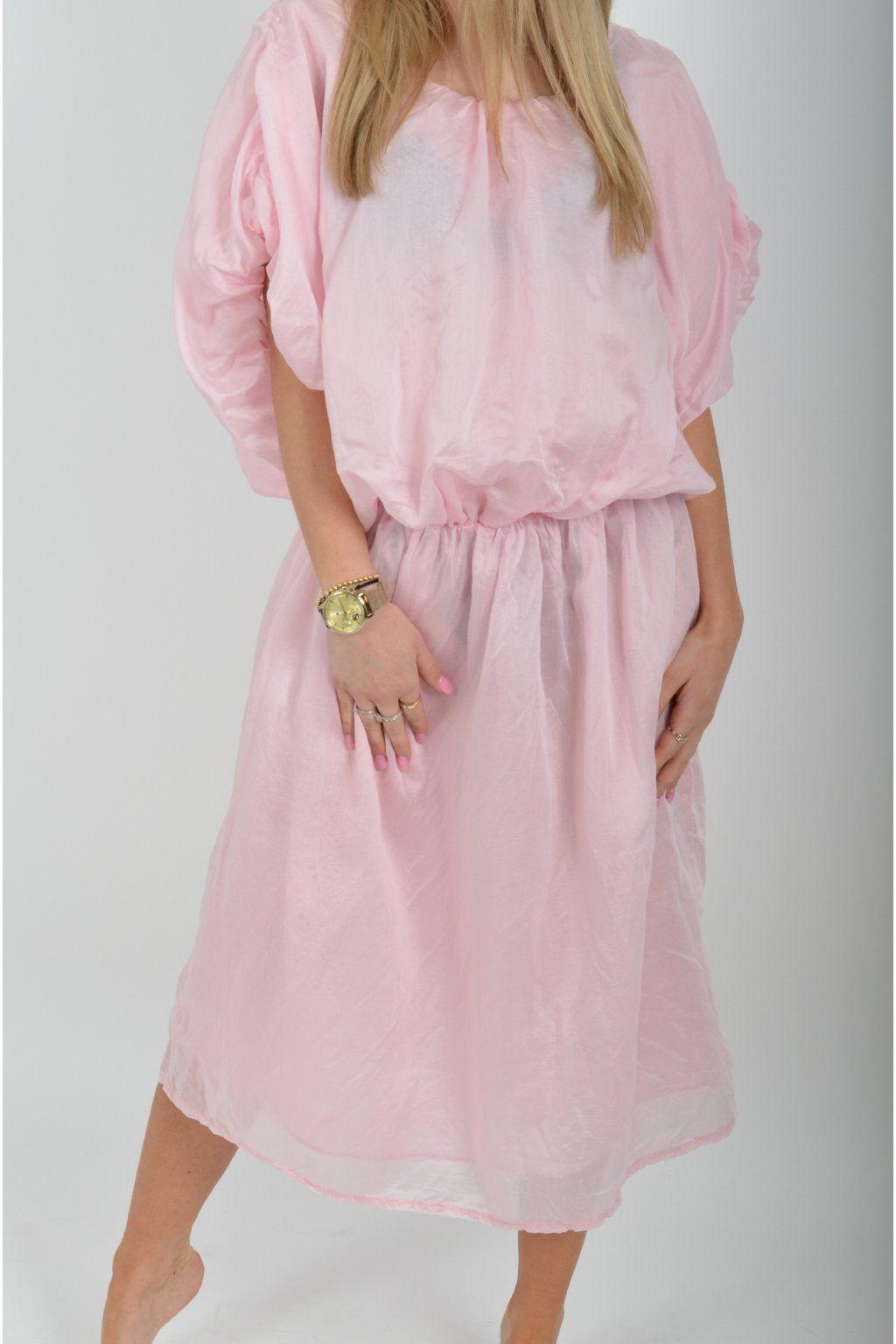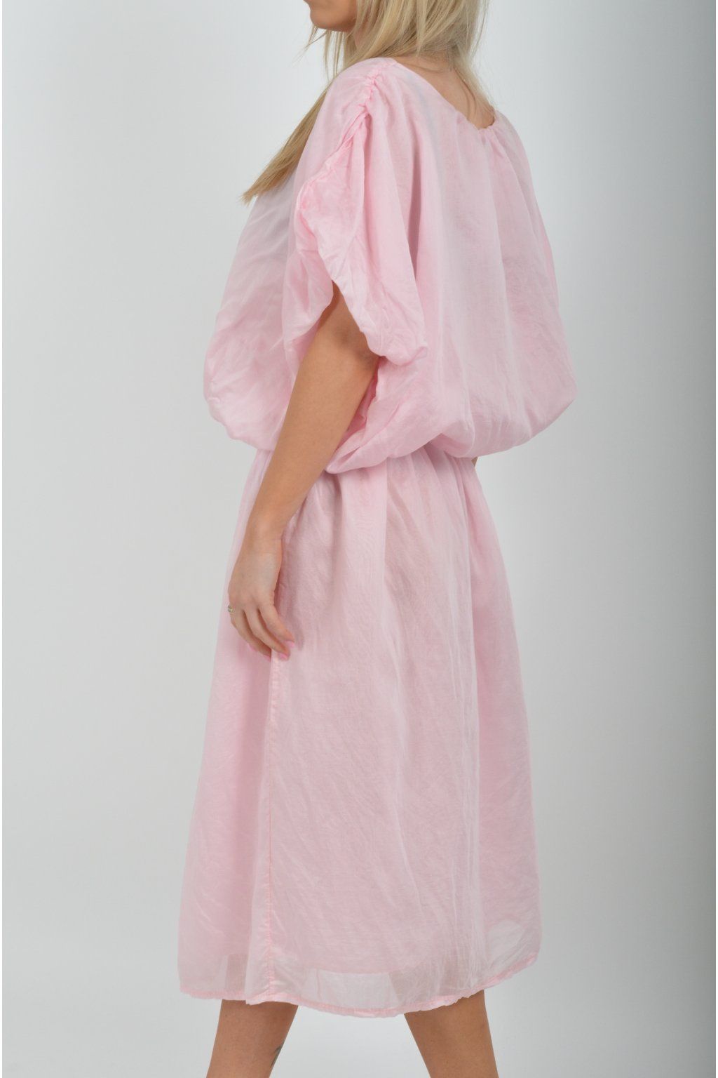 Jednobarevné dlouhé šaty vyrobené z velice odlehčeného materiálu. V pase a na konci rukávků mají šaty zapracované gumy. Jsou vhodné na volnočasové i společenské události. Materiál je mačkavý.
