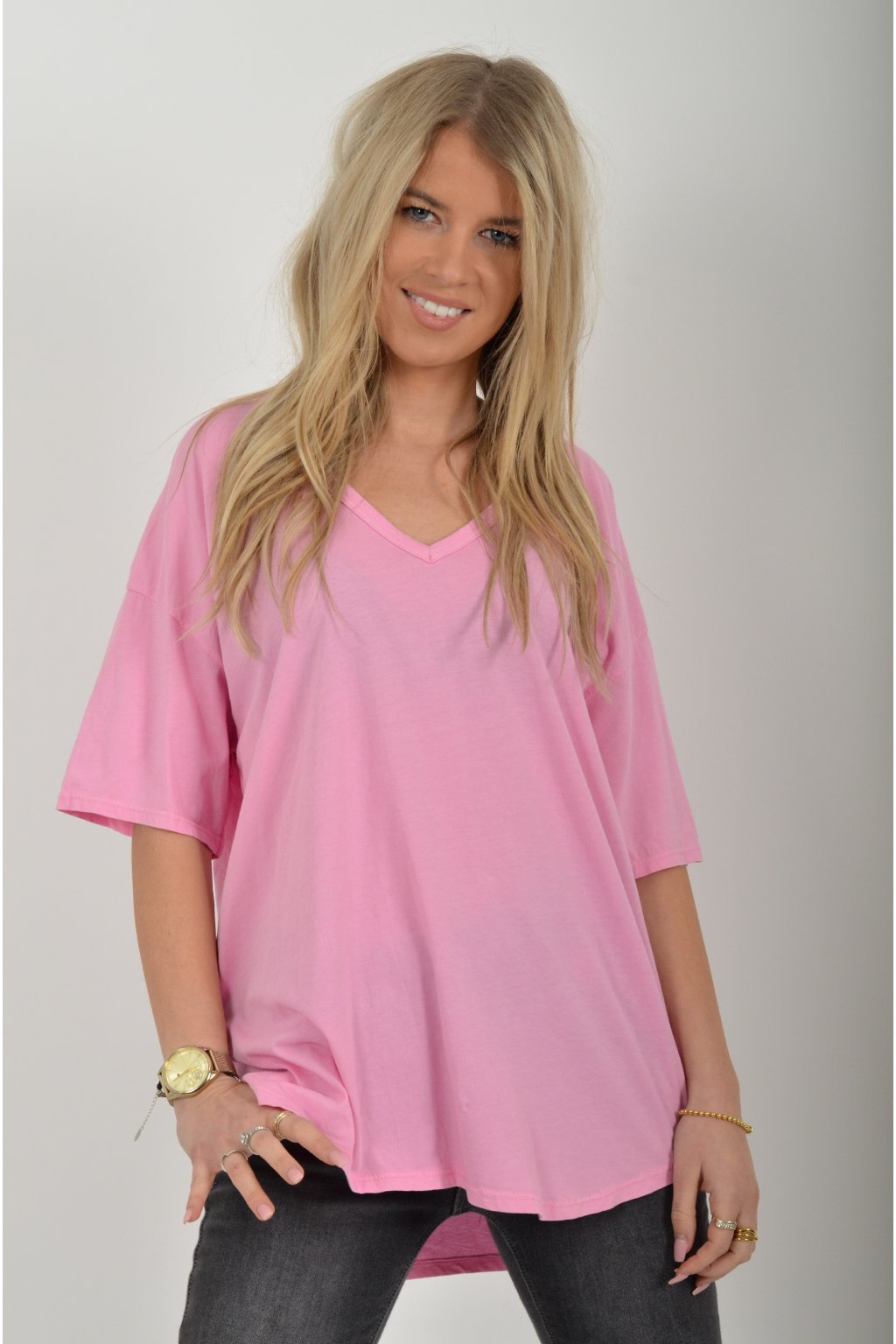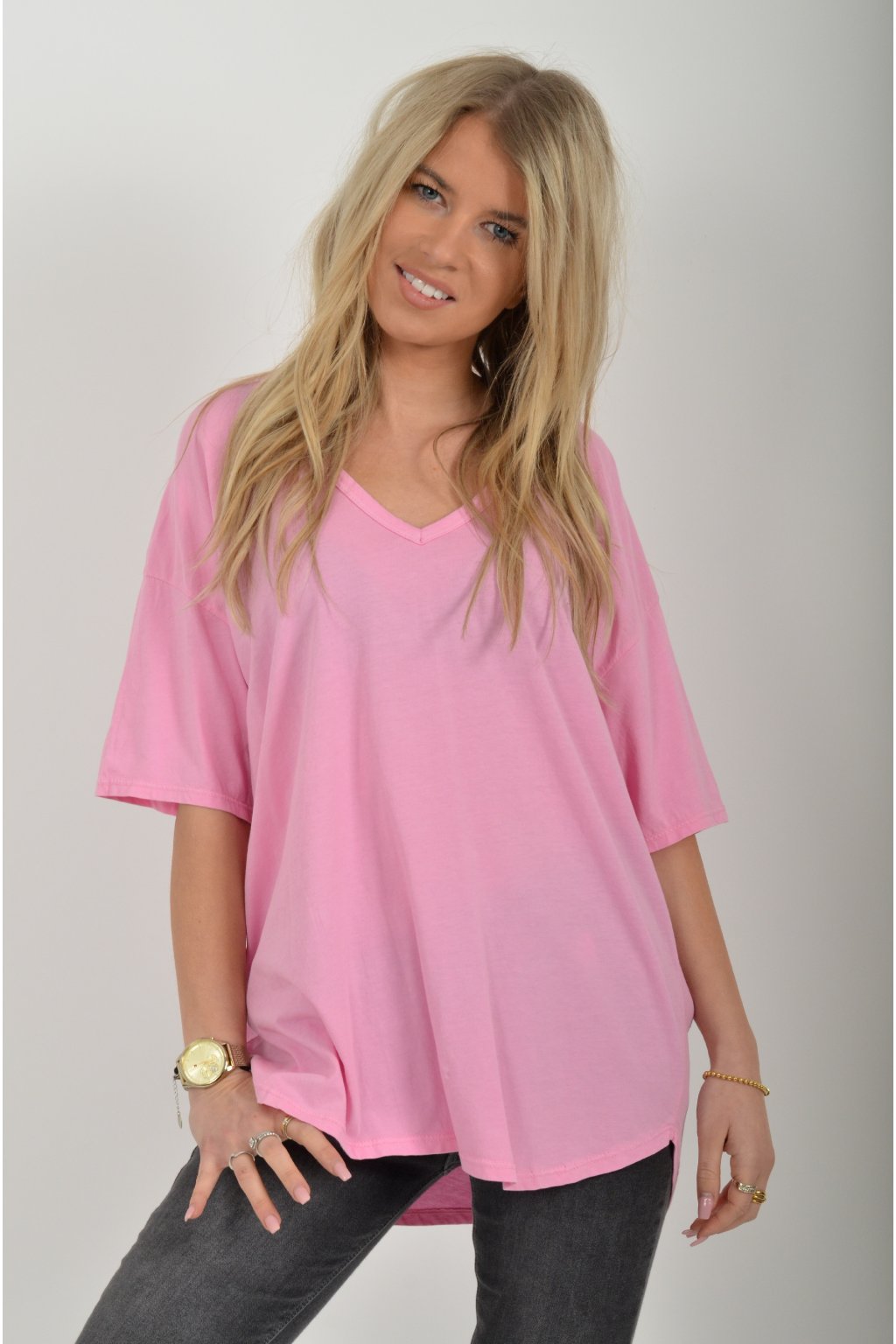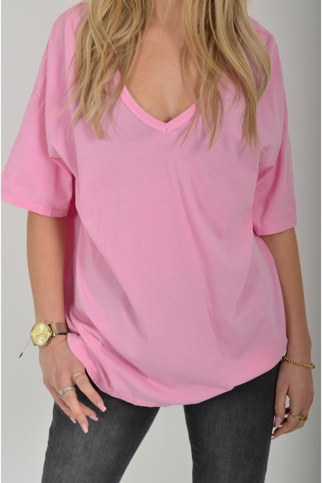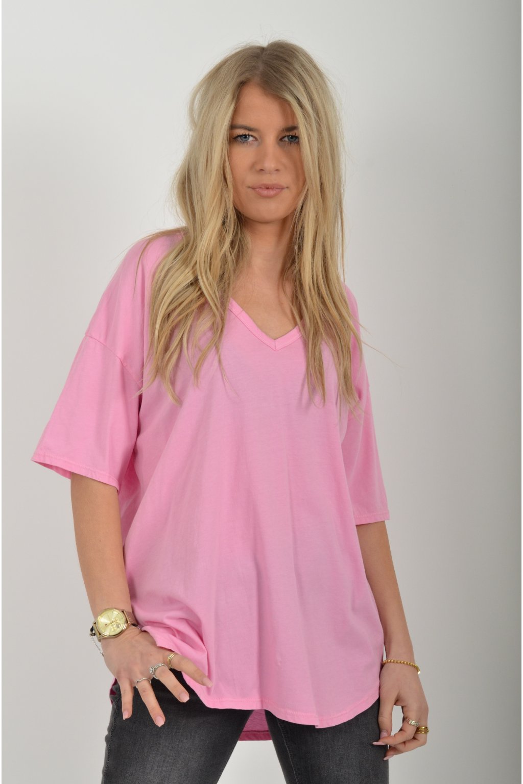Jednobarevné tričko s krátkým rukávem a výstřihem do V. Zadní část trička je delší než přední. Je vyrobené z velice lehké, měkké a příjemné bavlny.