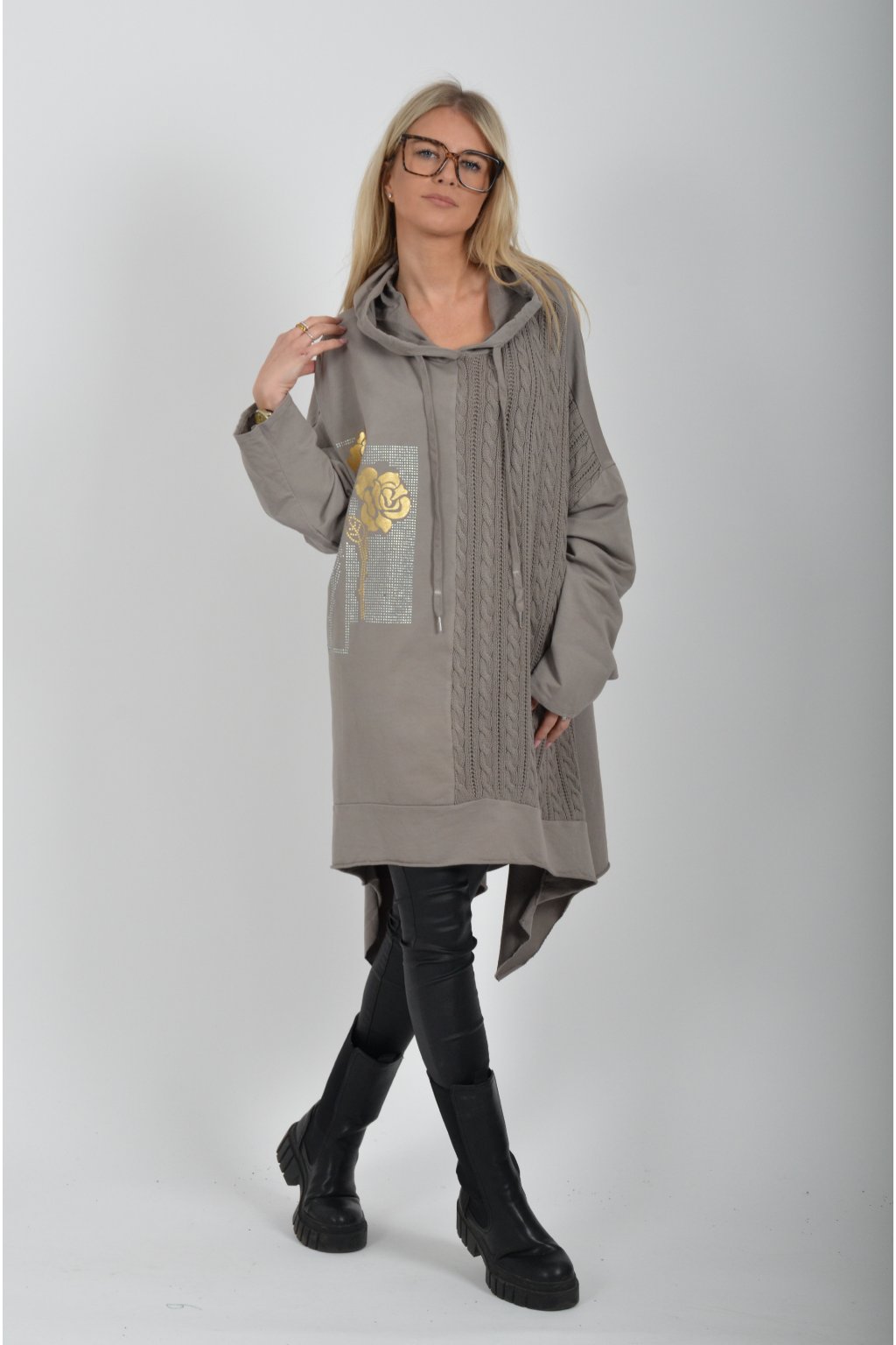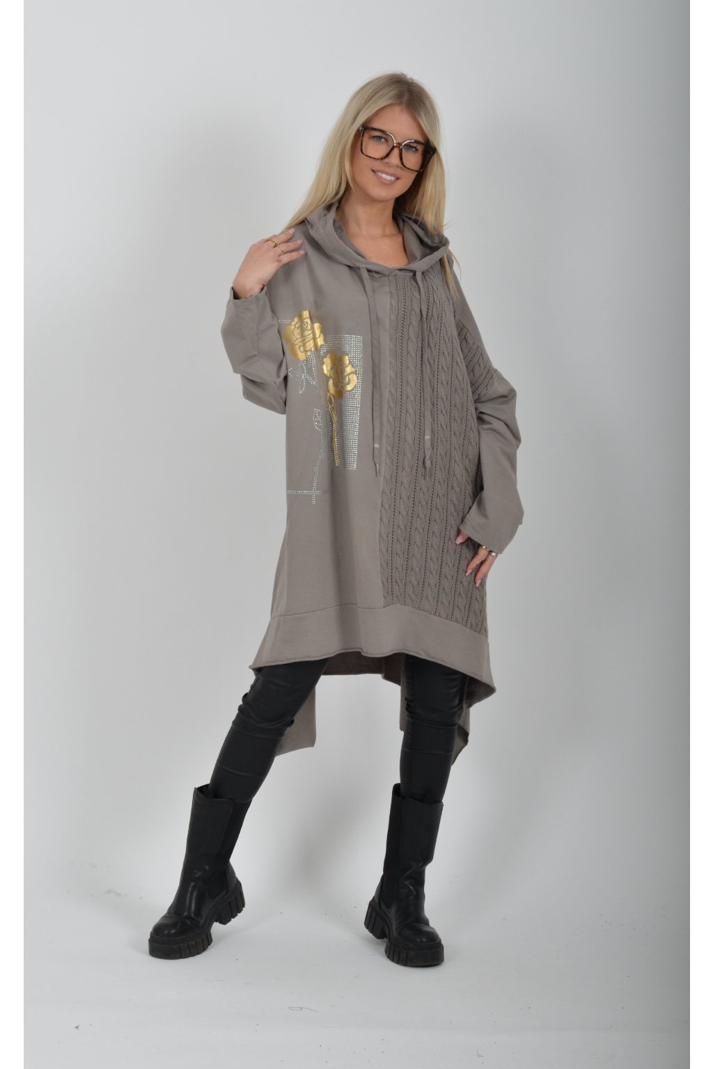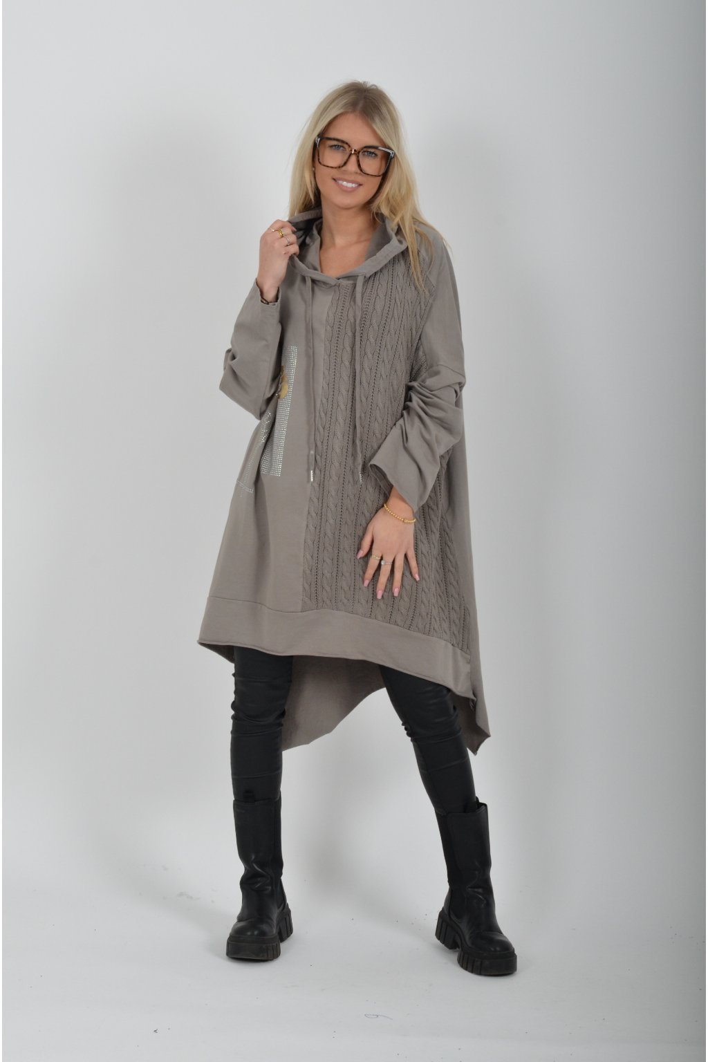 Volnější tunika áčkového střihu s materiálovou kombinací příjemné bavlny a pleteniny. Tunika má dlouhý rukáv a kapuci. Je vhodná jak k džínům, tak i legínám.