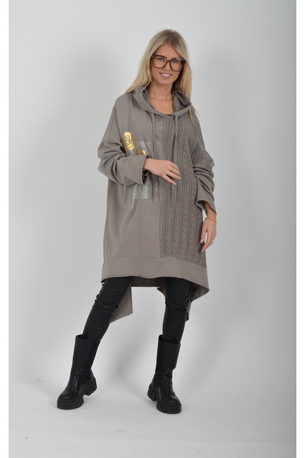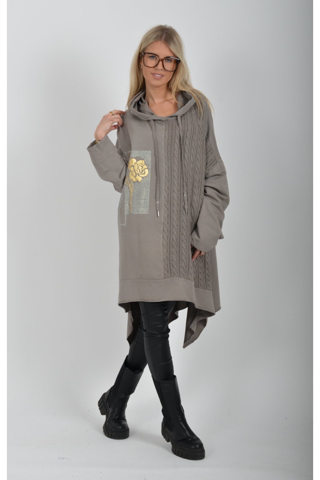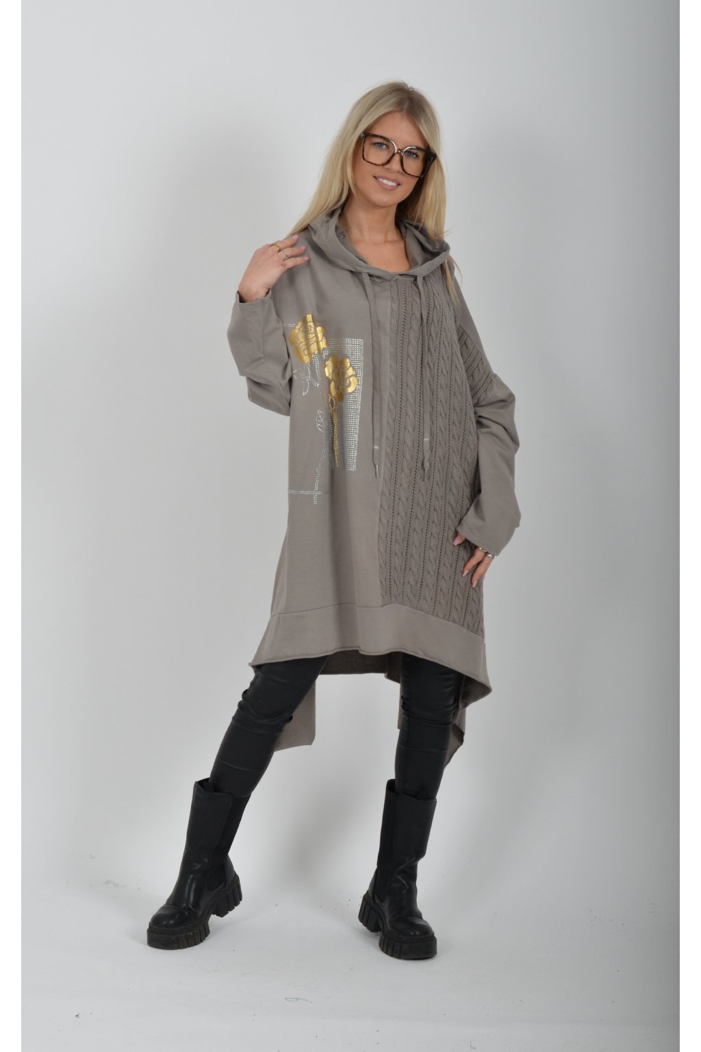 Volnější tunika áčkového střihu s materiálovou kombinací příjemné bavlny a pleteniny. Tunika má dlouhý rukáv a kapuci. Je vhodná jak k džínům, tak i legínám.