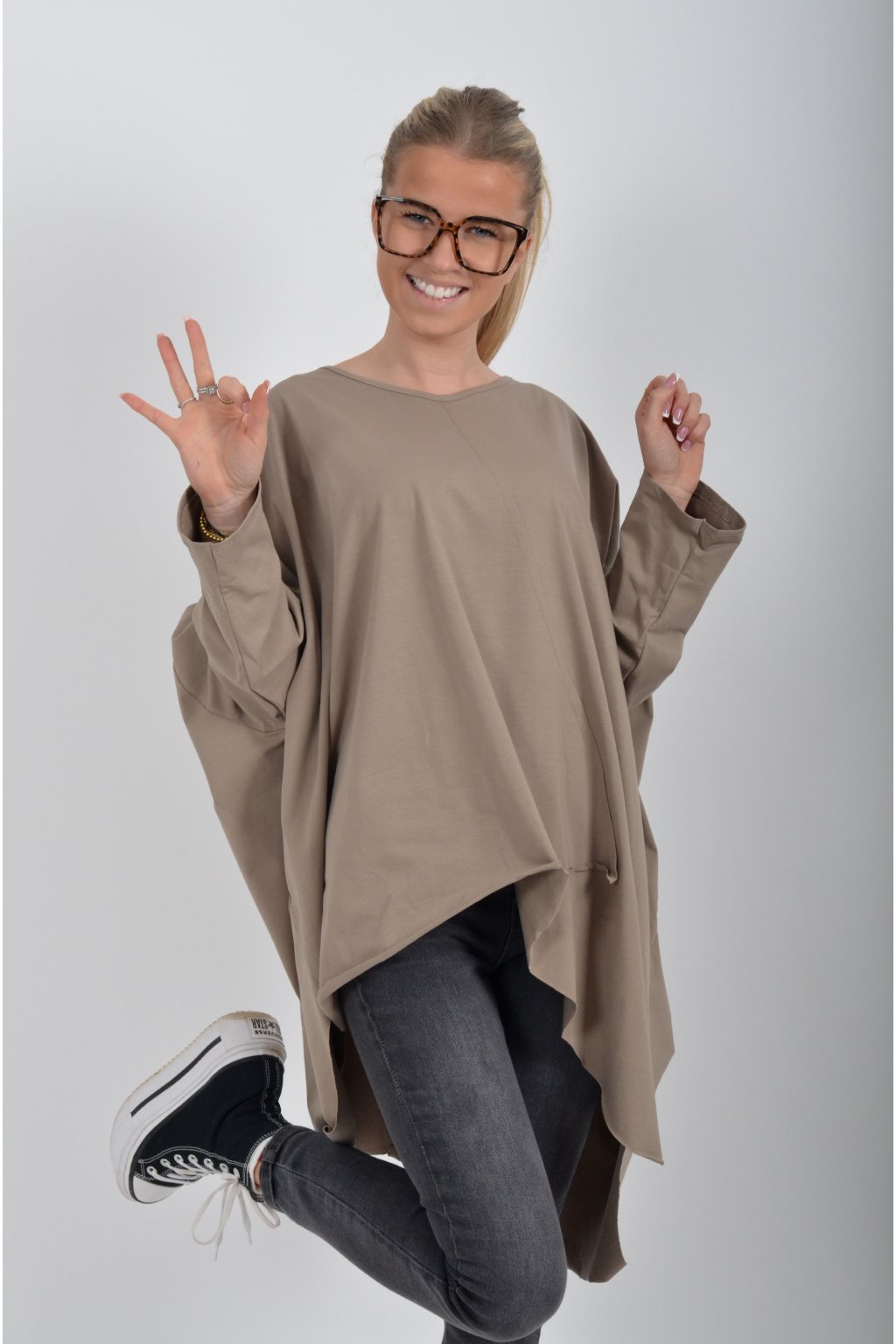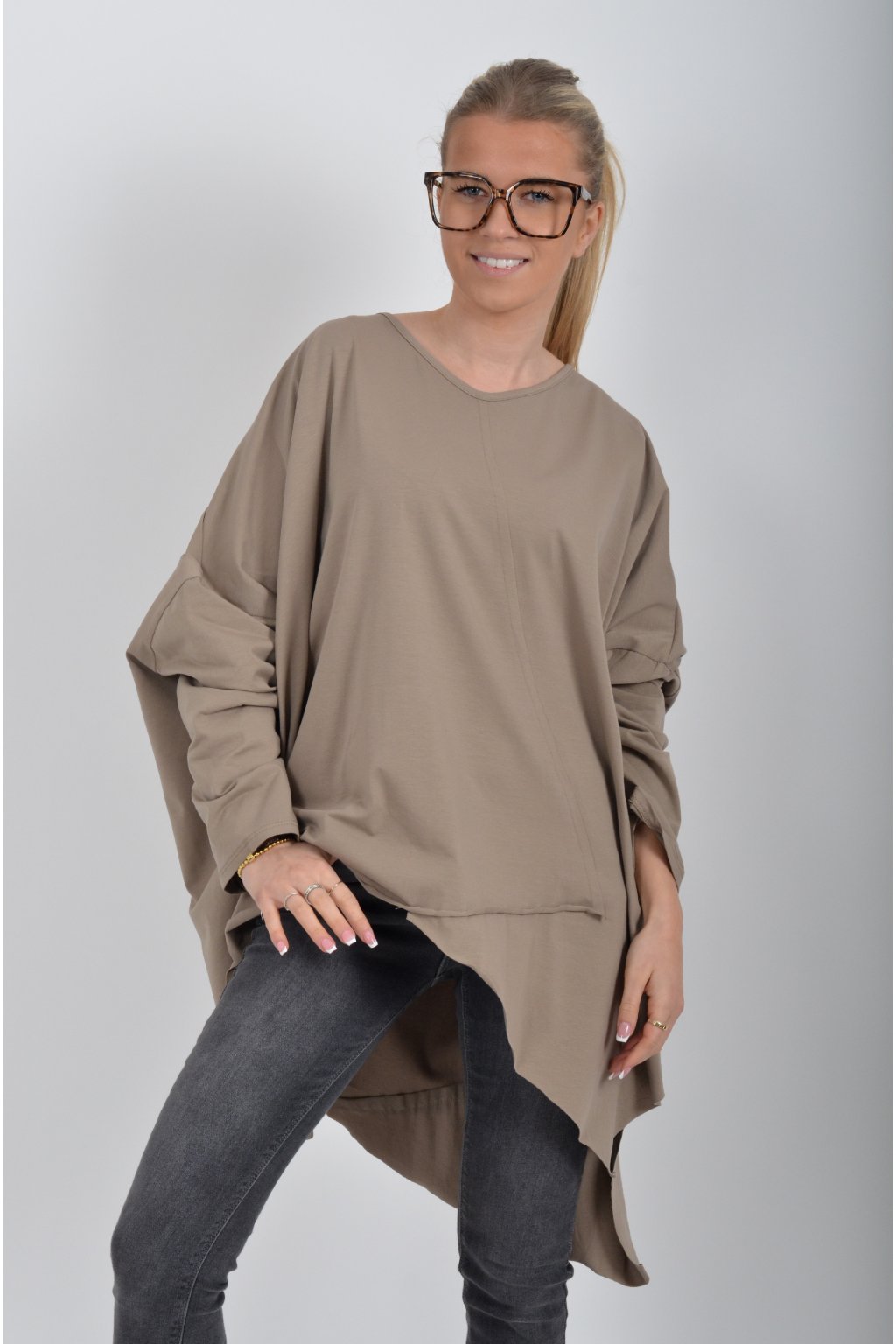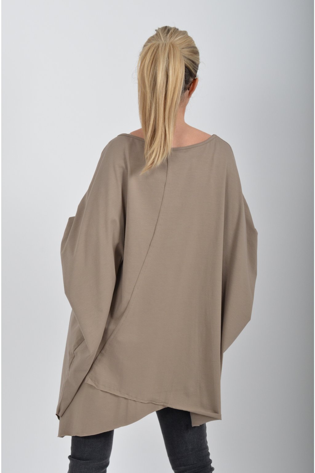 Jednobarevná oversize tunika s dlouhým netopýřím rukávem vyrobená z velice lehké, měkké a příjemné bavlny. Spodní část halenky je asymetricky střižena.