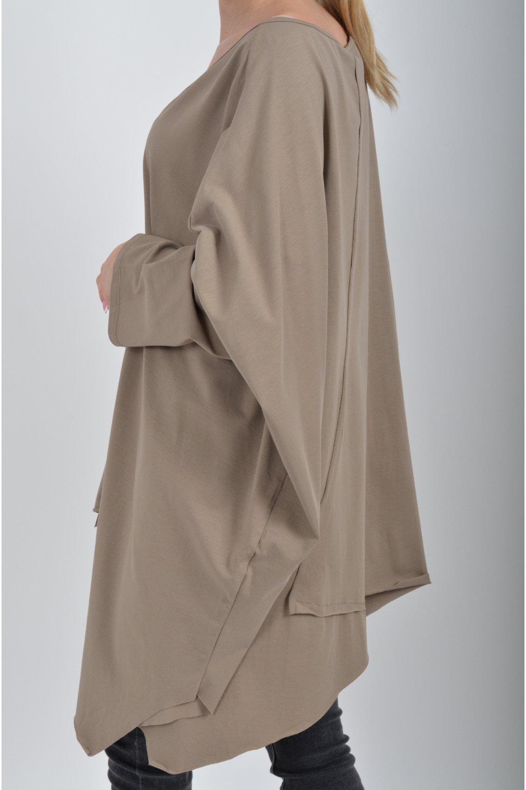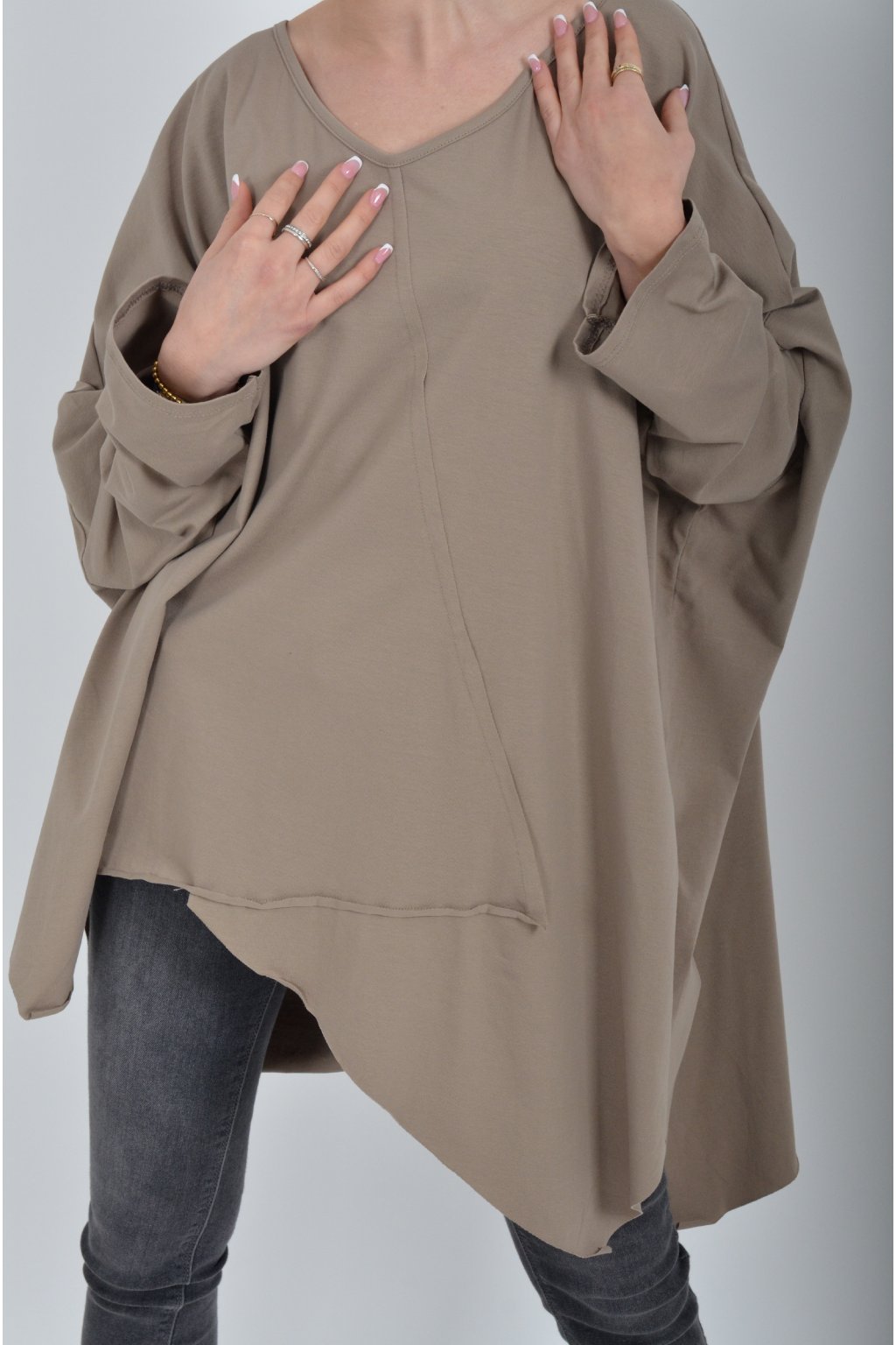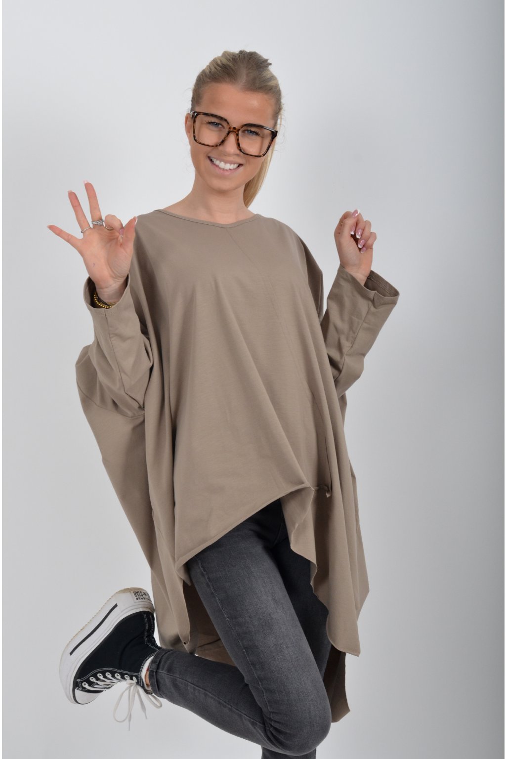 Jednobarevná oversize tunika s dlouhým netopýřím rukávem vyrobená z velice lehké, měkké a příjemné bavlny. Spodní část halenky je asymetricky střižena.