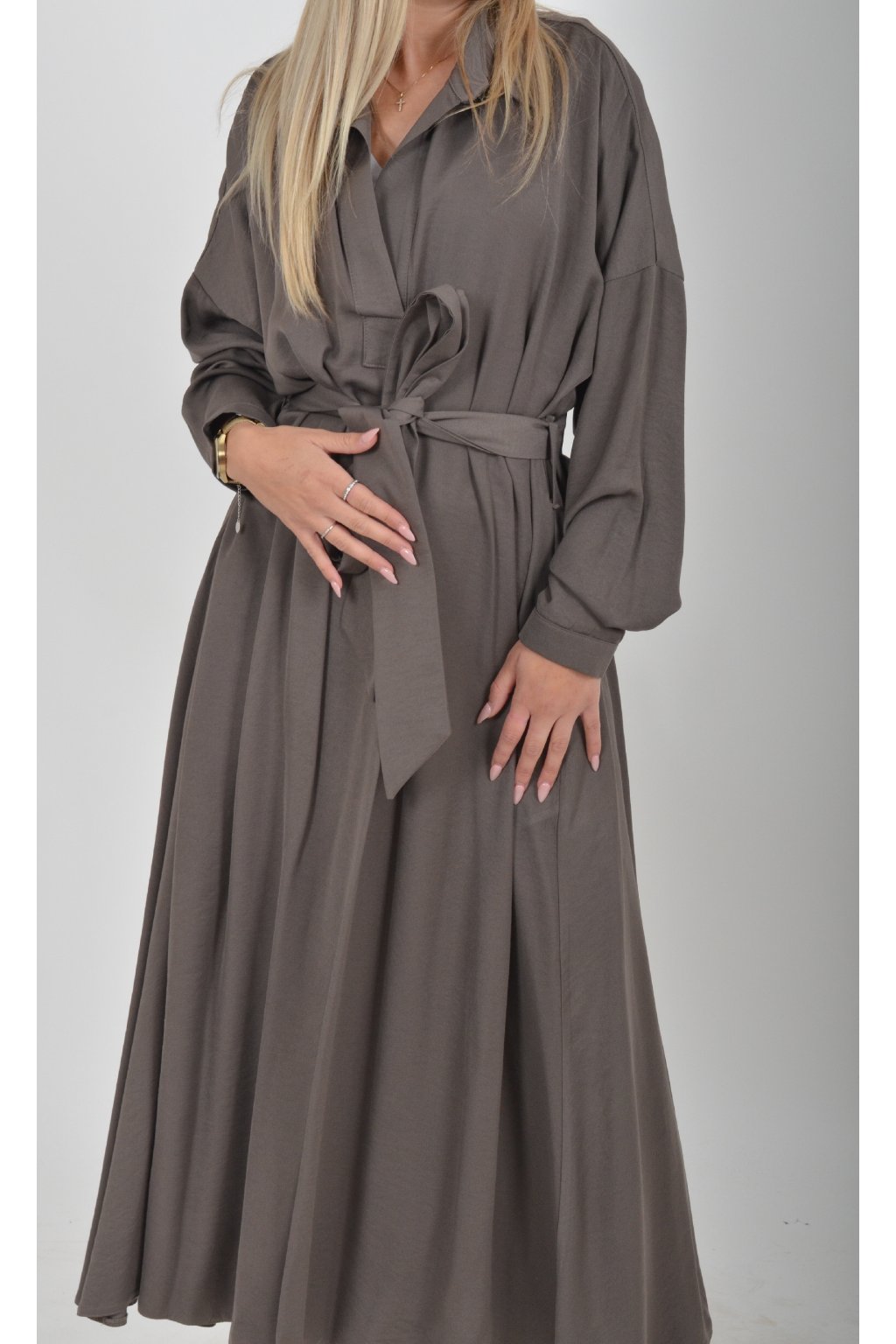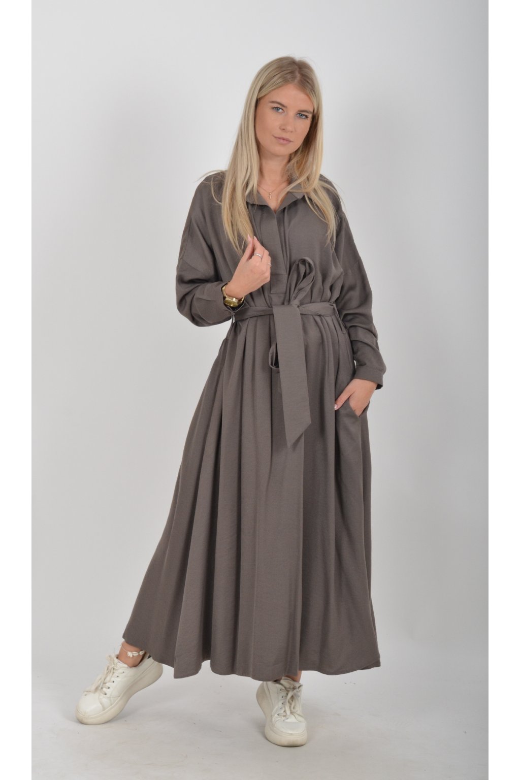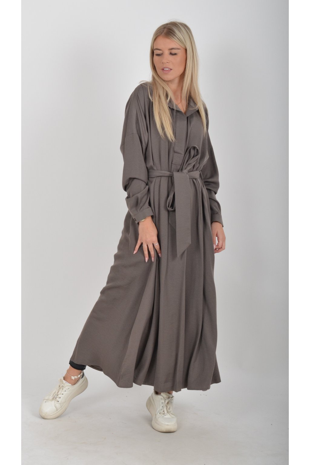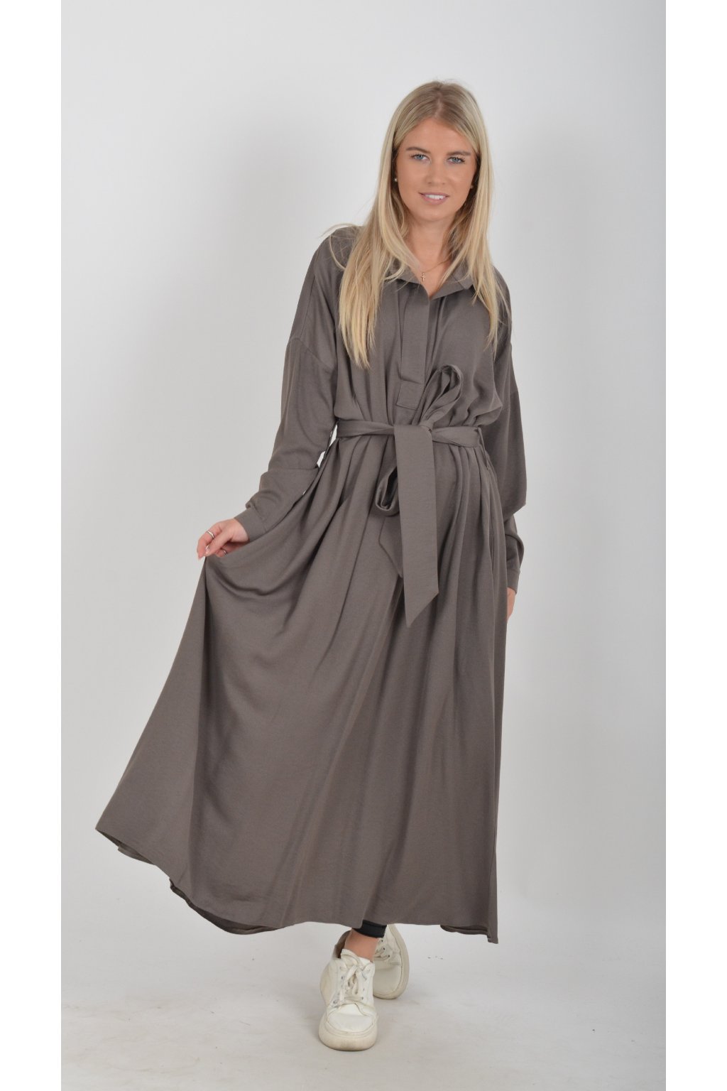 Dlouhé elegantní šaty áčkového střihu s dlouhým rukávem a páskem kůže. Šaty jsou z velice příjemného materiálu.