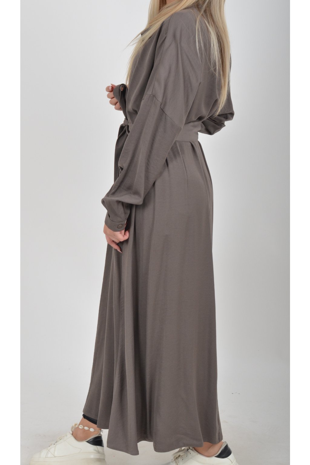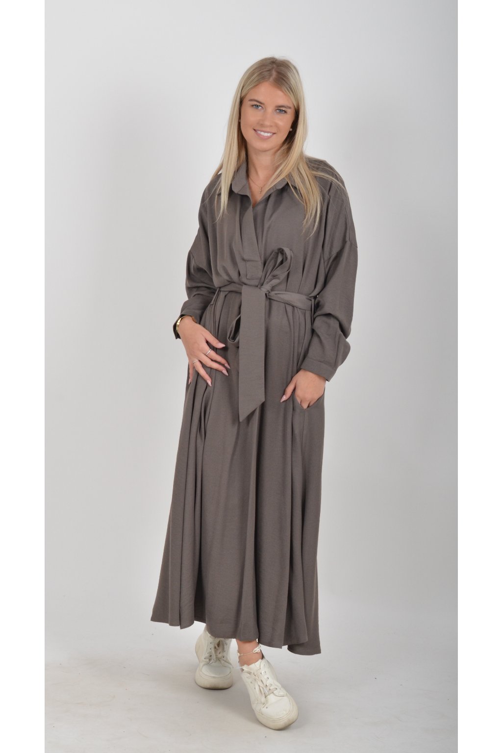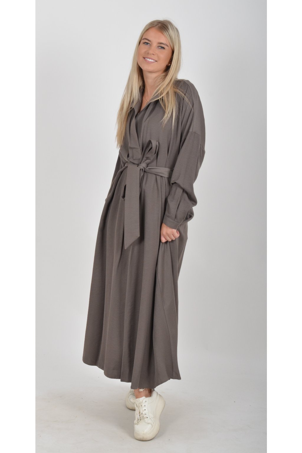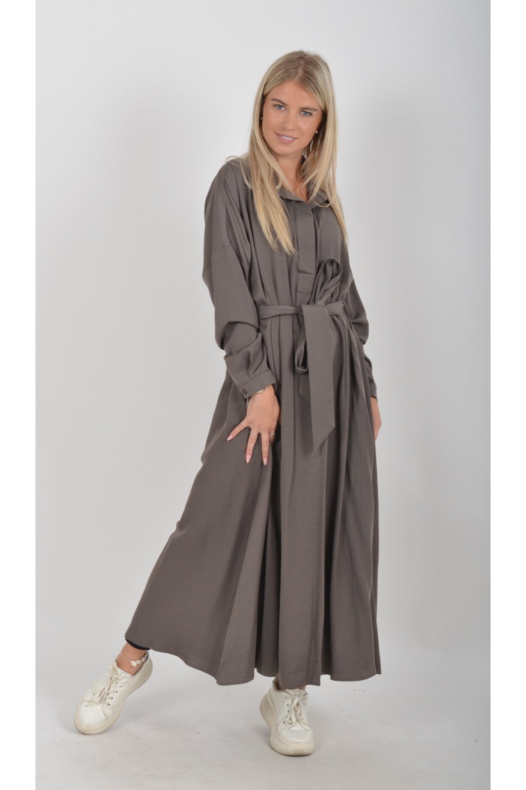 Dlouhé elegantní šaty áčkového střihu s dlouhým rukávem a páskem kůže. Šaty jsou z velice příjemného materiálu.