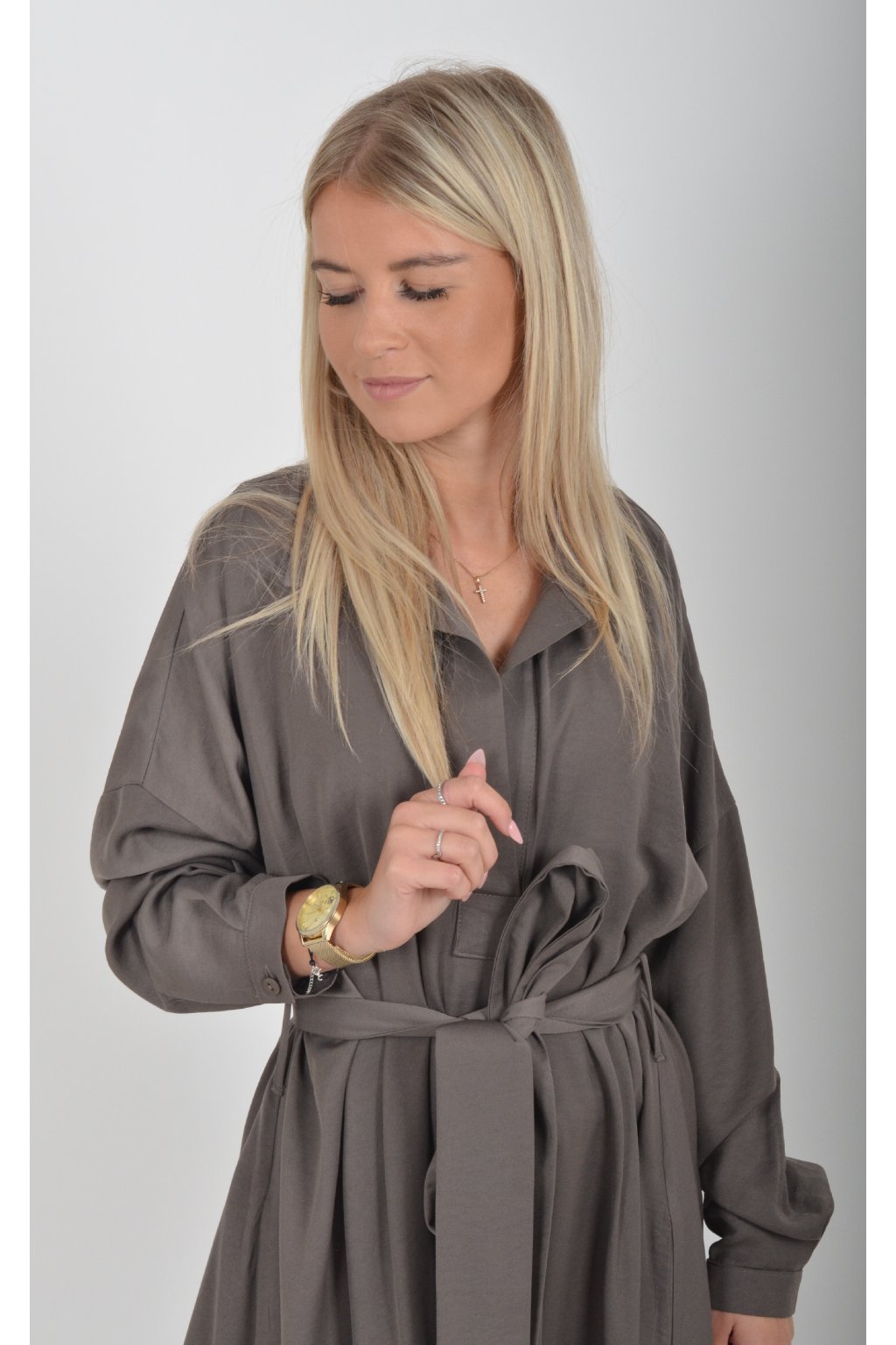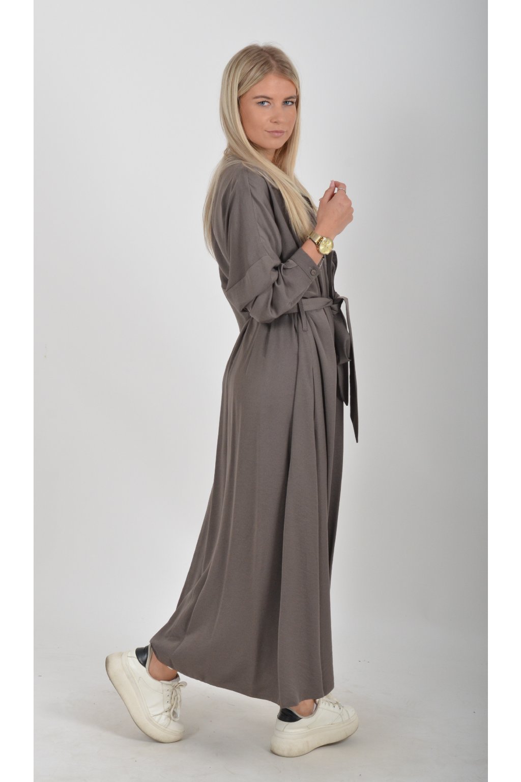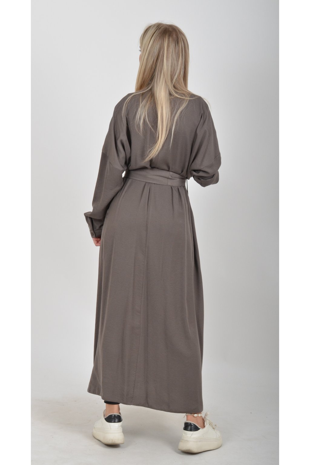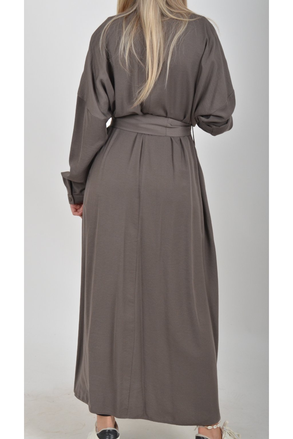 Dlouhé elegantní šaty áčkového střihu s dlouhým rukávem a páskem kůže. Šaty jsou z velice příjemného materiálu.