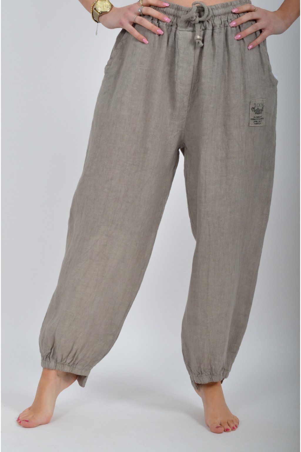 Lněné kalhoty s kapsami na bocích. Jsou vhodné pro každodenní nošení. V pase je zapracovaná guma a tkanice pro libovolné stažení.