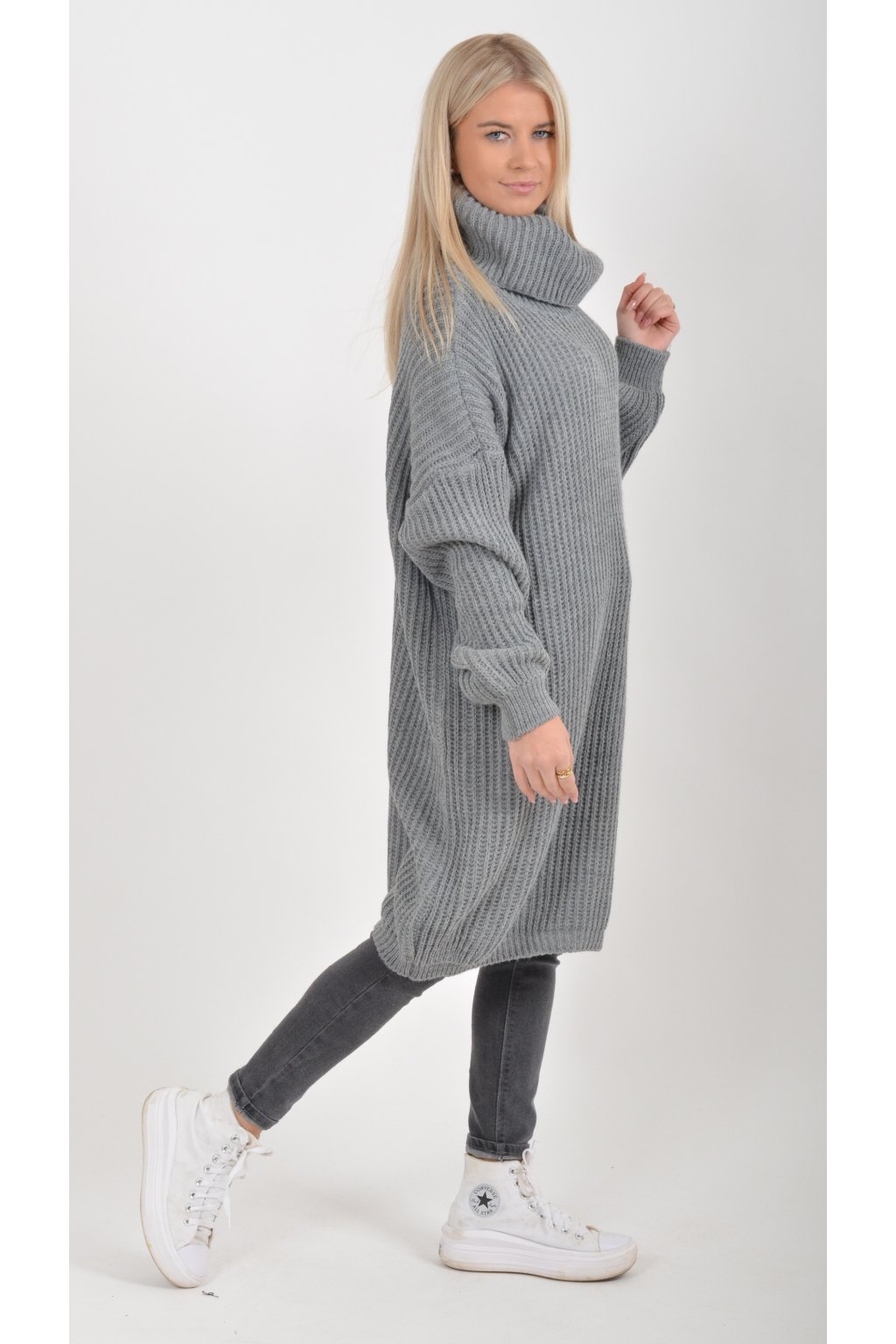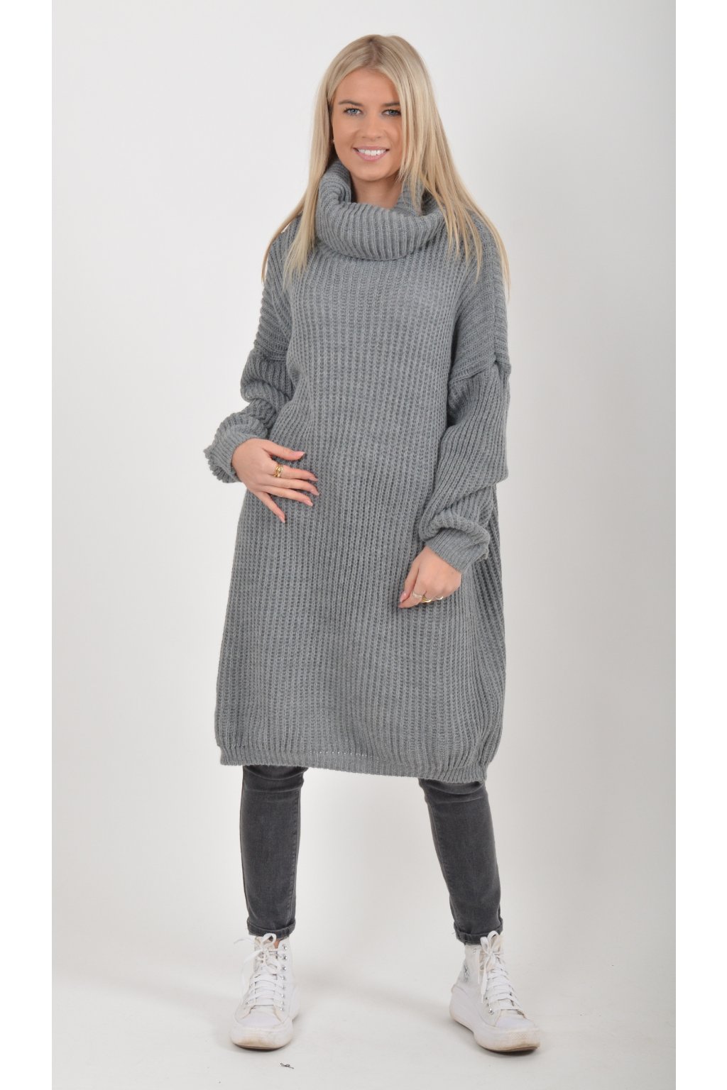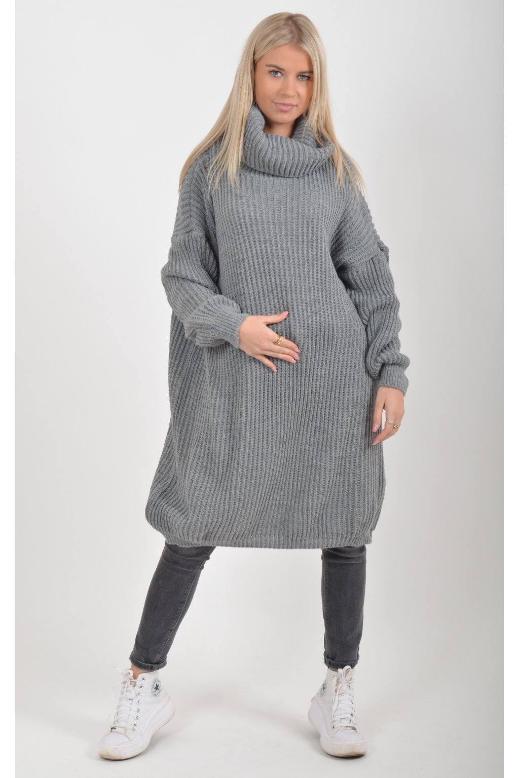 Jednobarevné pletené šaty s rolákem vyrobené z příjemného a nekousavého materiálu.