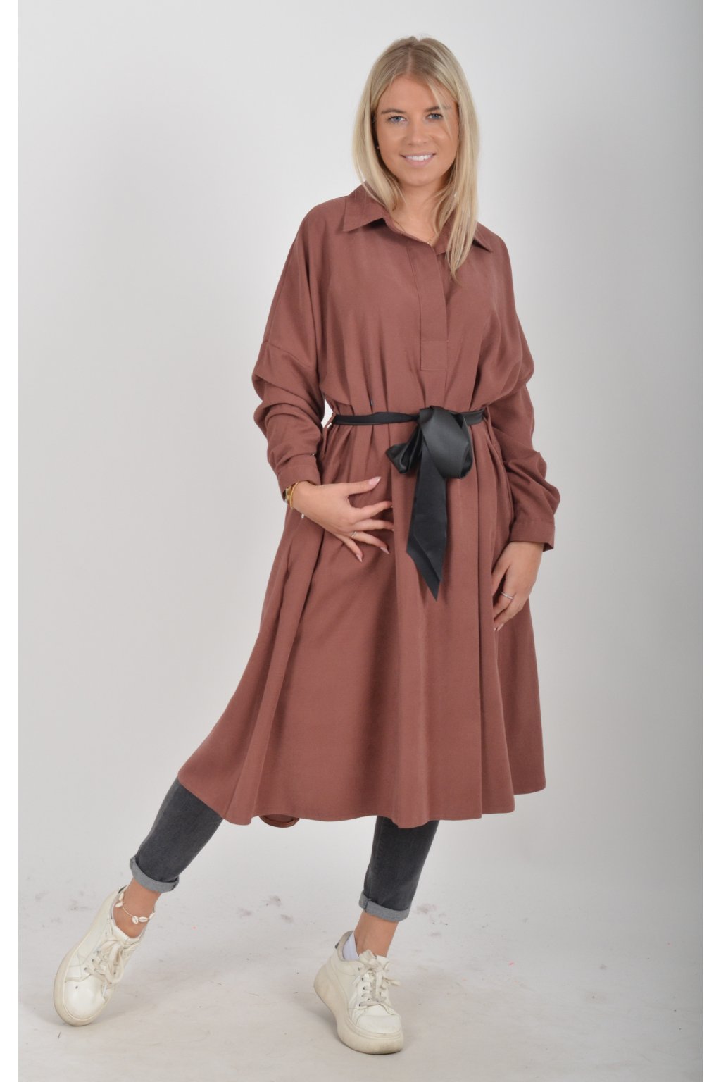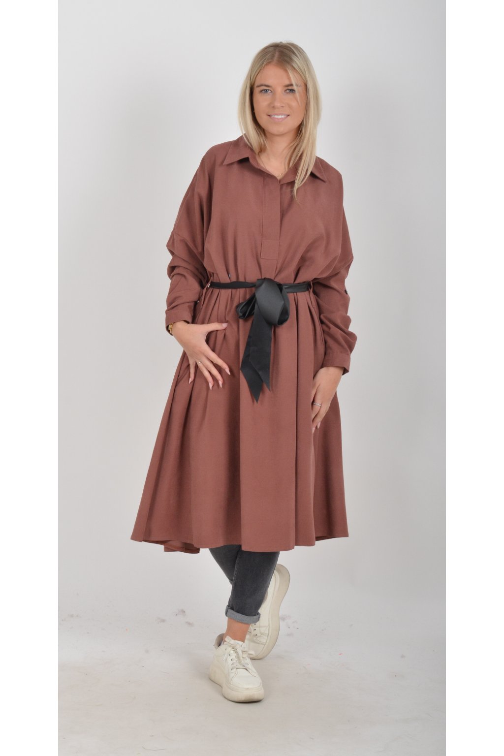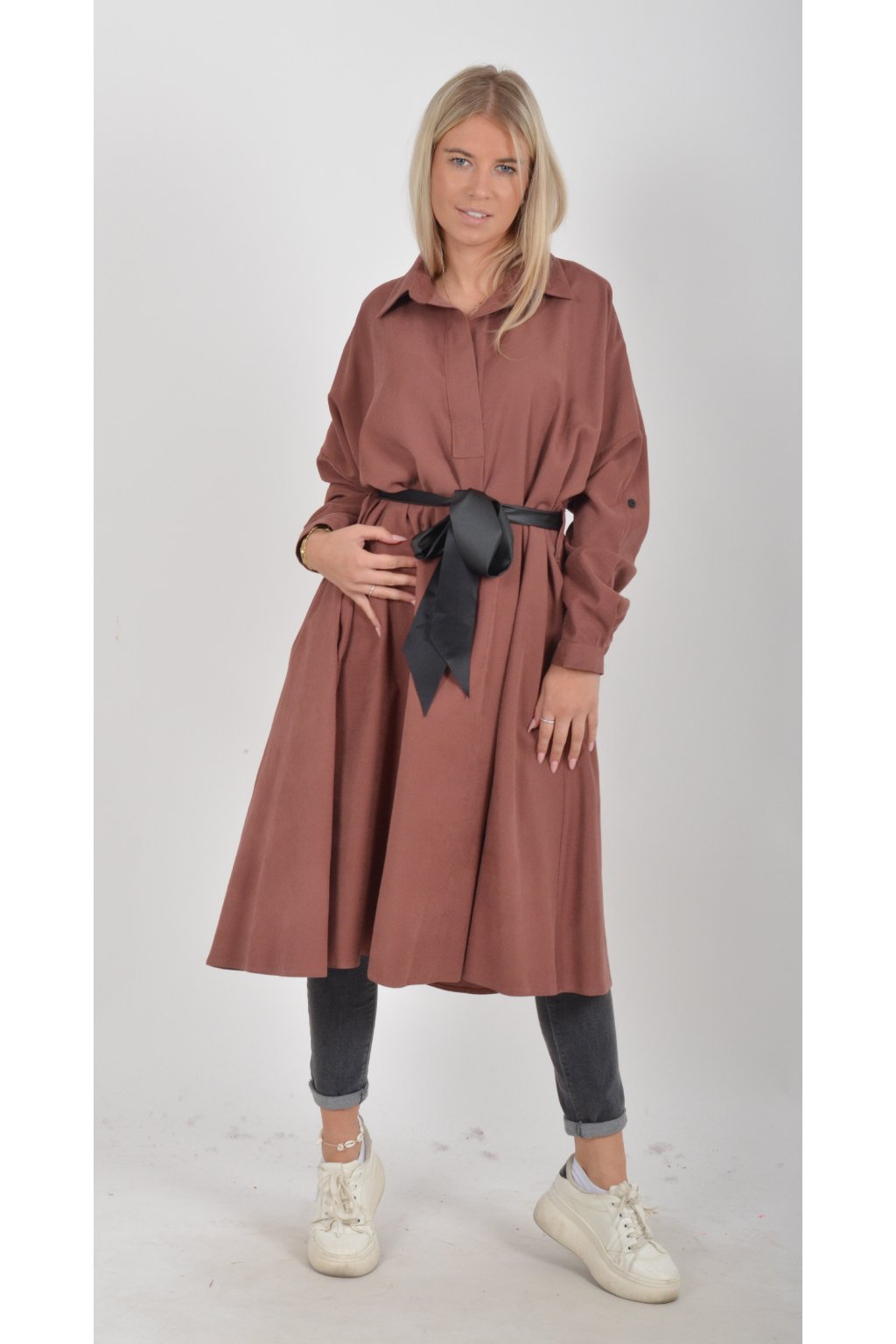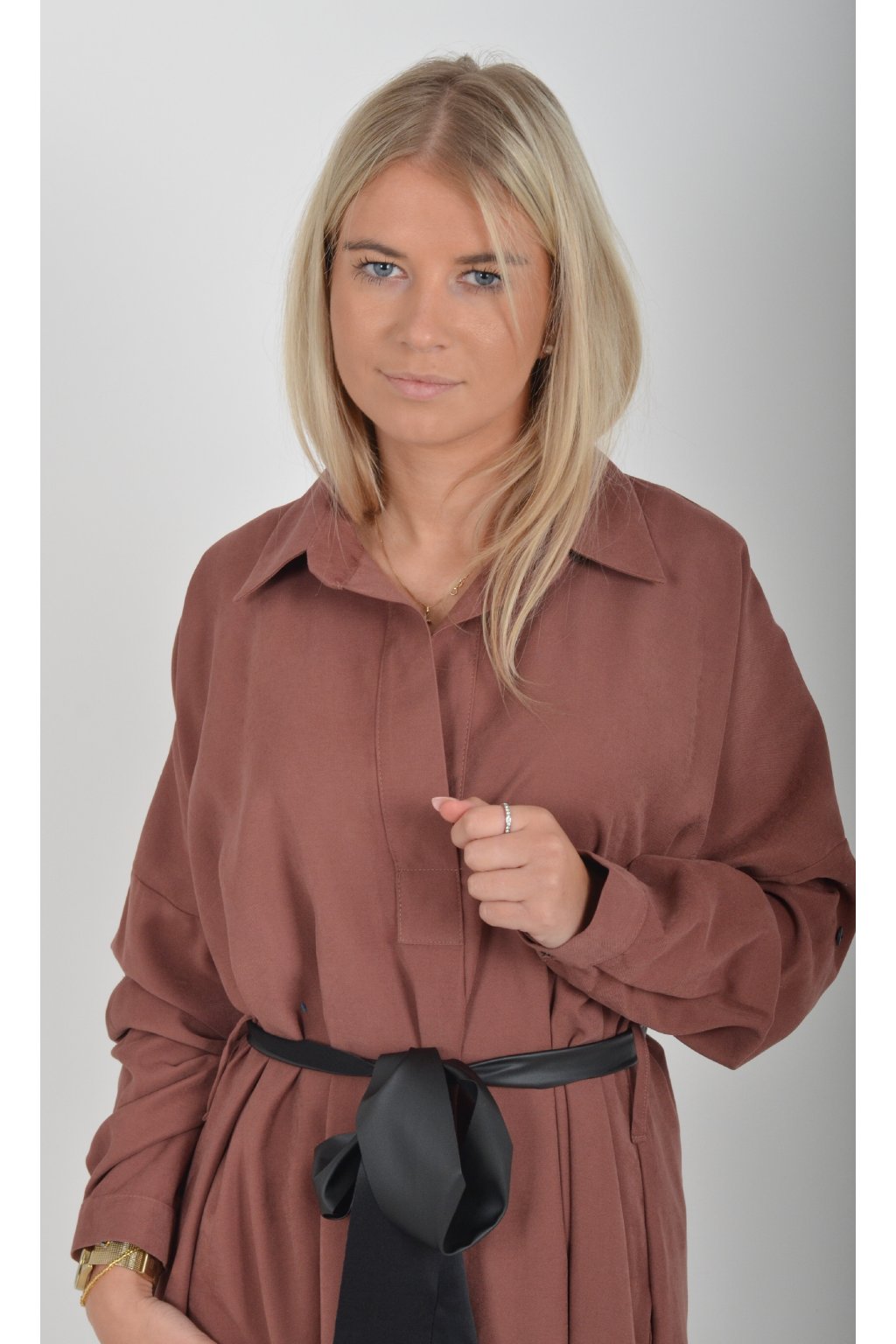 Jednou za dámu, jednou jen tak ven, tyto šaty splní oboje. Mají košilový áčkový střih s rozevlátou sukní, která je v zadní části mírně delší. Šaty mají na bocích kapsy. Rukávy jsou dlouhé, ale dají se zkrátit na knoflíček. Výrazným doplňkem šatů je pásek s imitací kůže, který můžete jakkoliv vázat a kombinovat. K šatům doporučujeme ozdobnou brož nebo šperky z naší kolekce.