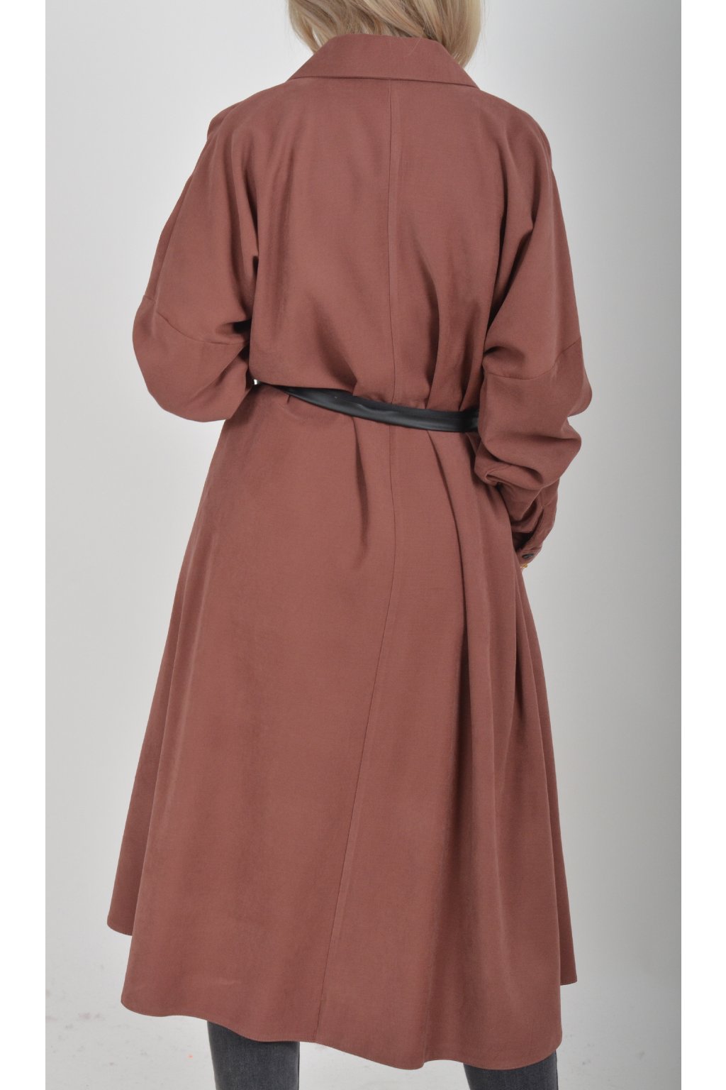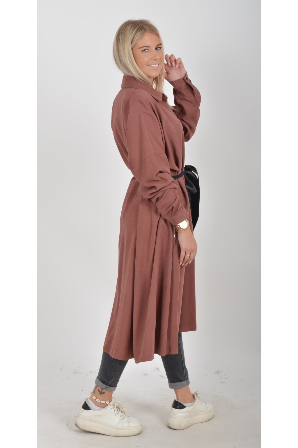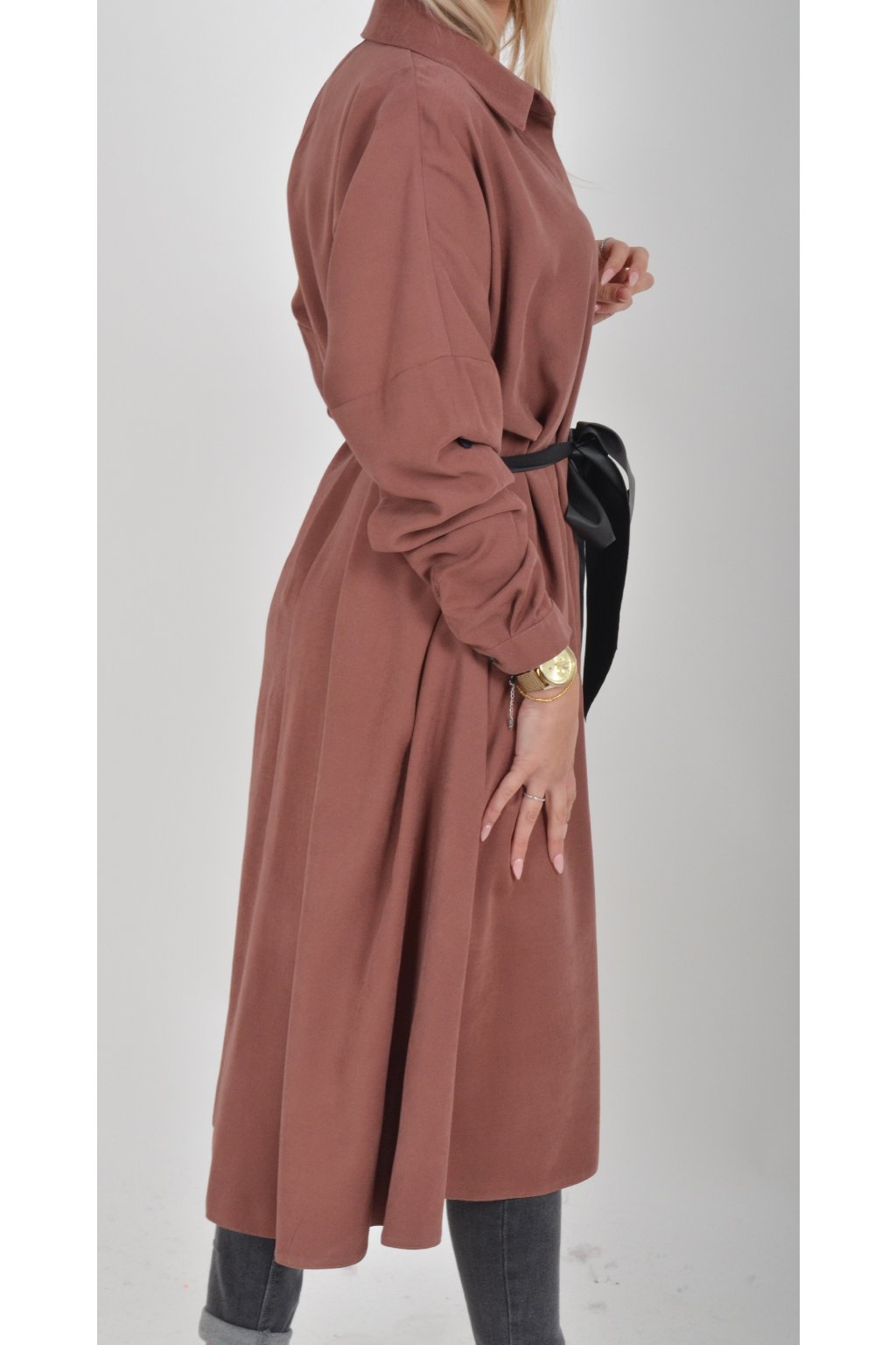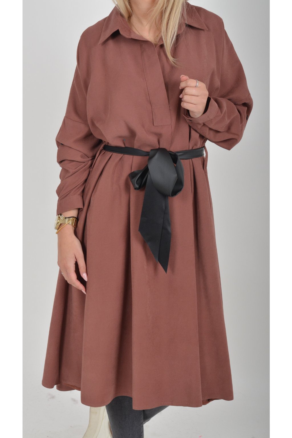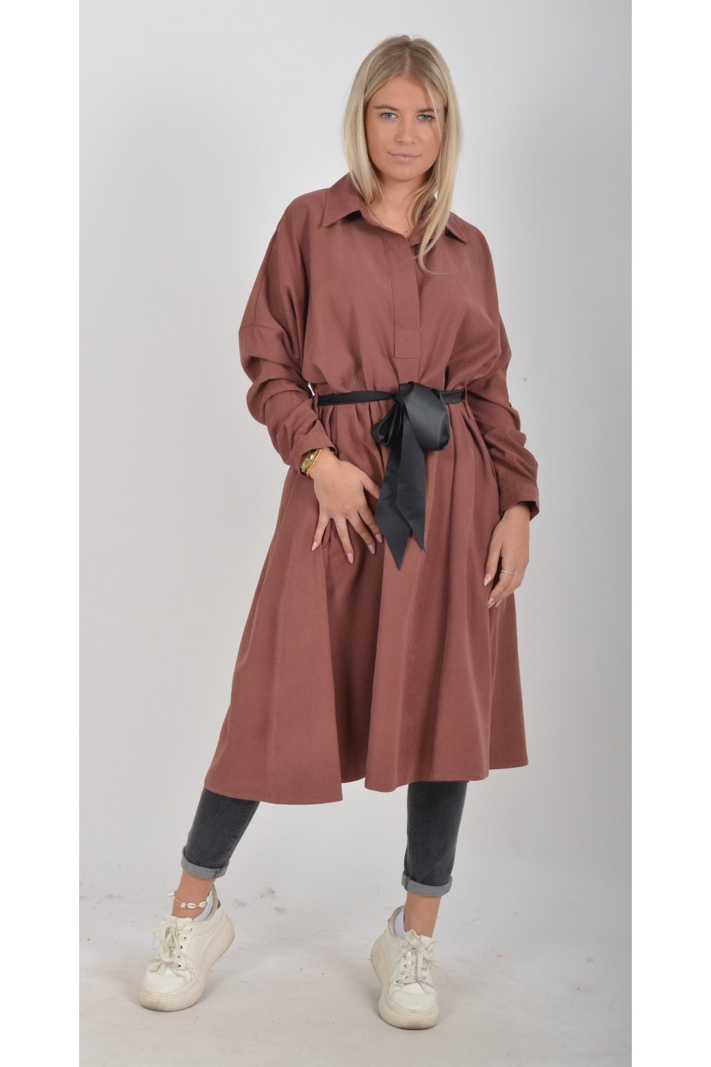 Jednou za dámu, jednou jen tak ven, tyto šaty splní oboje. Mají košilový áčkový střih s rozevlátou sukní, která je v zadní části mírně delší. Šaty mají na bocích kapsy. Rukávy jsou dlouhé, ale dají se zkrátit na knoflíček. Výrazným doplňkem šatů je pásek s imitací kůže, který můžete jakkoliv vázat a kombinovat. K šatům doporučujeme ozdobnou brož nebo šperky z naší kolekce.