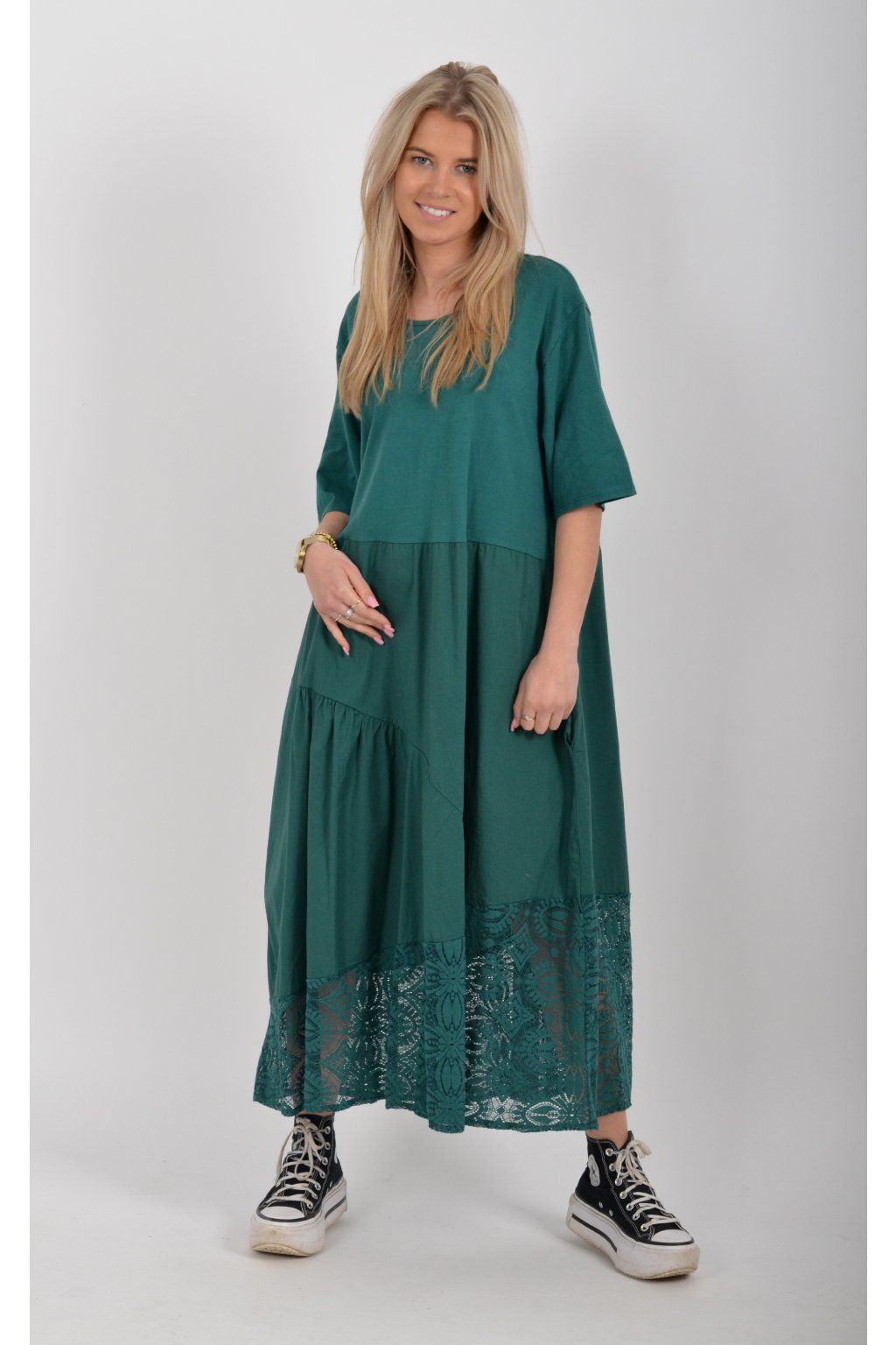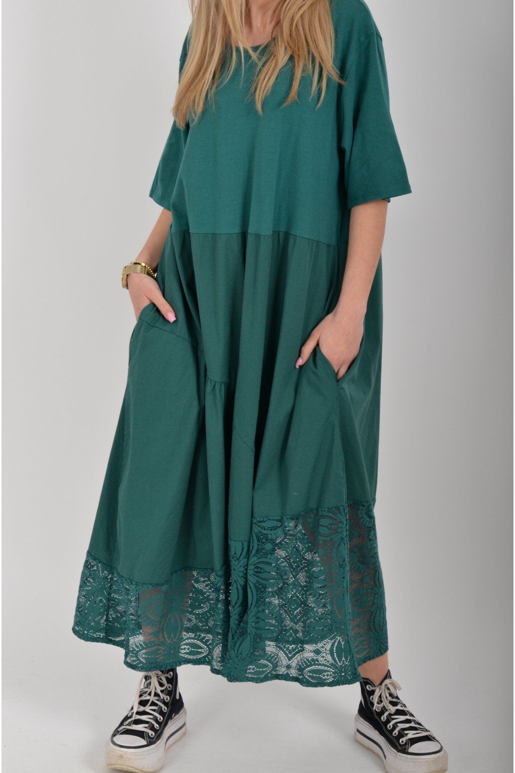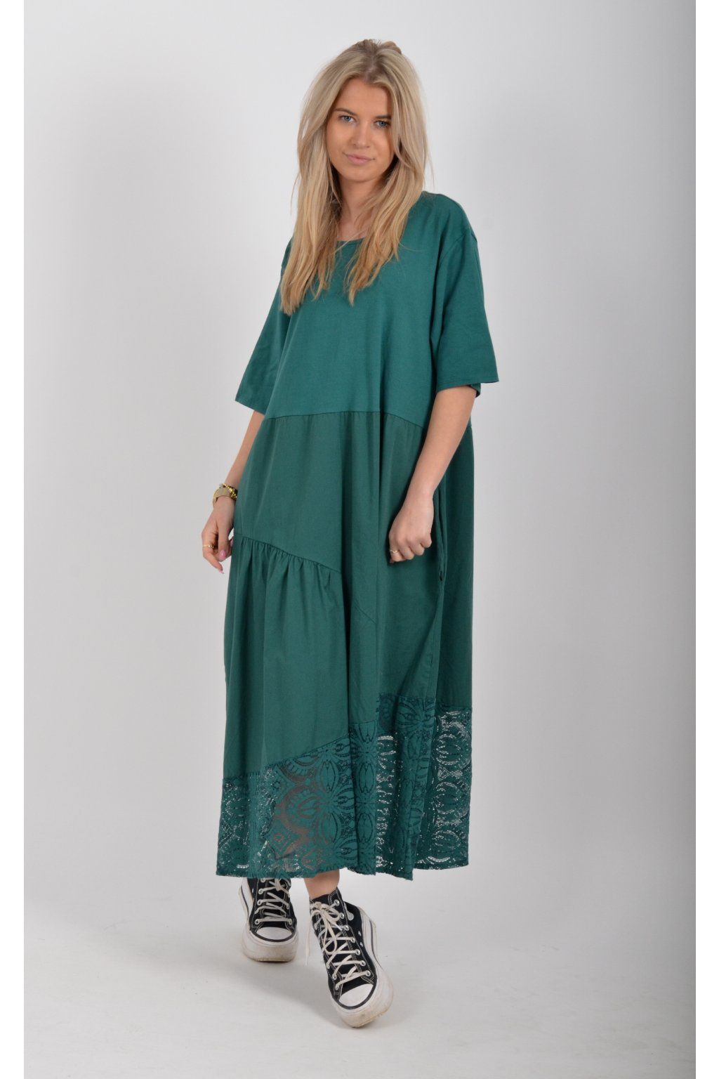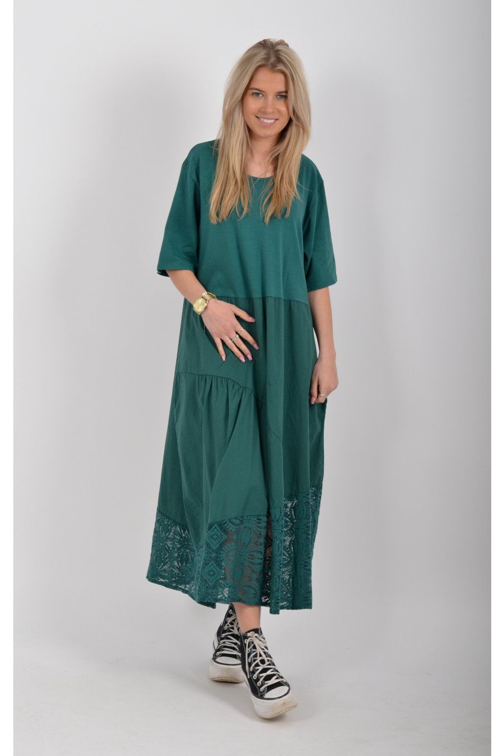 Zajímavé bavlněné šaty s krajkou ve spodní části. Šaty mají áčkový střih, na bocích kapsy a krátké rukávy. Jsou vyrobené z velice příjemného a lehce pružného materiálu.