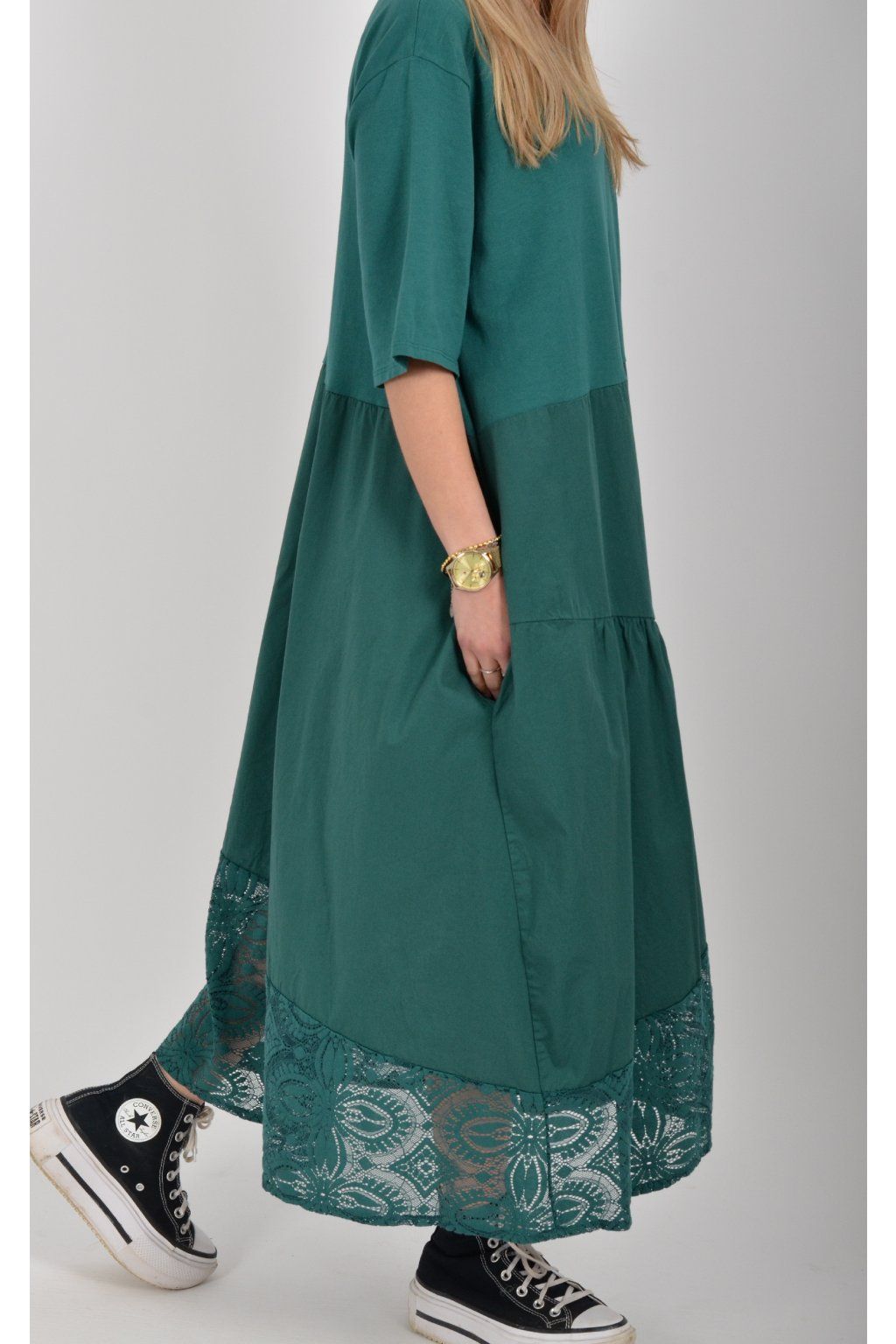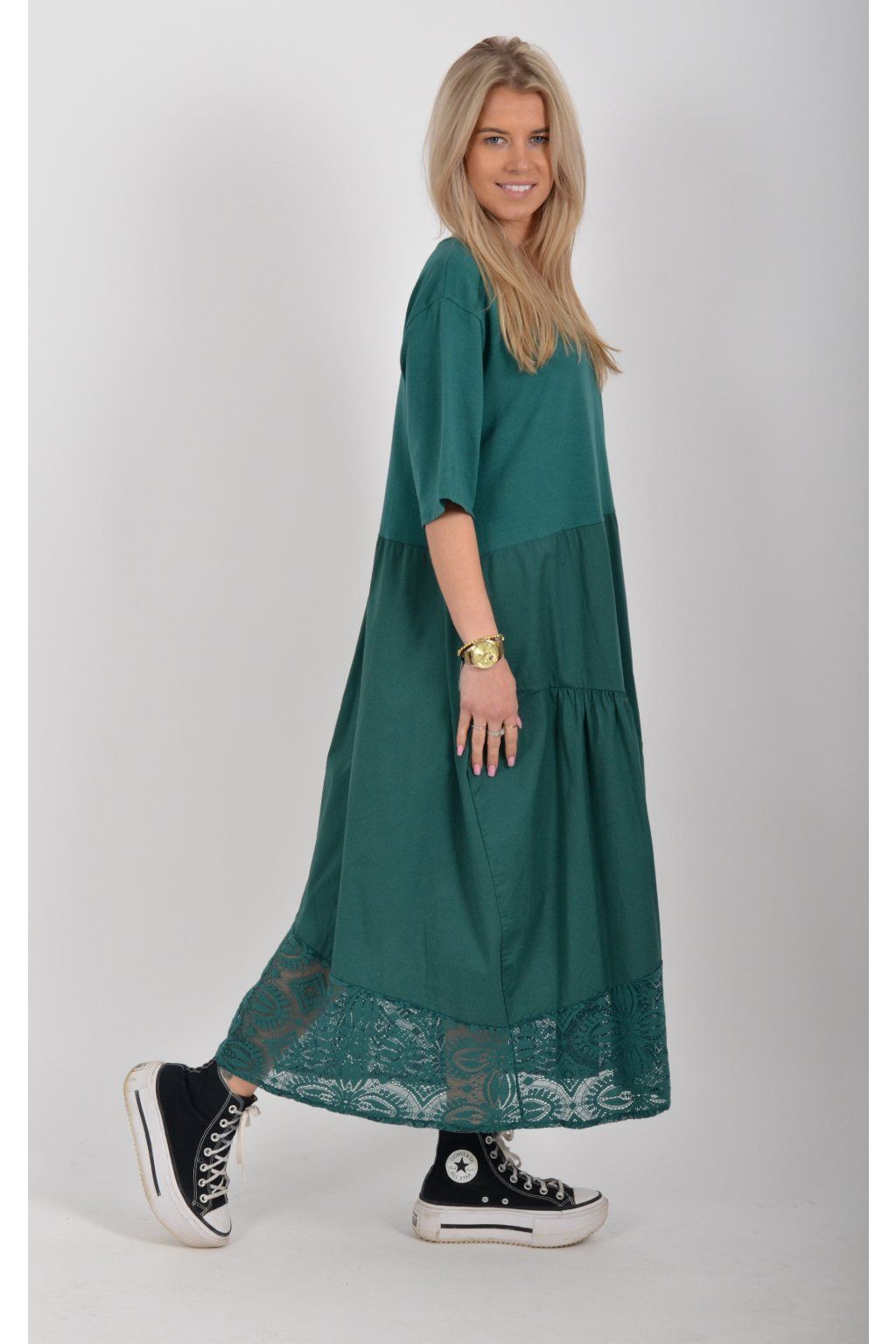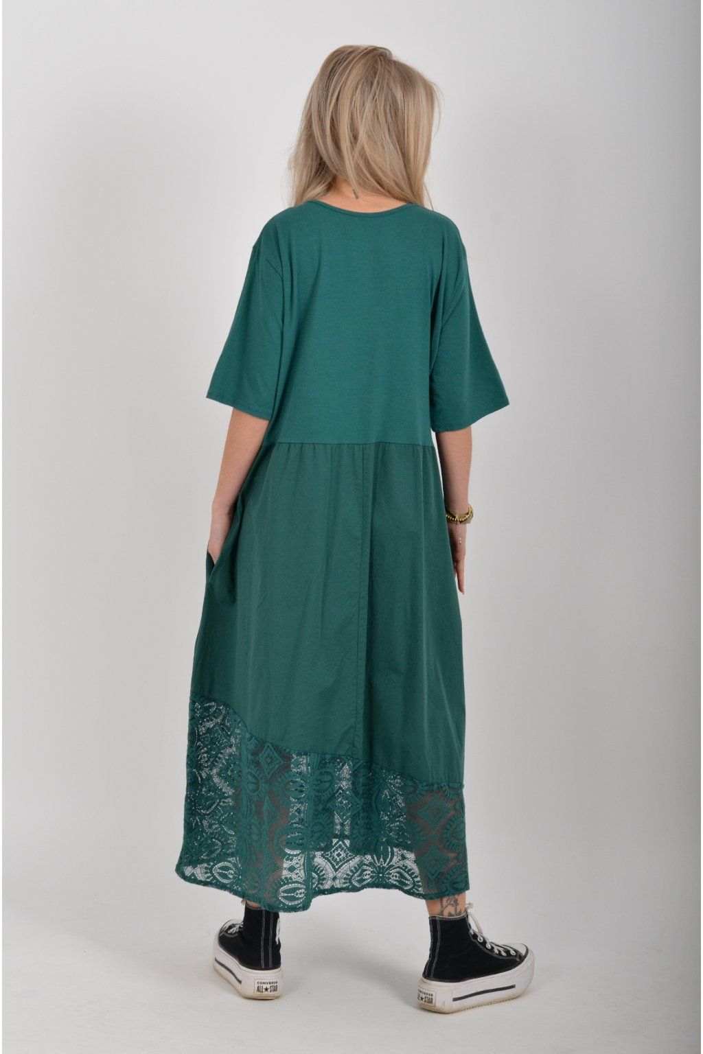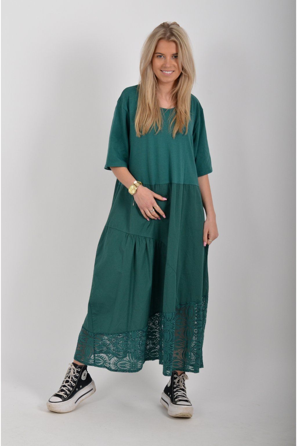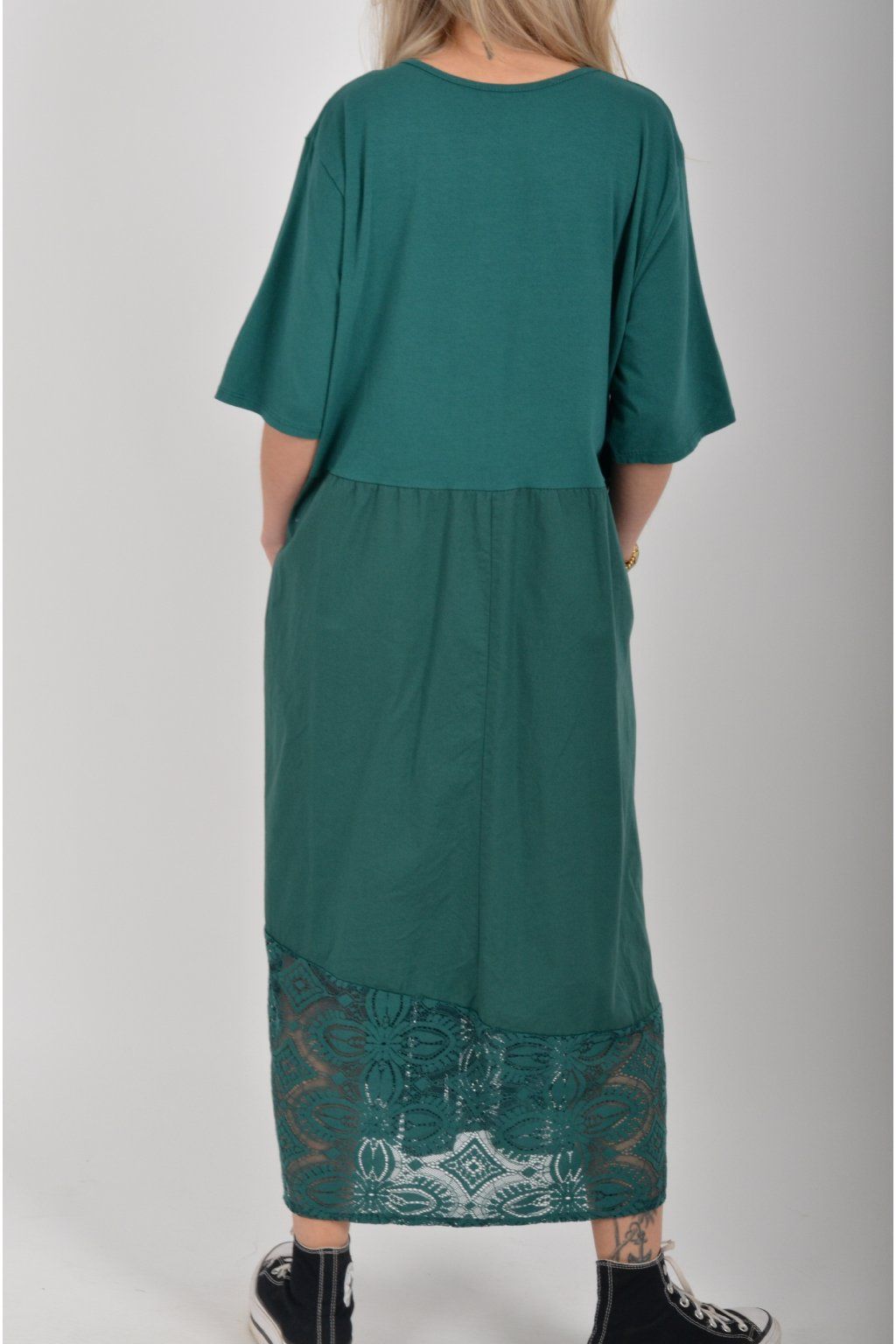 Zajímavé bavlněné šaty s krajkou ve spodní části. Šaty mají áčkový střih, na bocích kapsy a krátké rukávy. Jsou vyrobené z velice příjemného a lehce pružného materiálu.