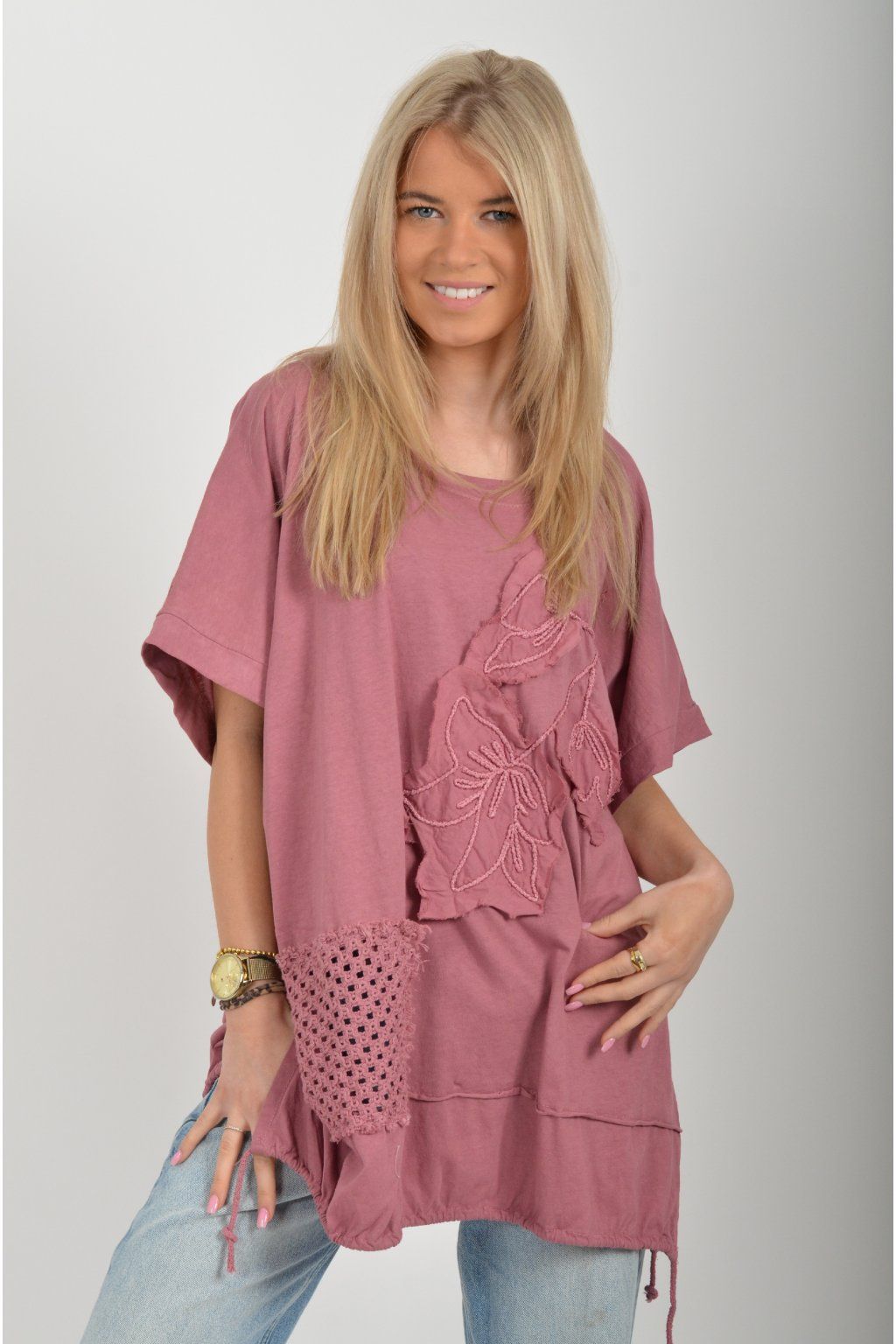 Oversize halenka s krátkým rukávem a vyšívaným vzorem vyrobená z velice příjemné bavlny. Materiál halenky je pružný. Ve spodní části na bocích má rozparky, a po celém spodním švu je zapracovaná tkanice pro libovolné stažení.