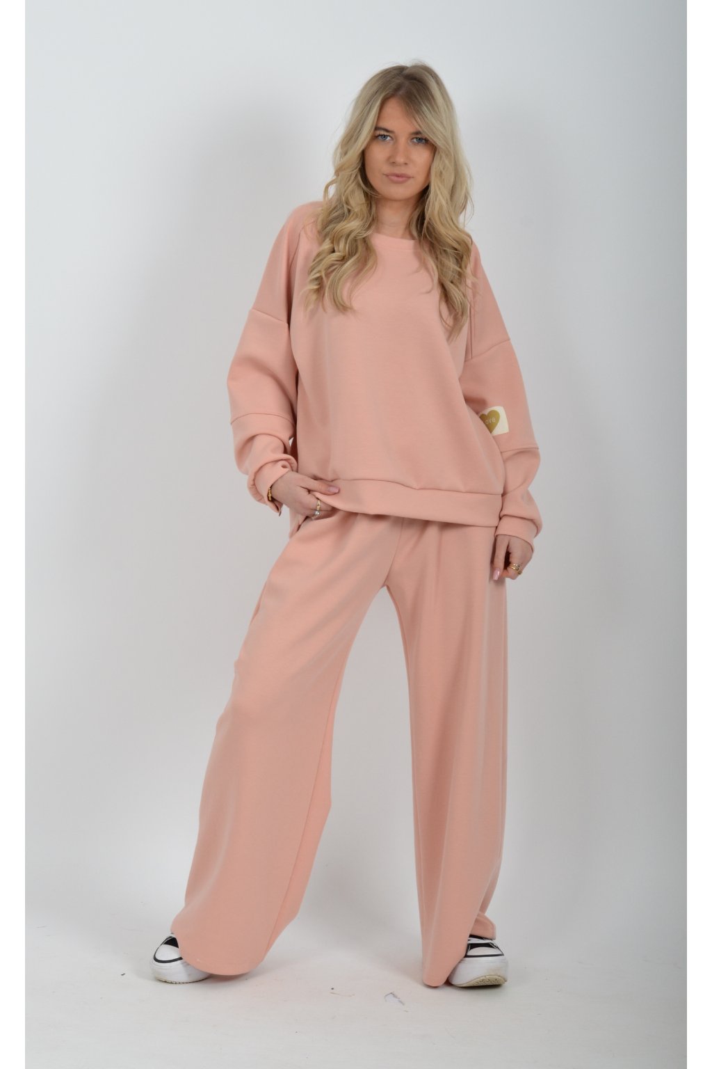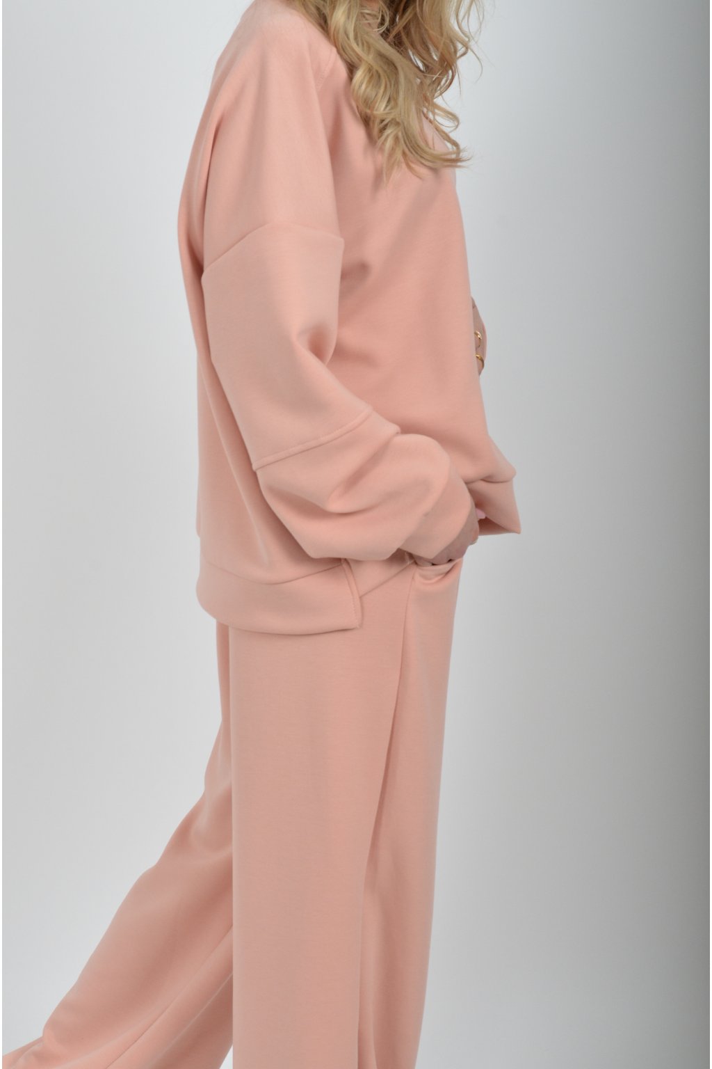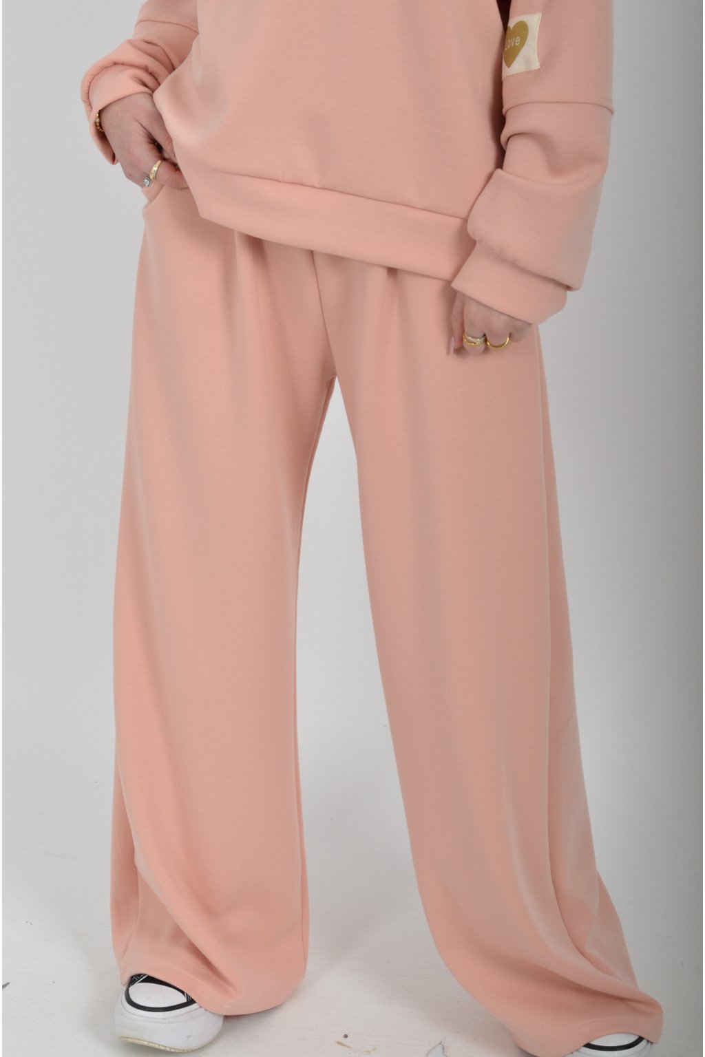 Tepláková souprava vyrobená z velice příjemného materiálu. Tepláky mají na bocích kapsy a jsou zvonového střihu.
