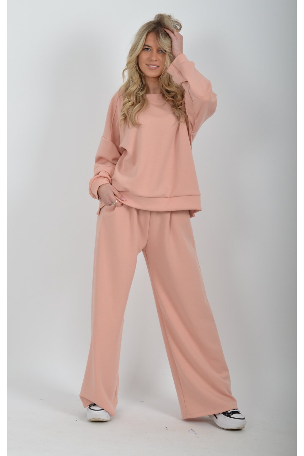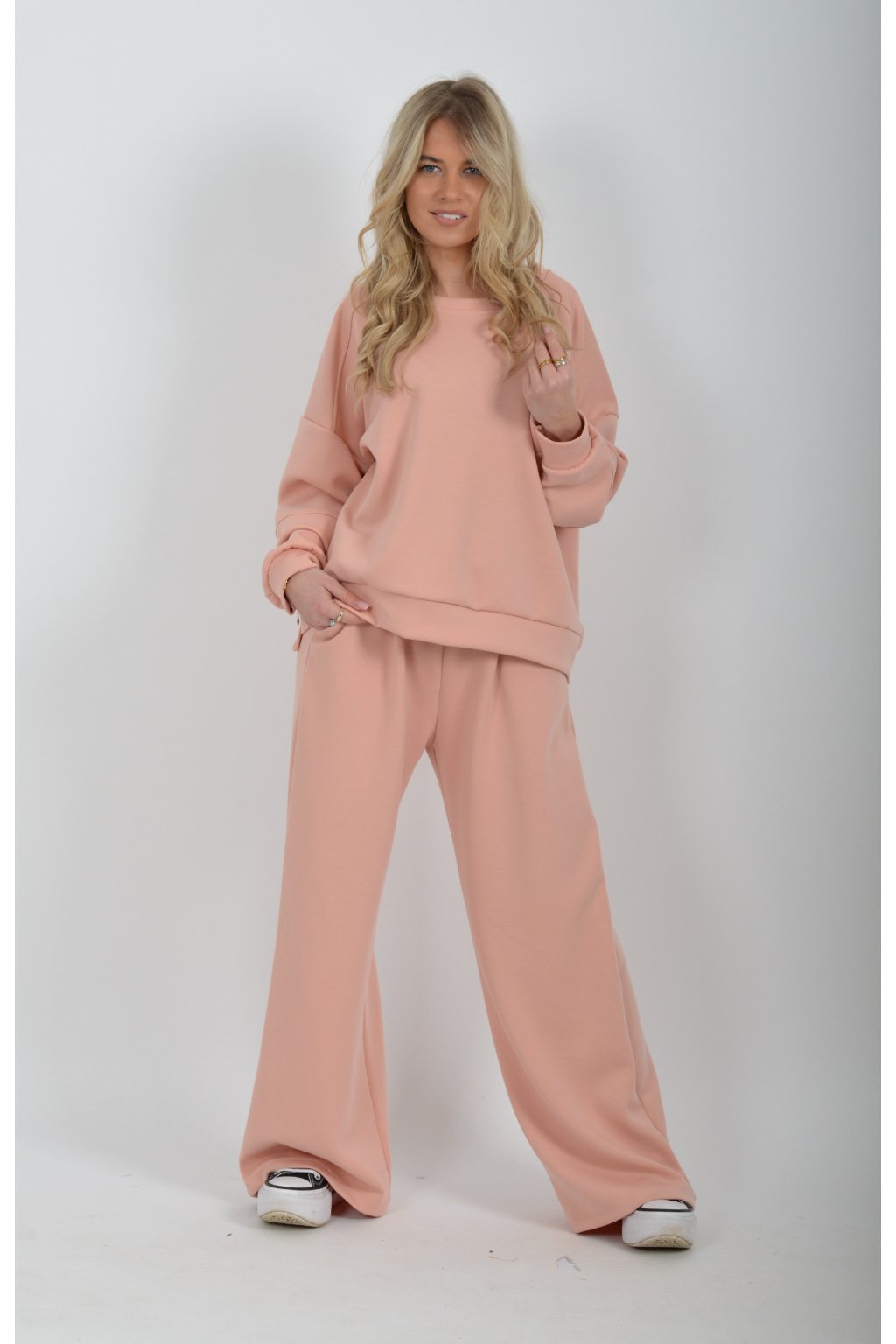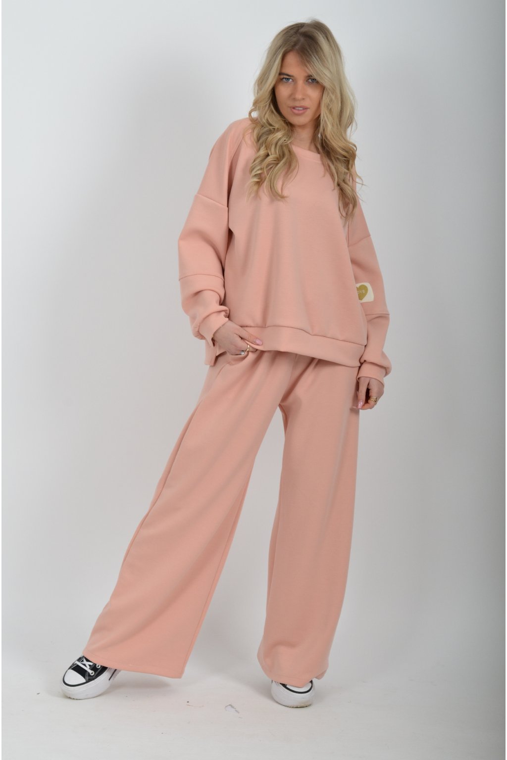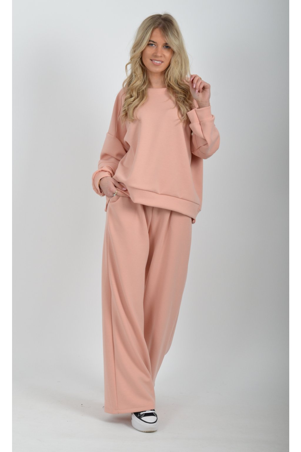 Tepláková souprava vyrobená z velice příjemného materiálu. Tepláky mají na bocích kapsy a jsou zvonového střihu.