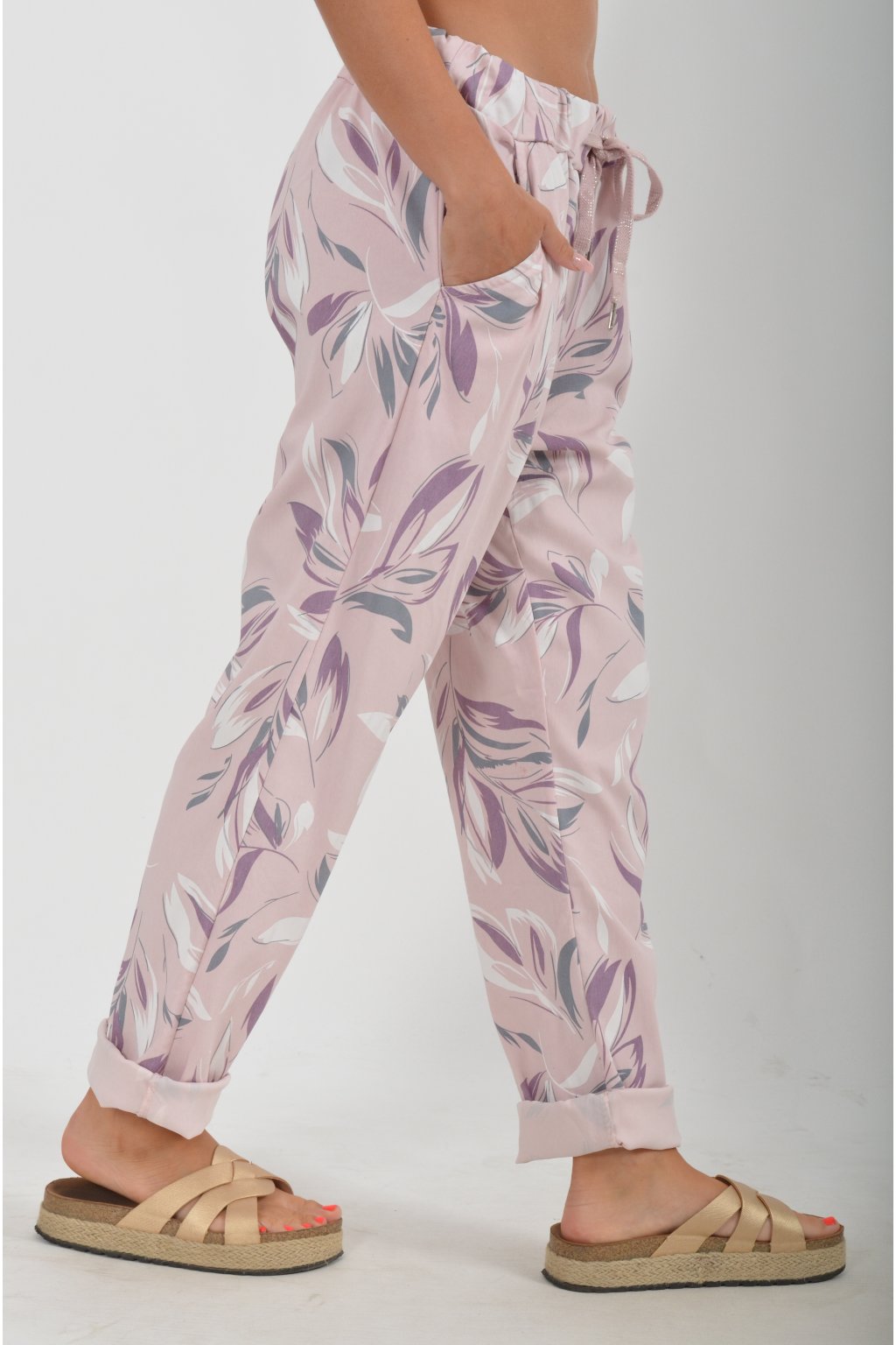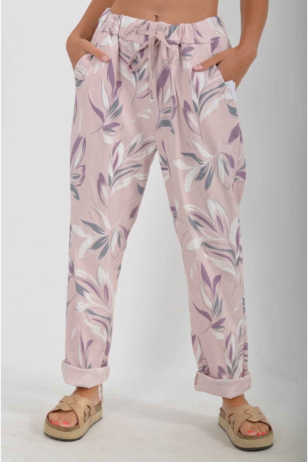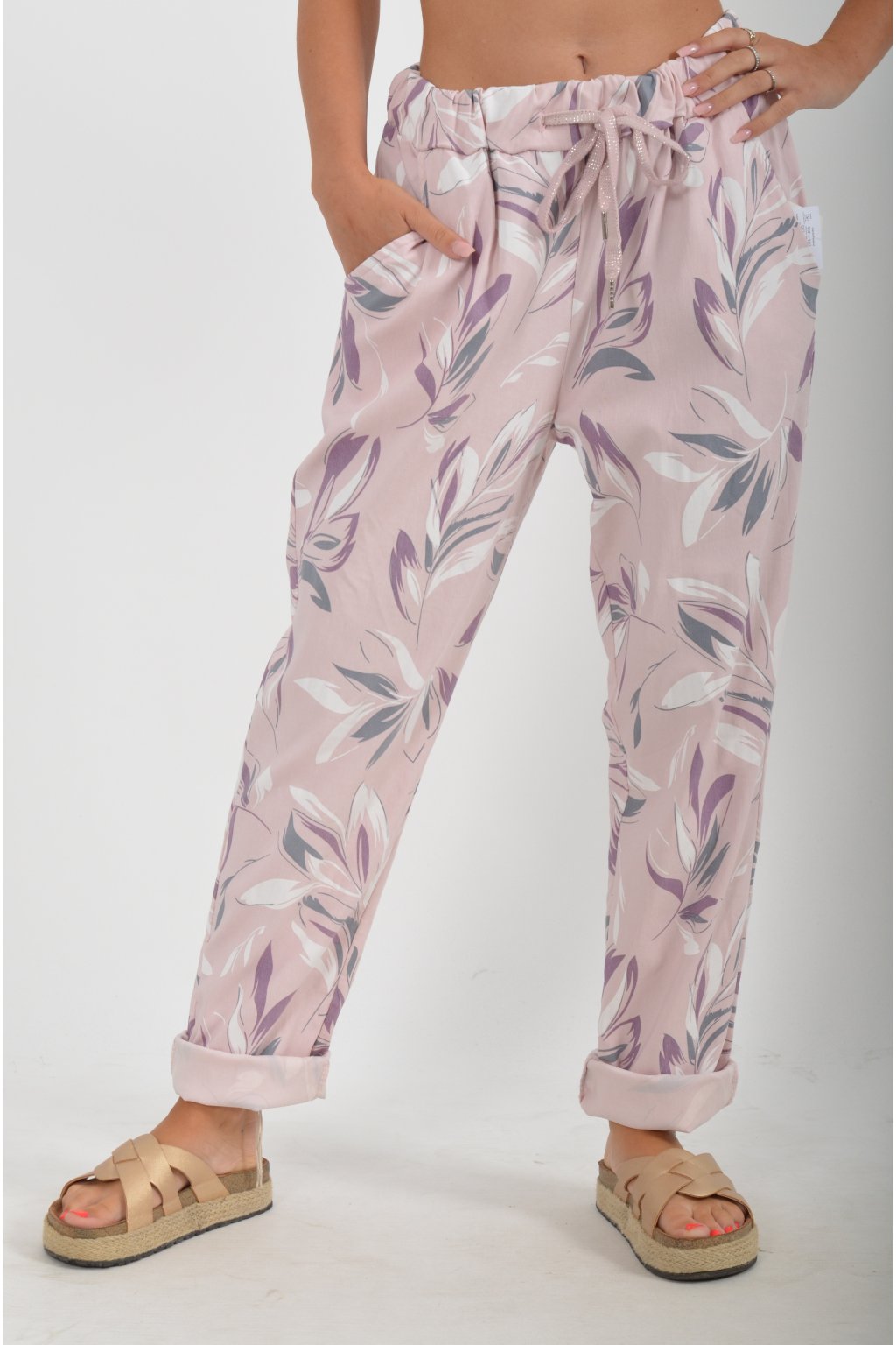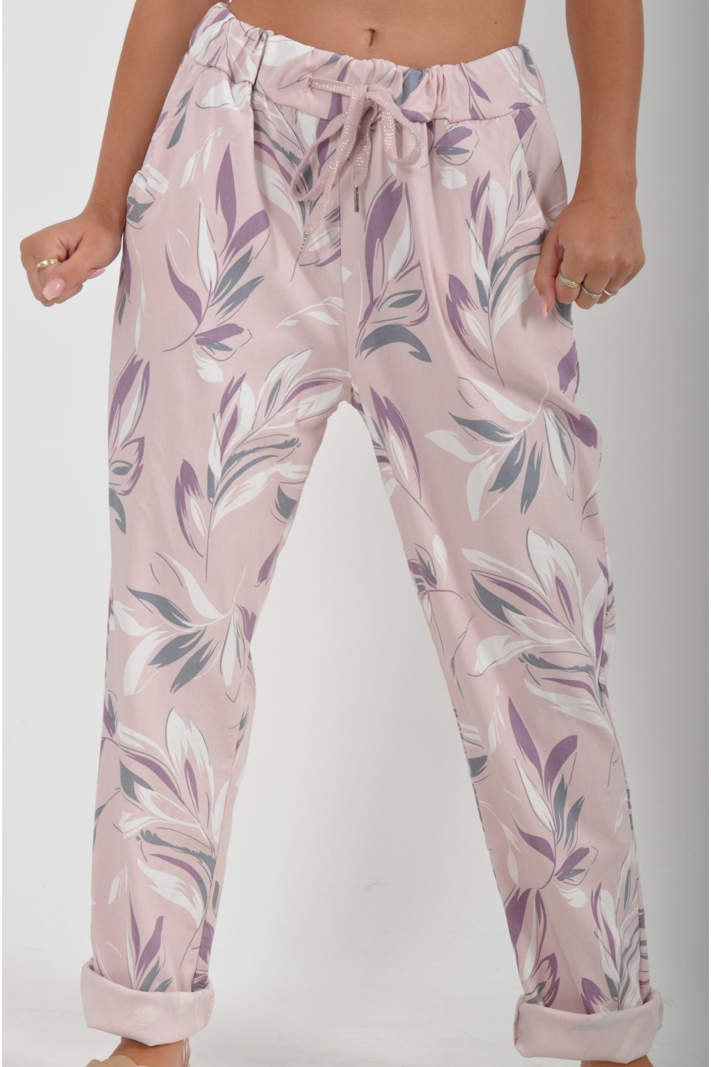 Vzorované kalhoty s kapsami na bocích, které se krásně přizpůsobí postavě, díky podílu elastanu. Jsou vhodné pro každodenní nošení. V pase je zapracovaná guma a tkanička pro libovolné stažení.