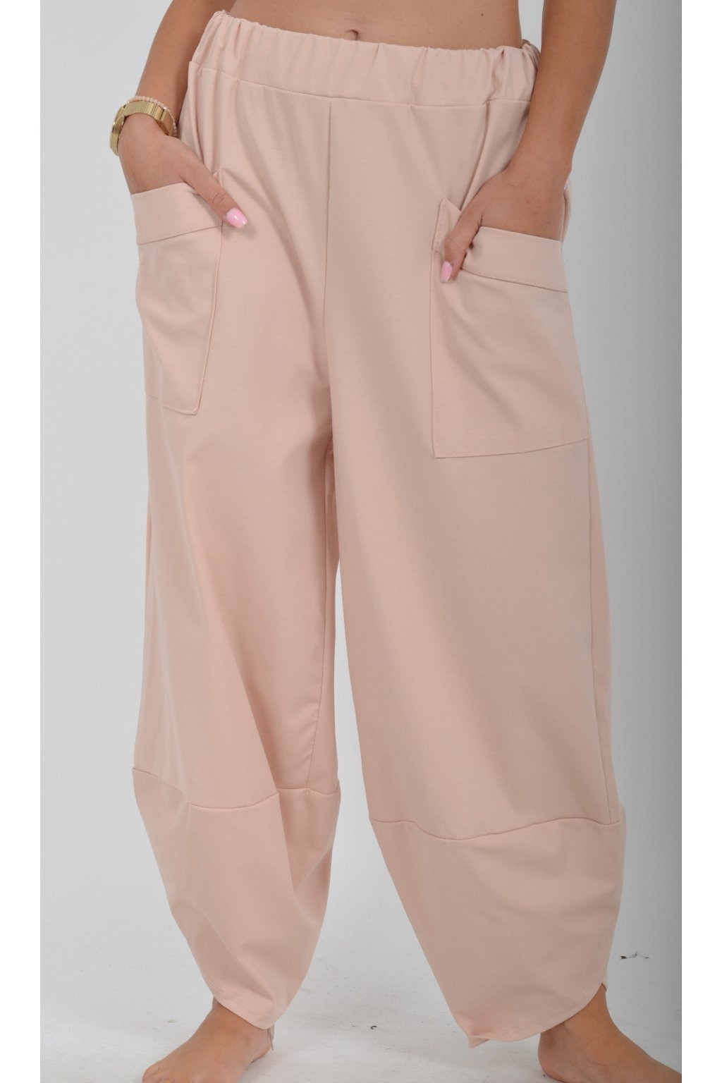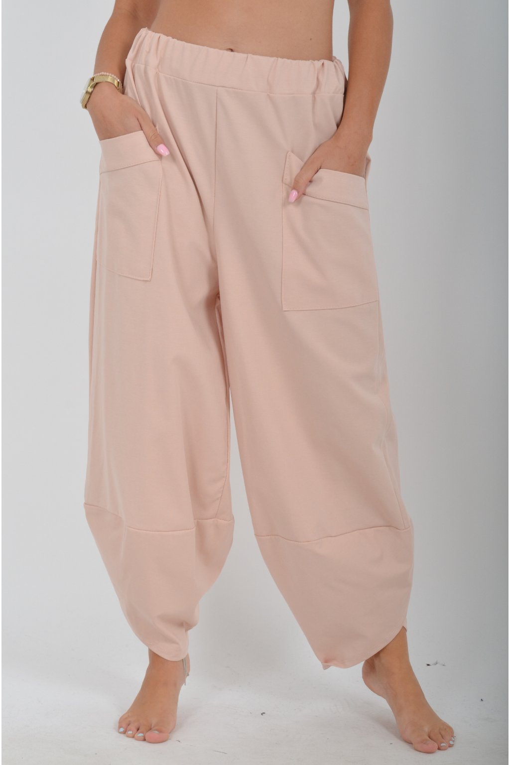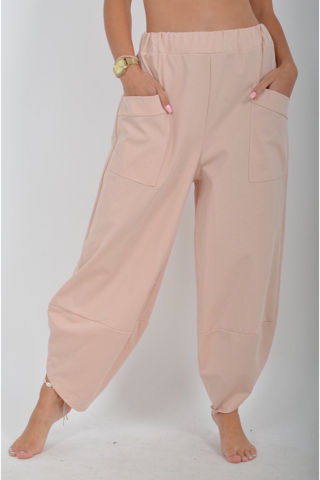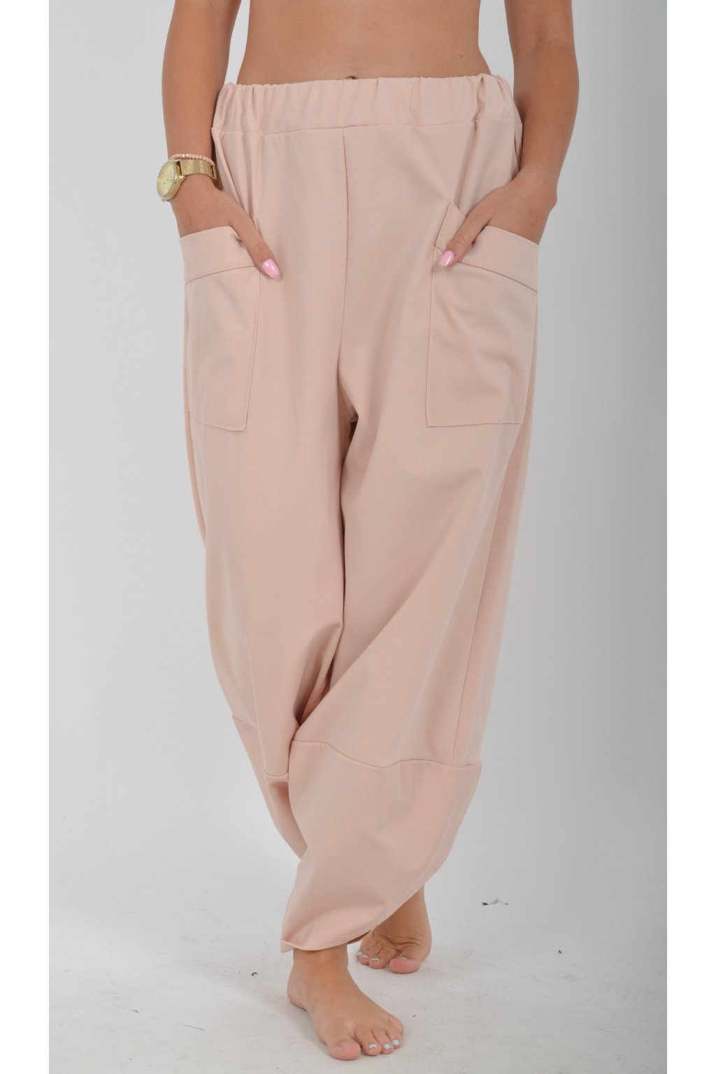 Volnější kalhoty teplákového stylu s kapsami v přední části. Mají v pase zapracovanou gumu a jsou velice příjemné pro pohodlné nošení.