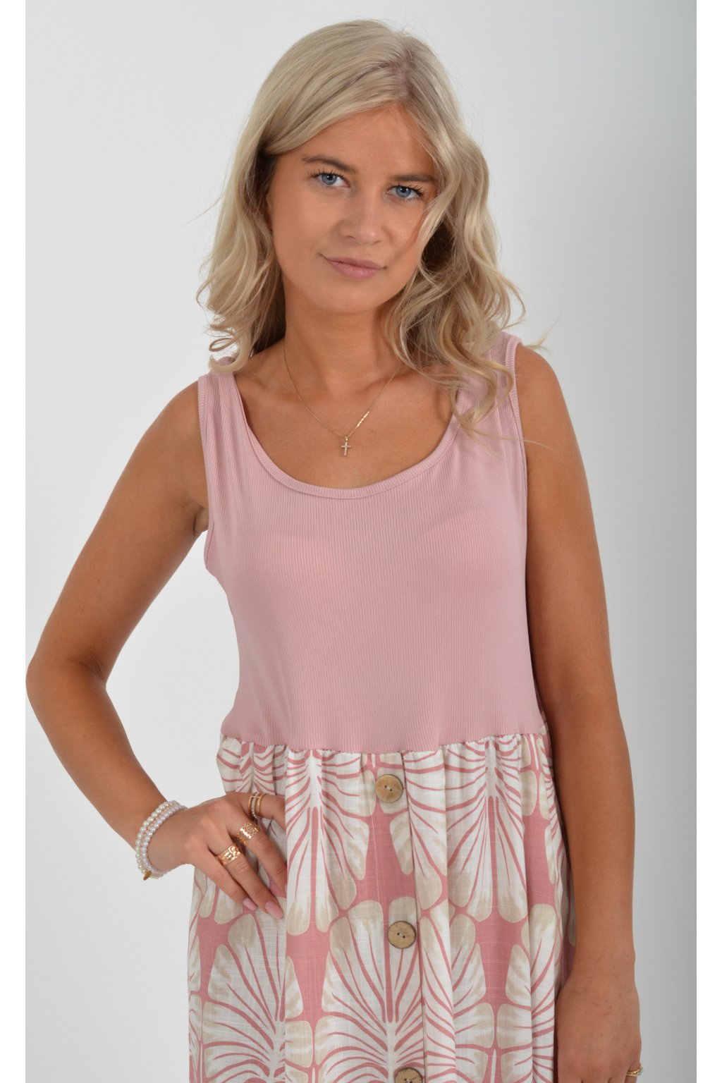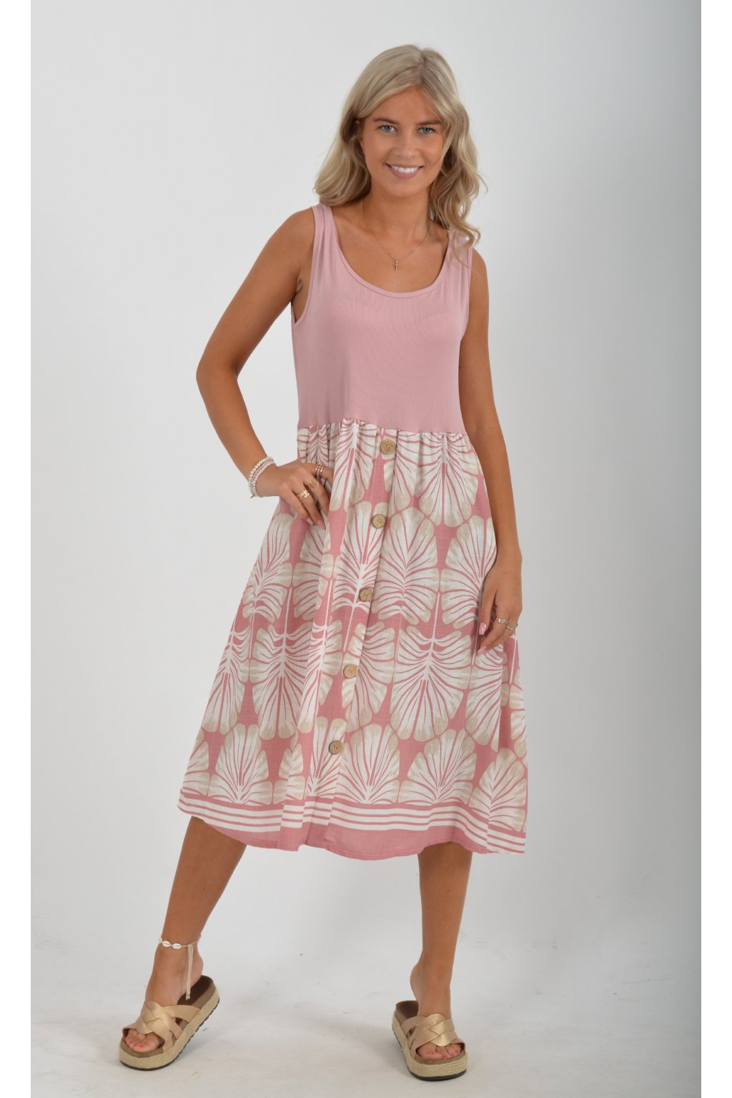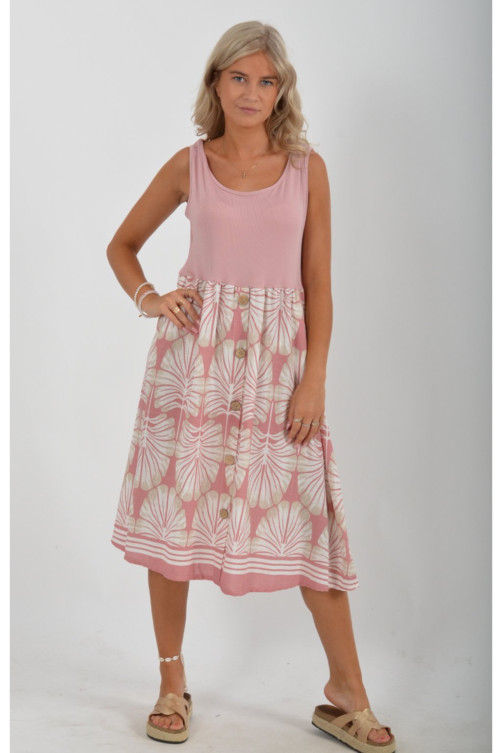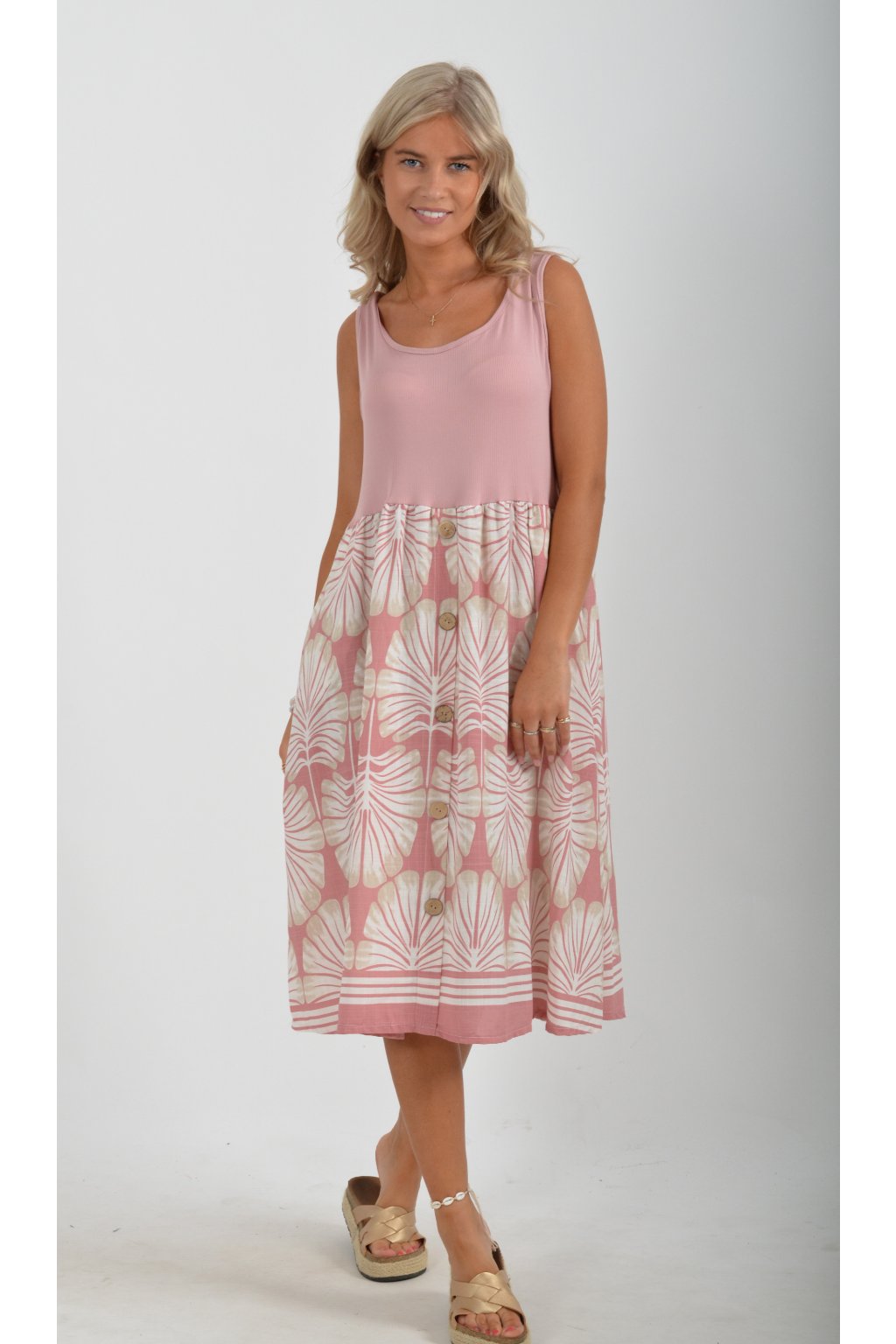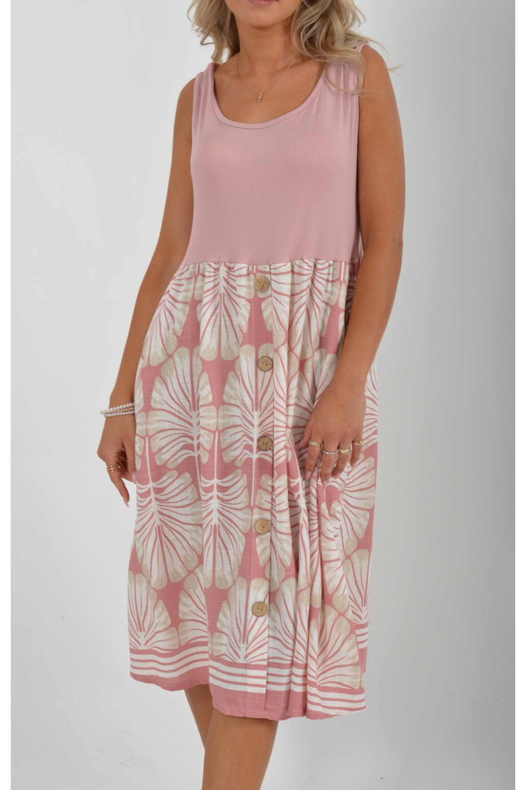 Šaty z velice příjemného a lehounkého materiálu. Vrchní část šatů je elastická. Šaty jsou áčkového střihu a na bocích mají kapsy. V přední části mají ozdobné falešné knoflíky. Jsou vhodné na každodenní letní nošení.