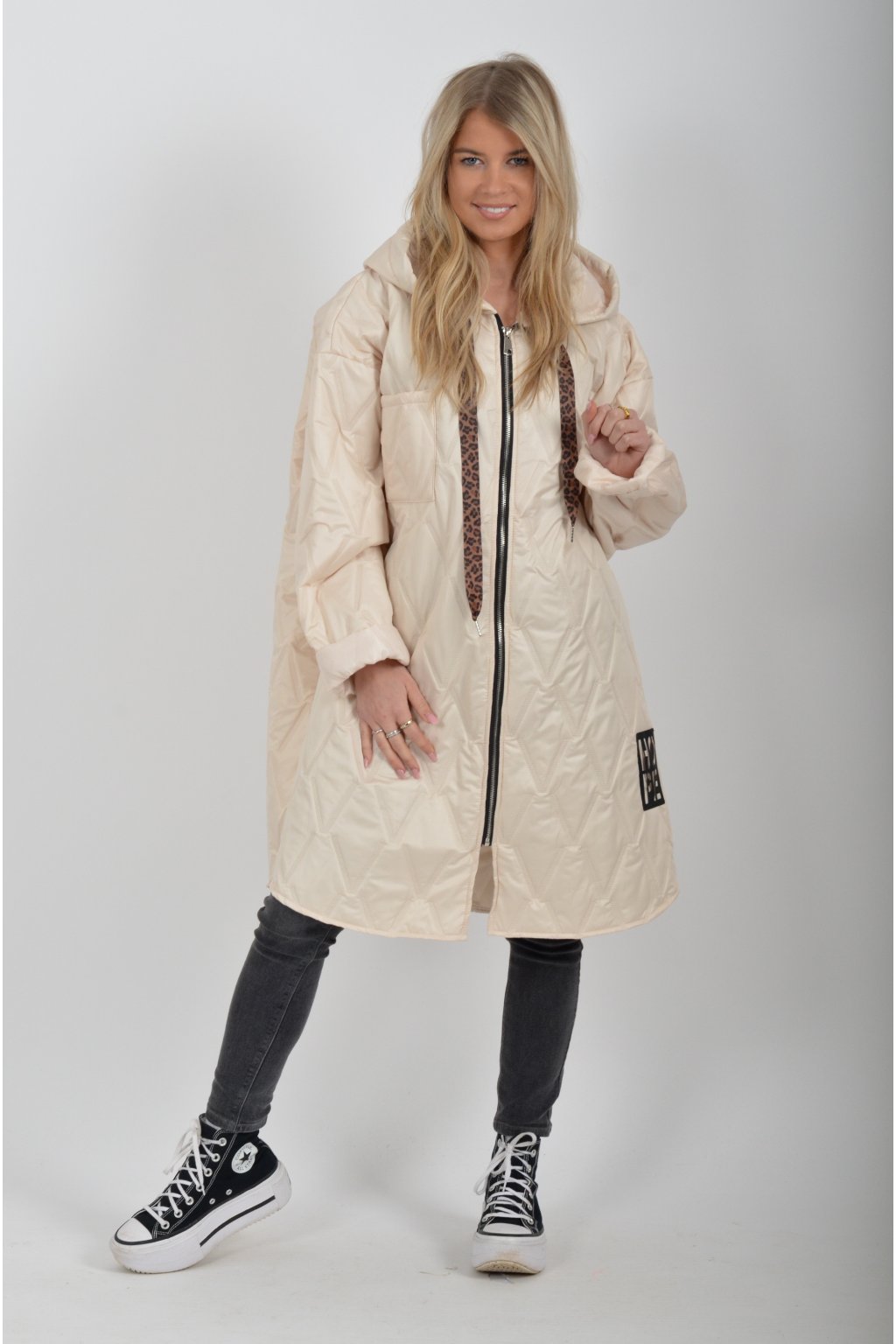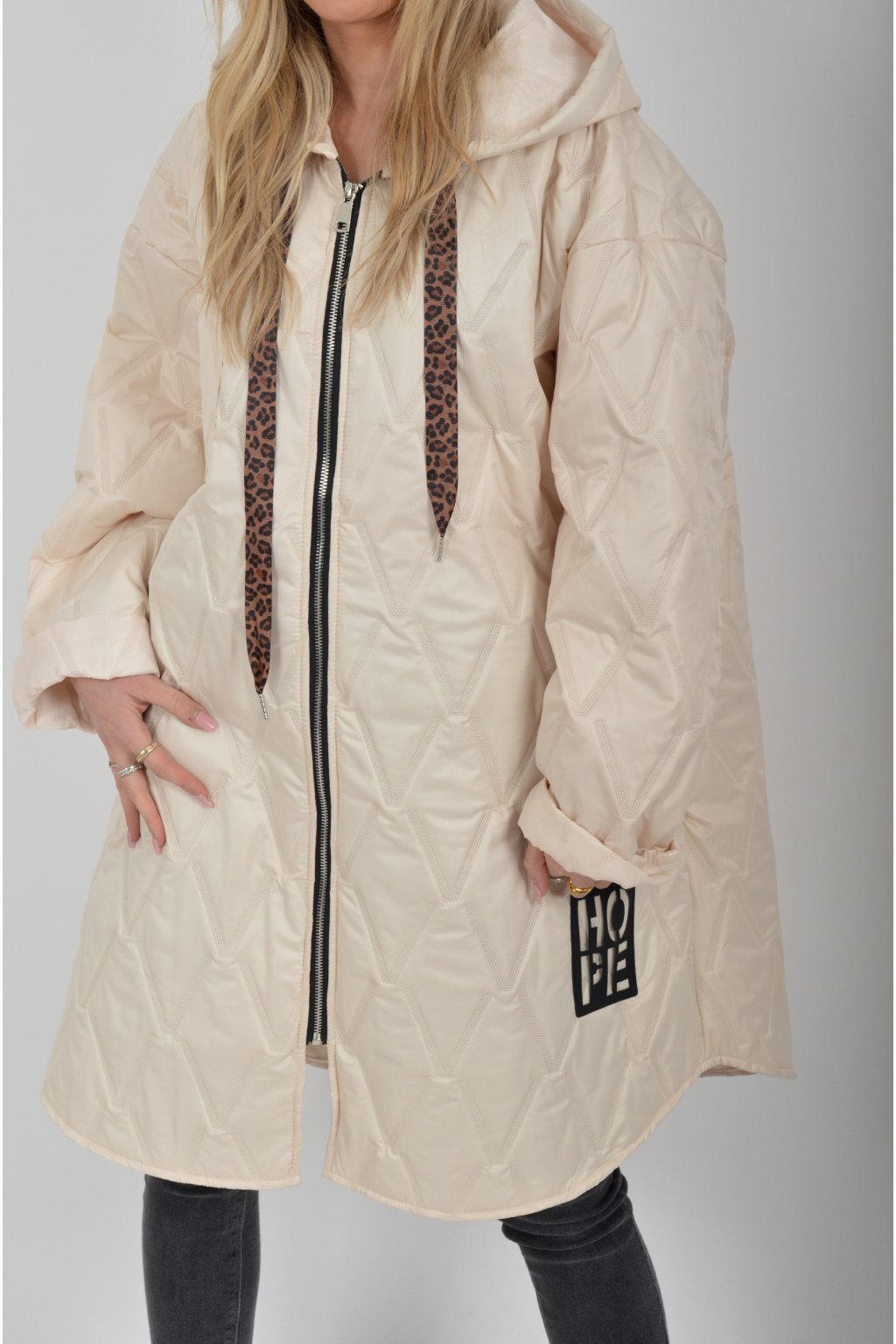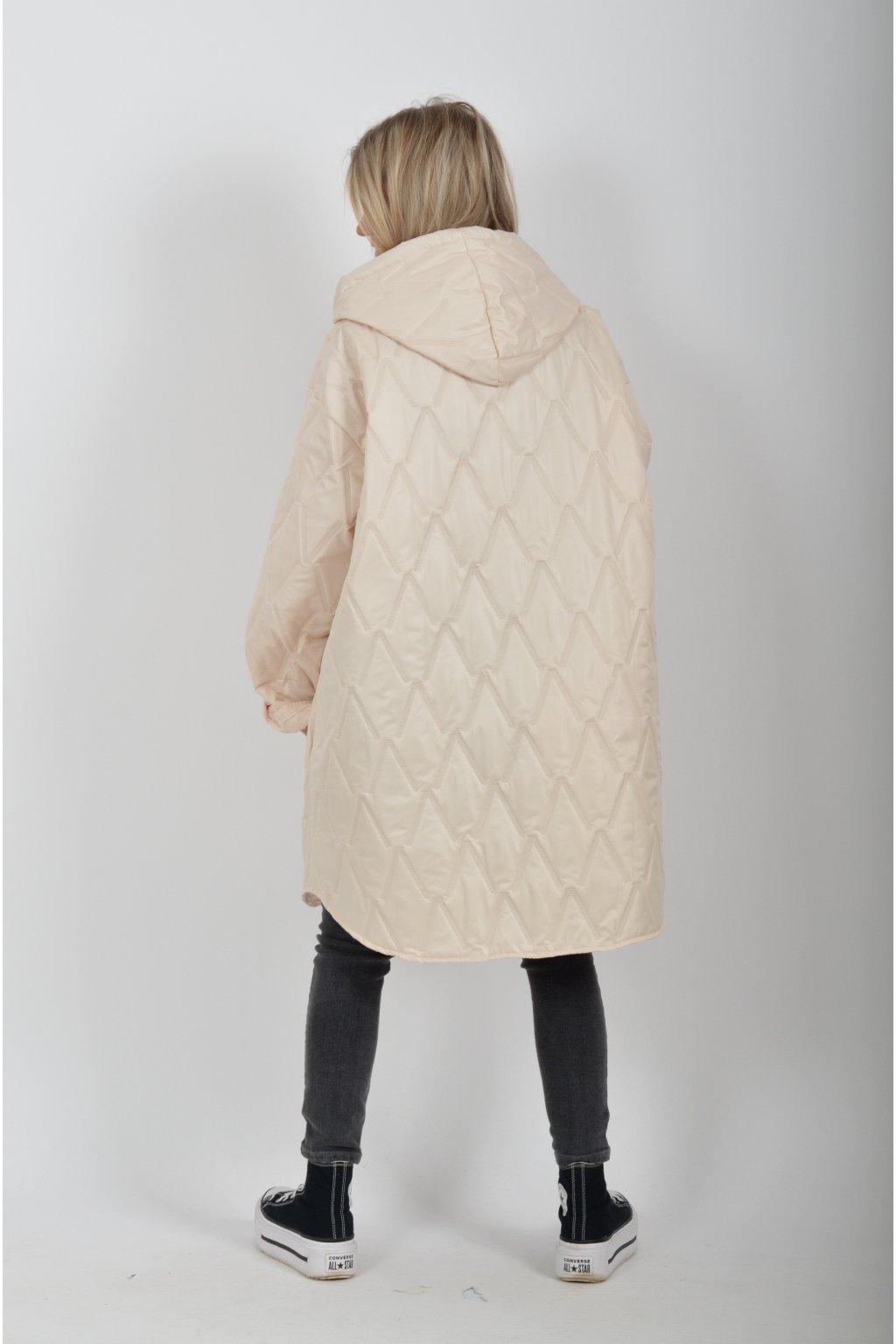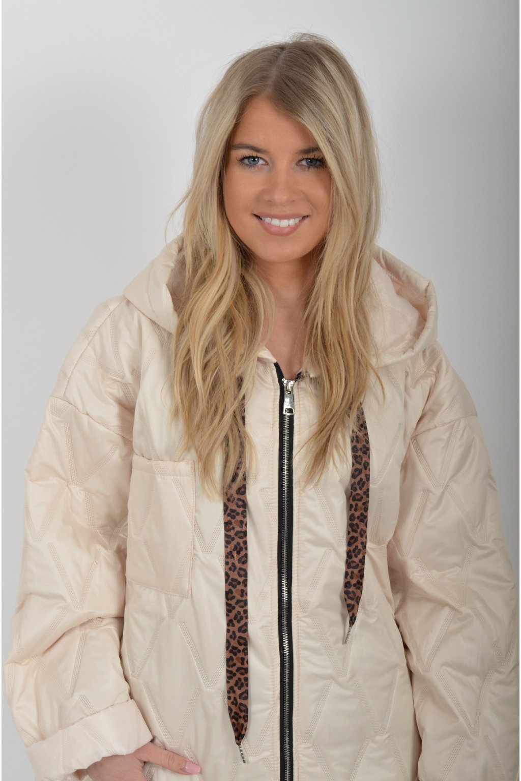 Přechodová oversize bunda s kapuci, jednou náprsní kapsou a dvěma na bocích. Je volnějšího stylu, u krku má šňurky na stažení. Bunda je vyrobena z odlehčeného materiálu, tedy je vhodná pro jarní nošení.