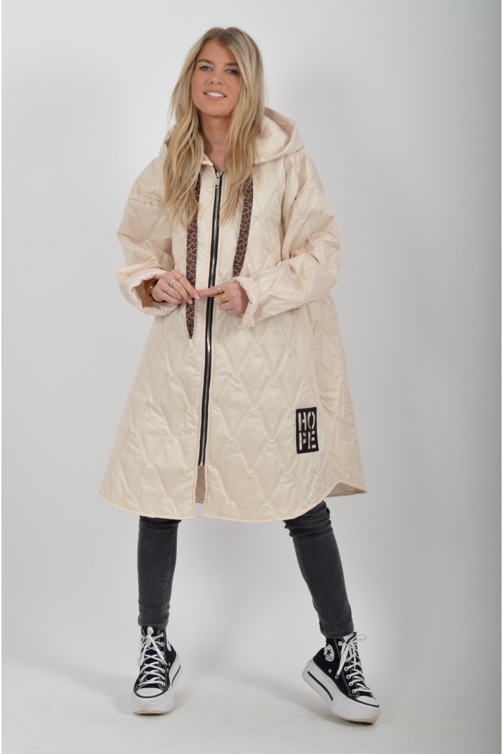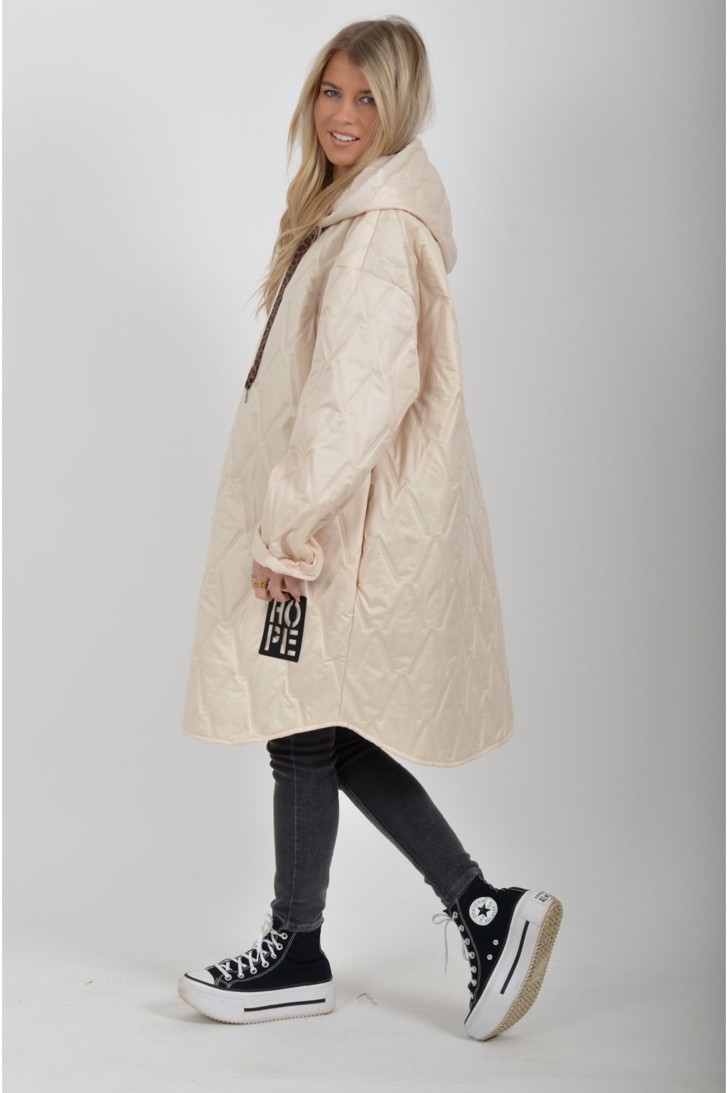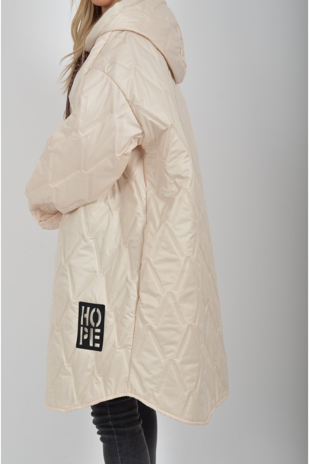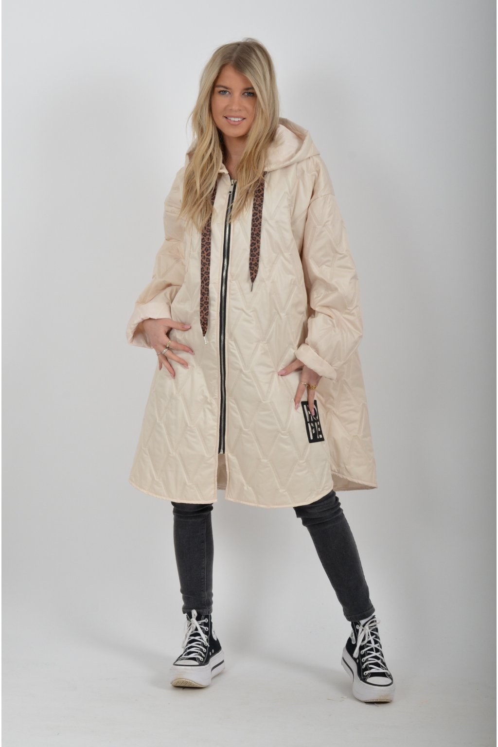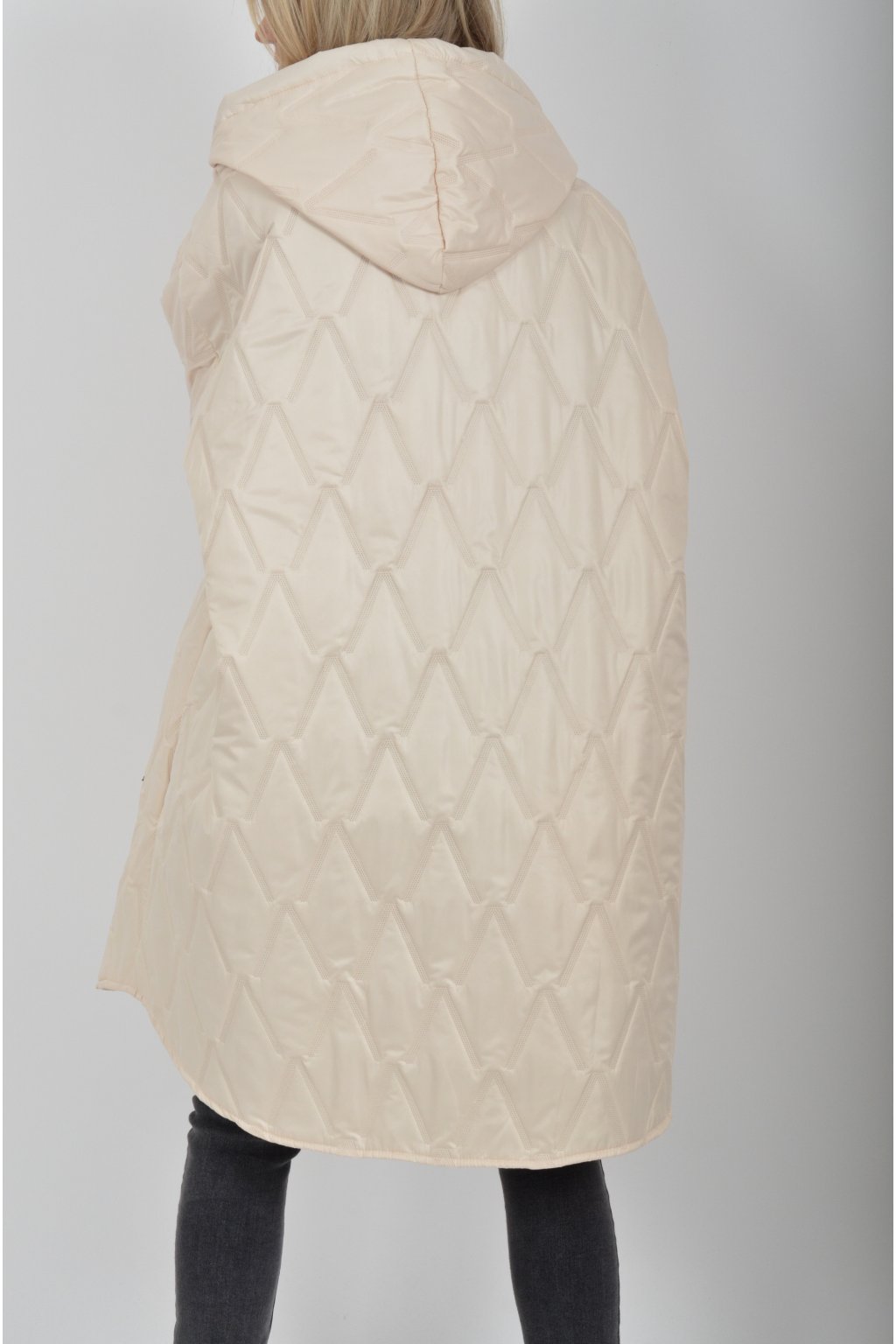 Přechodová oversize bunda s kapuci, jednou náprsní kapsou a dvěma na bocích. Je volnějšího stylu, u krku má šňurky na stažení. Bunda je vyrobena z odlehčeného materiálu, tedy je vhodná pro jarní nošení.