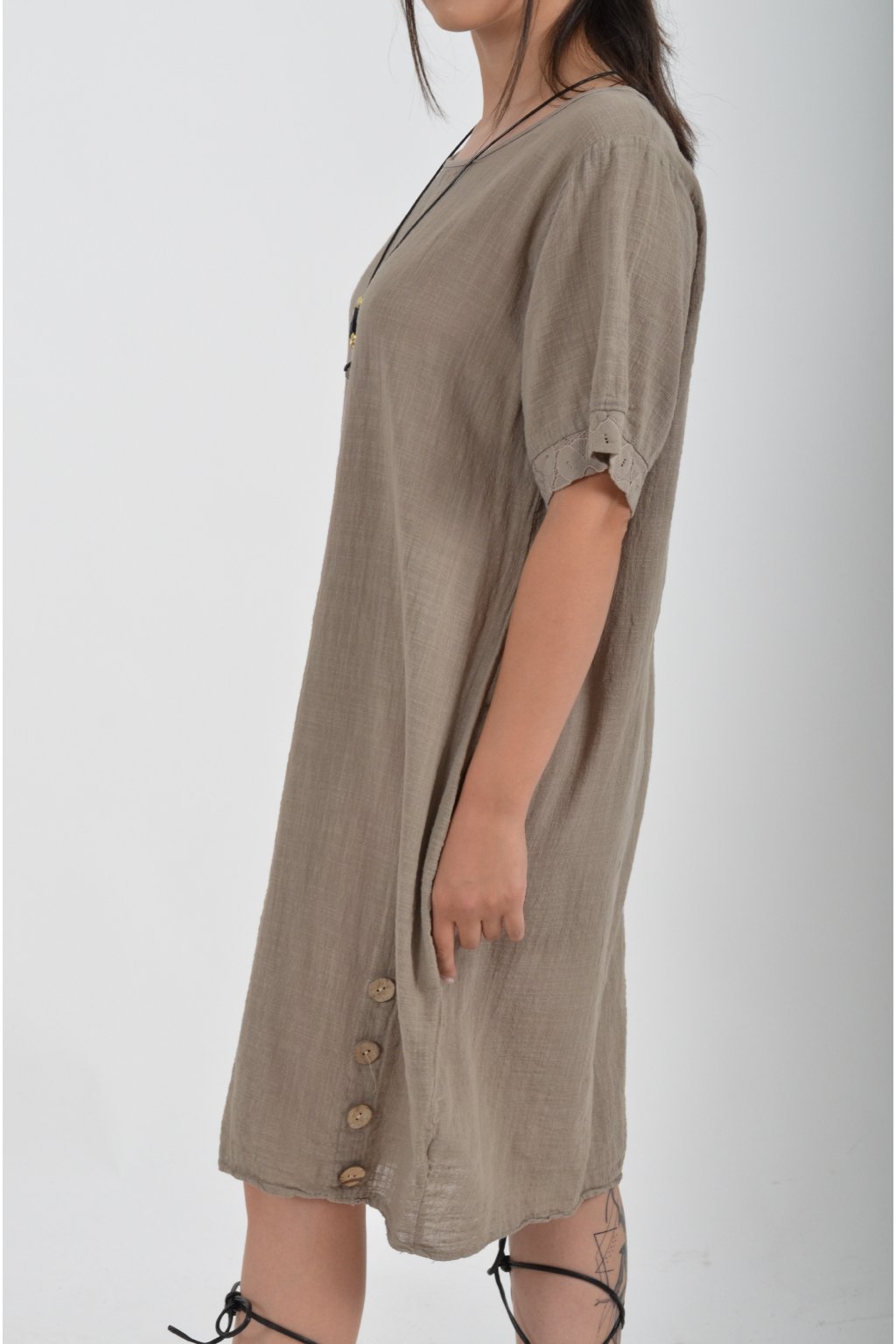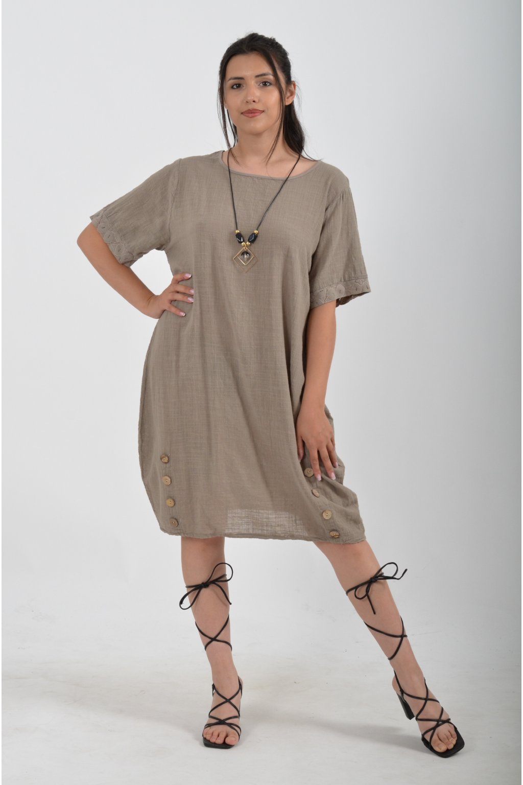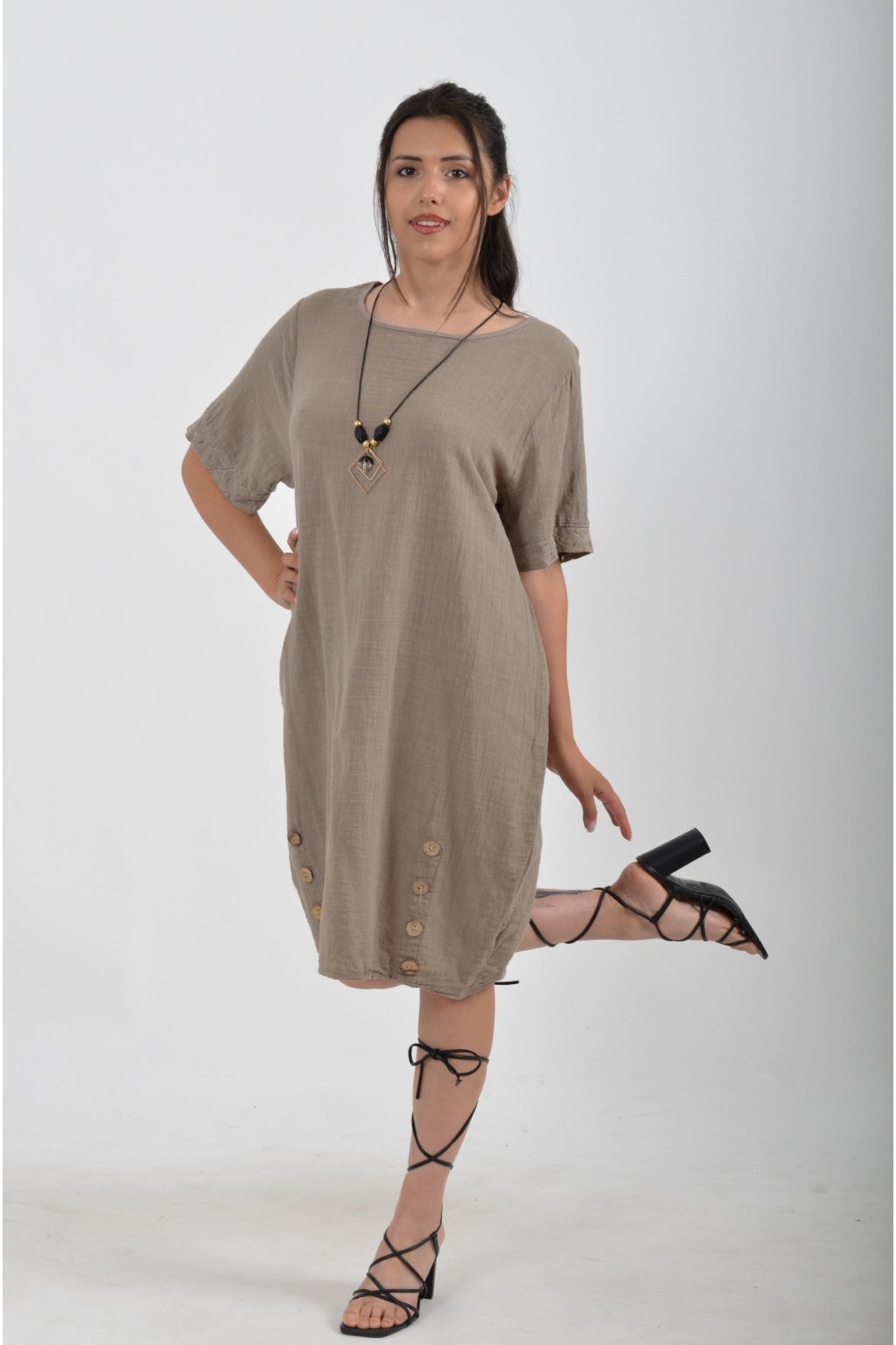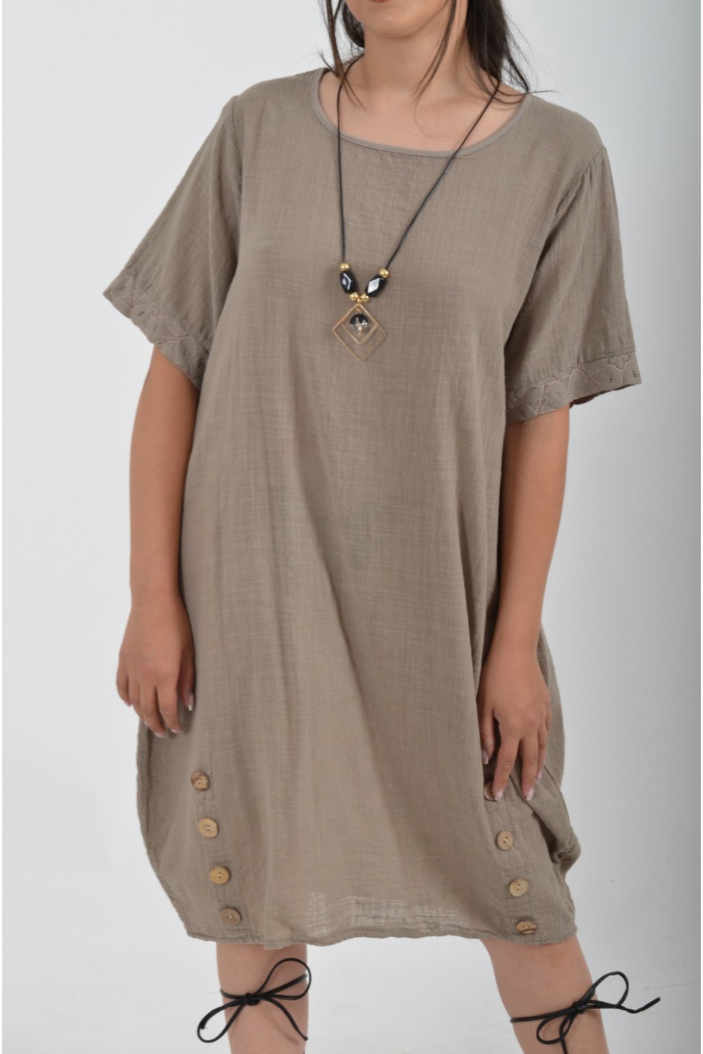 Bavlněné šaty s krátkým rukávem vyrobené z velice příjemné a jemné bavlny. V přední části mají ozdobné knoflíky, součástí šatů je náhrdelník jako dárek. Šaty nemají kapsy a jsou vhodné na každodenní letní nošení.