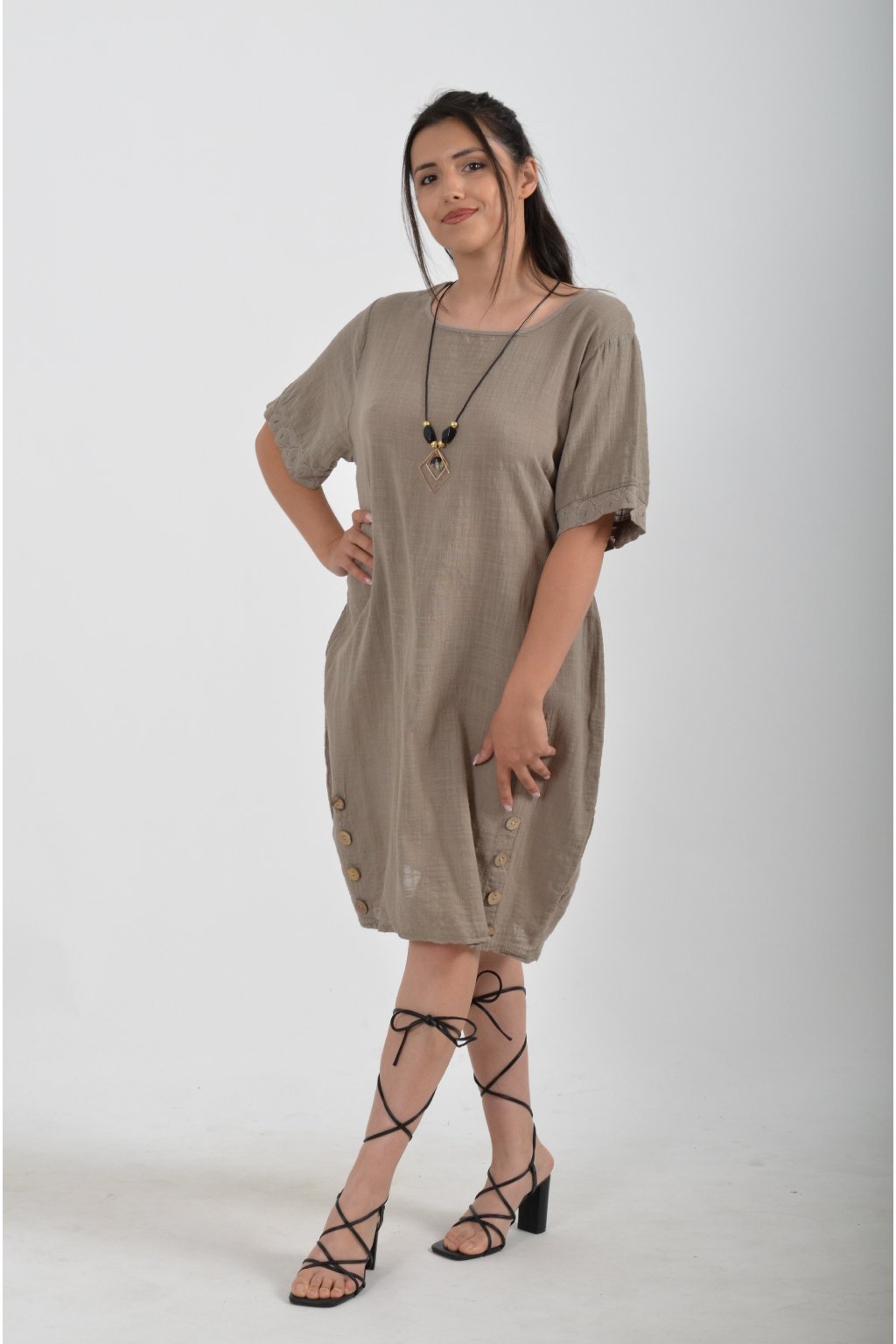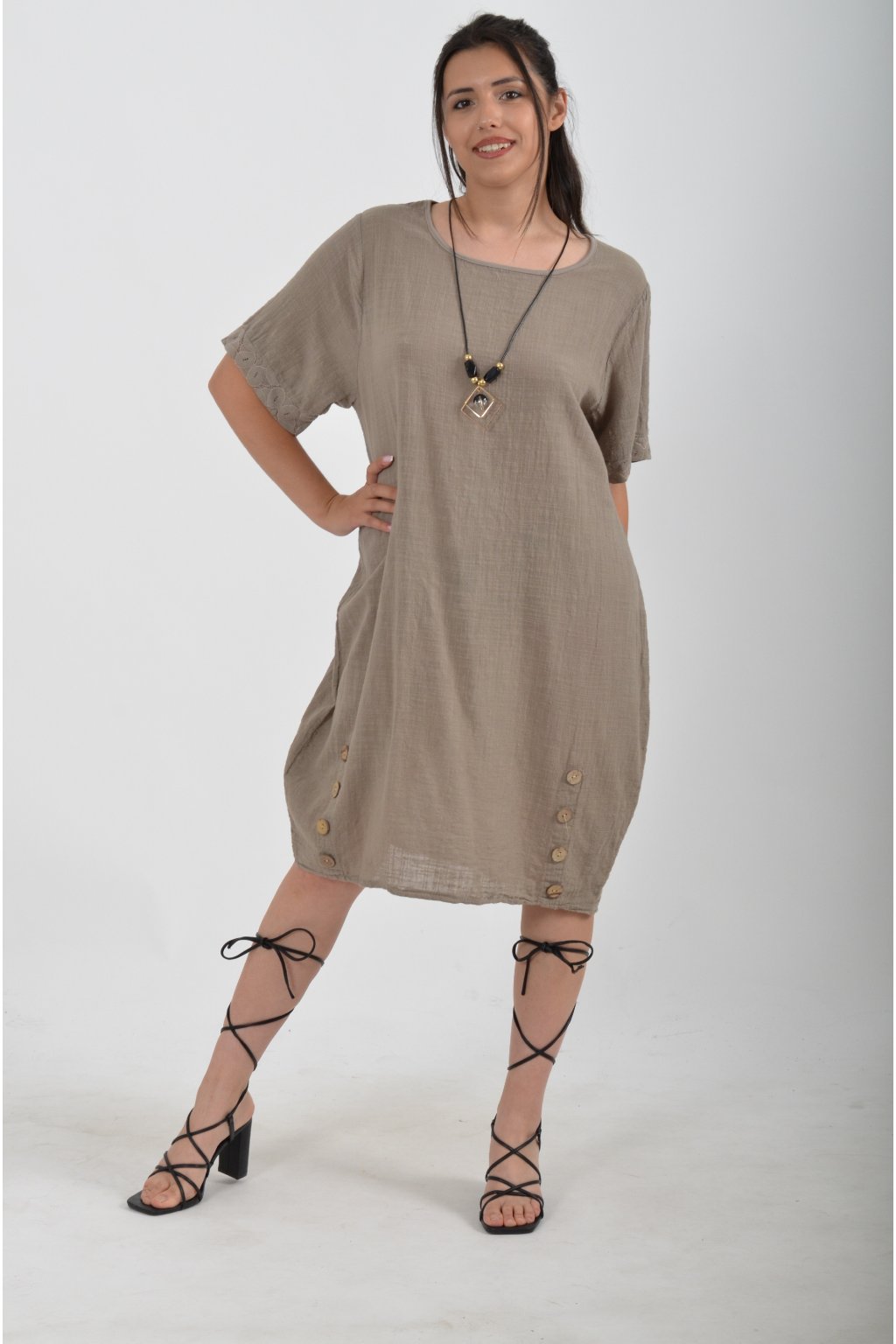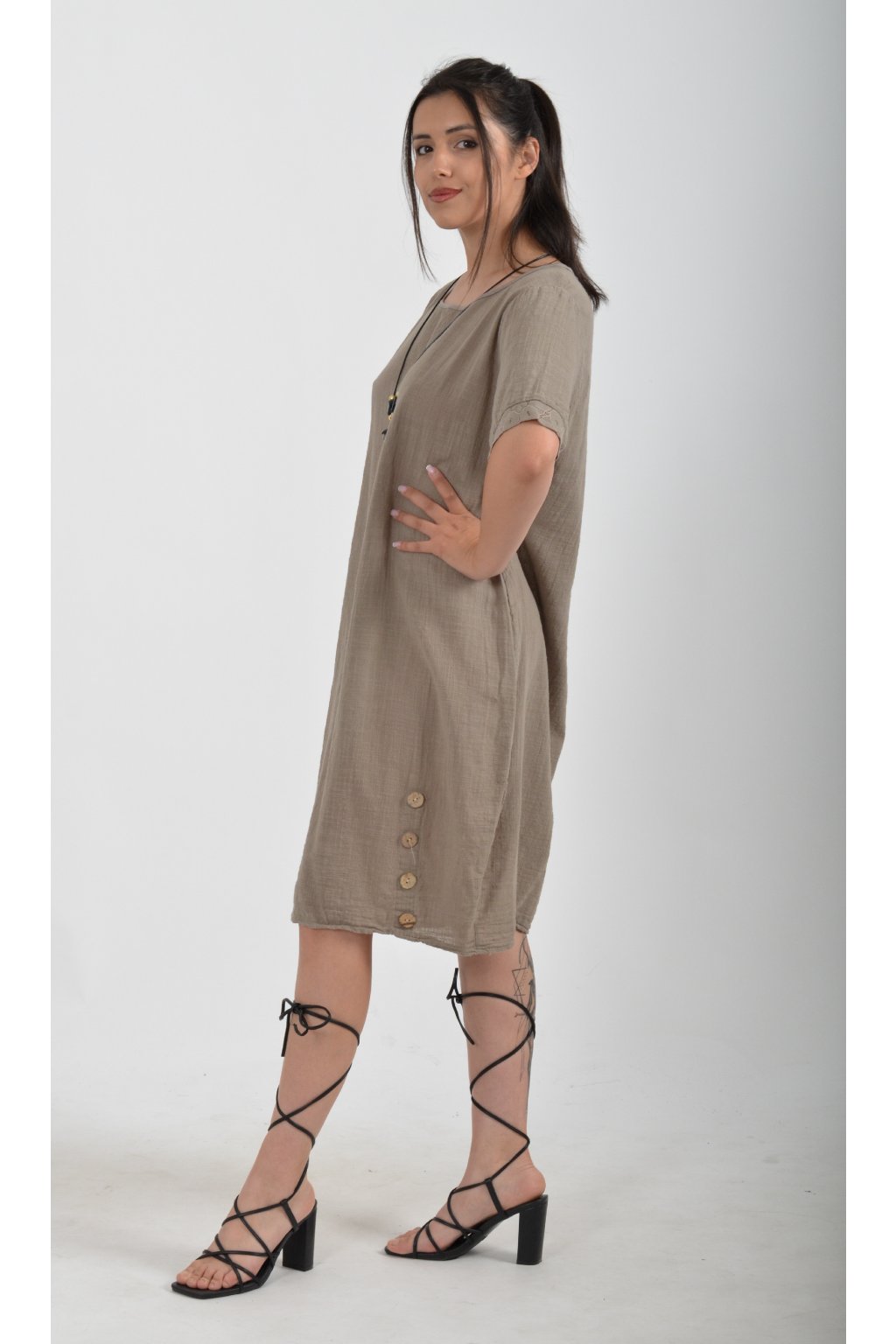 Bavlněné šaty s krátkým rukávem vyrobené z velice příjemné a jemné bavlny. V přední části mají ozdobné knoflíky, součástí šatů je náhrdelník jako dárek. Šaty nemají kapsy a jsou vhodné na každodenní letní nošení.