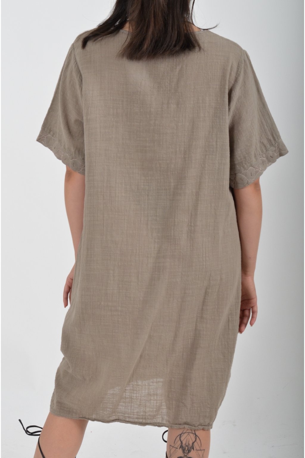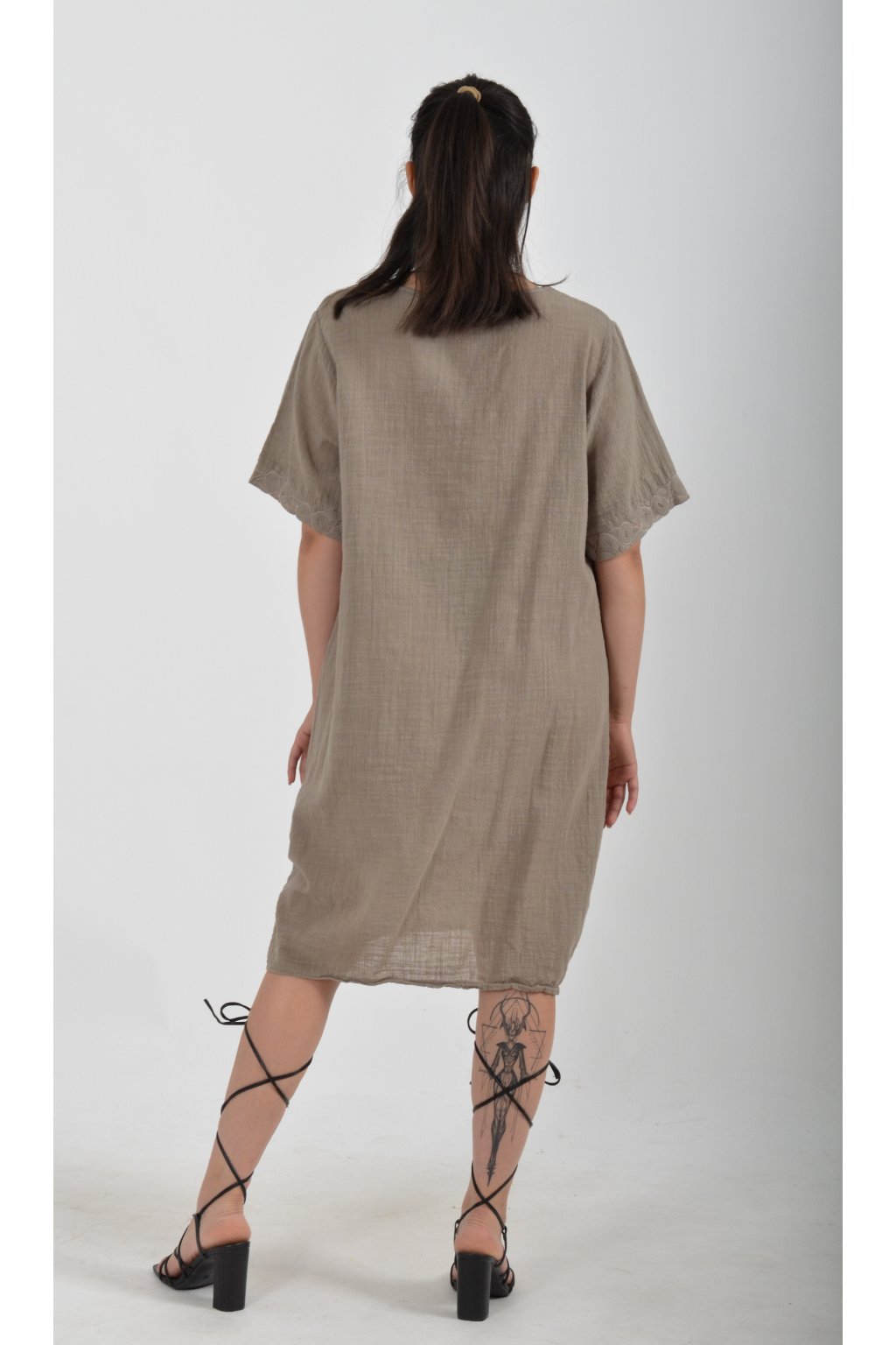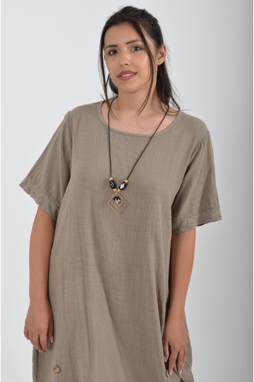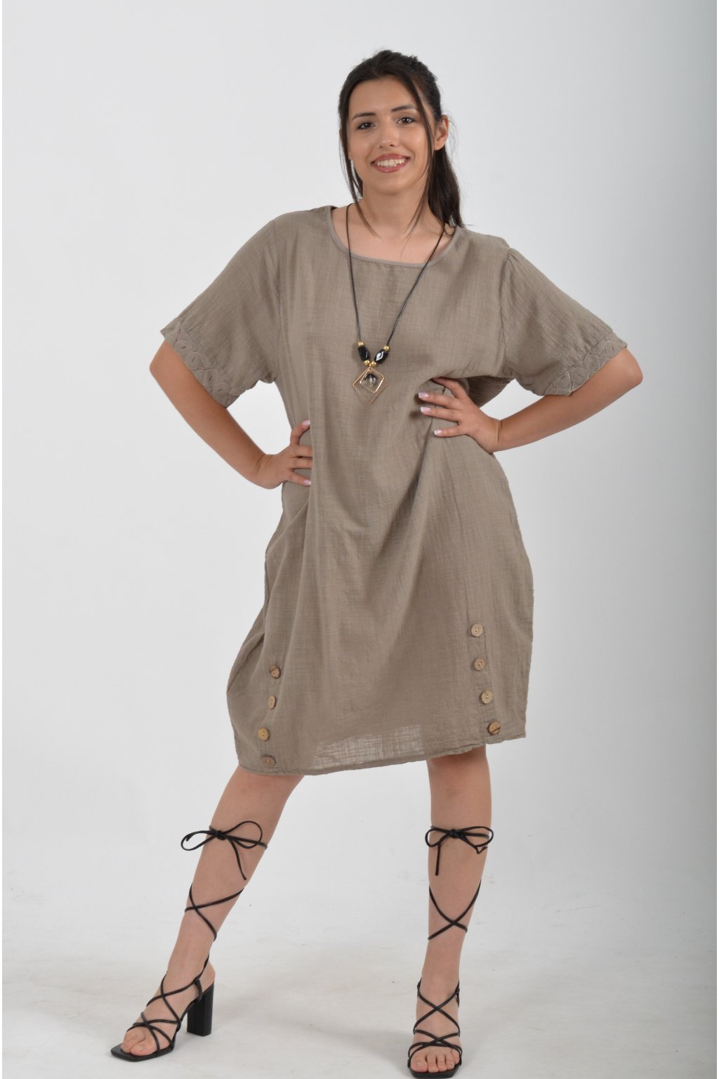 Bavlněné šaty s krátkým rukávem vyrobené z velice příjemné a jemné bavlny. V přední části mají ozdobné knoflíky, součástí šatů je náhrdelník jako dárek. Šaty nemají kapsy a jsou vhodné na každodenní letní nošení.